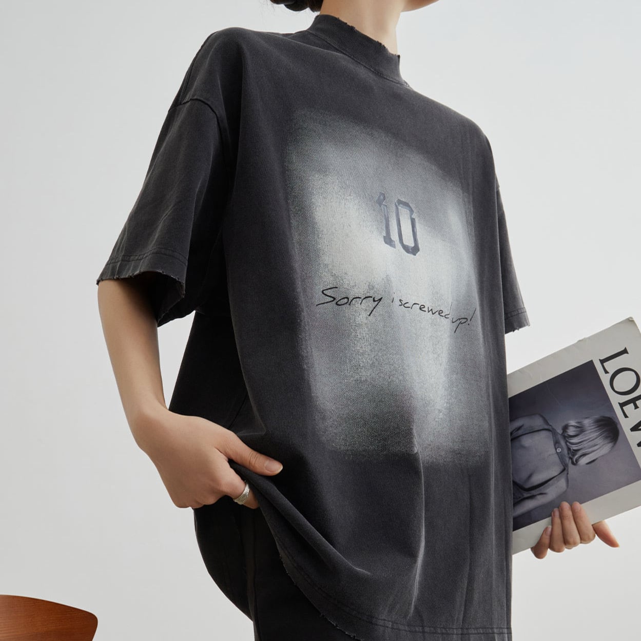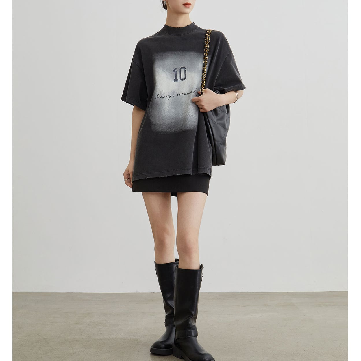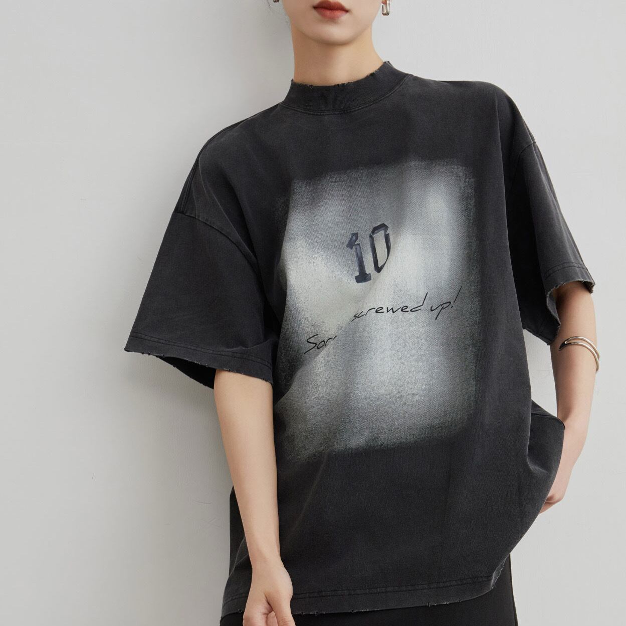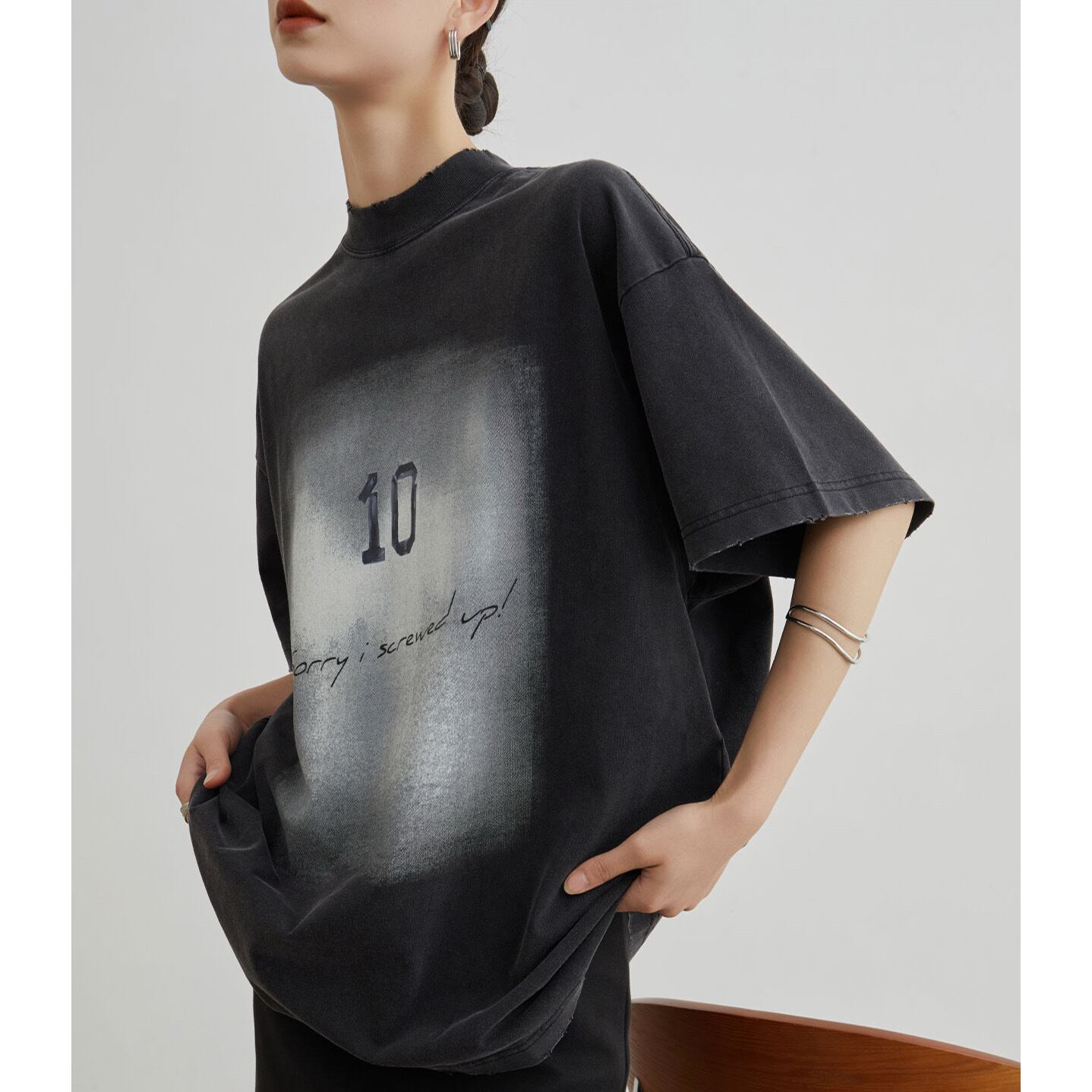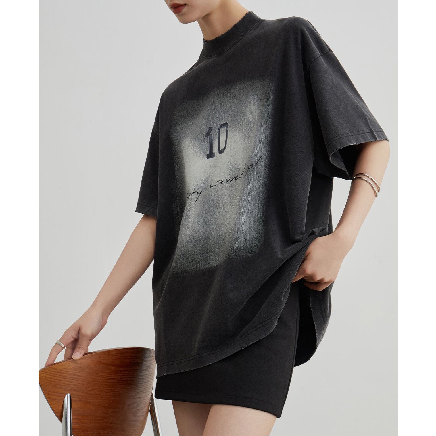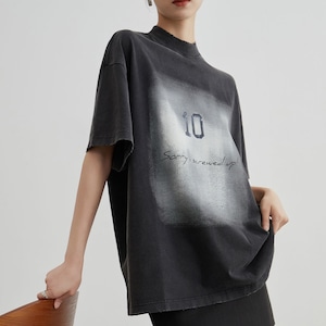 古着のような風合いの加工が施されたオーバーサイズTシャツのフロントには、かすれたグラフィックプリントを施し、一枚で主役級の存在感を放ちます。