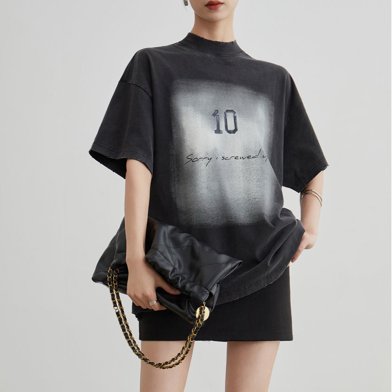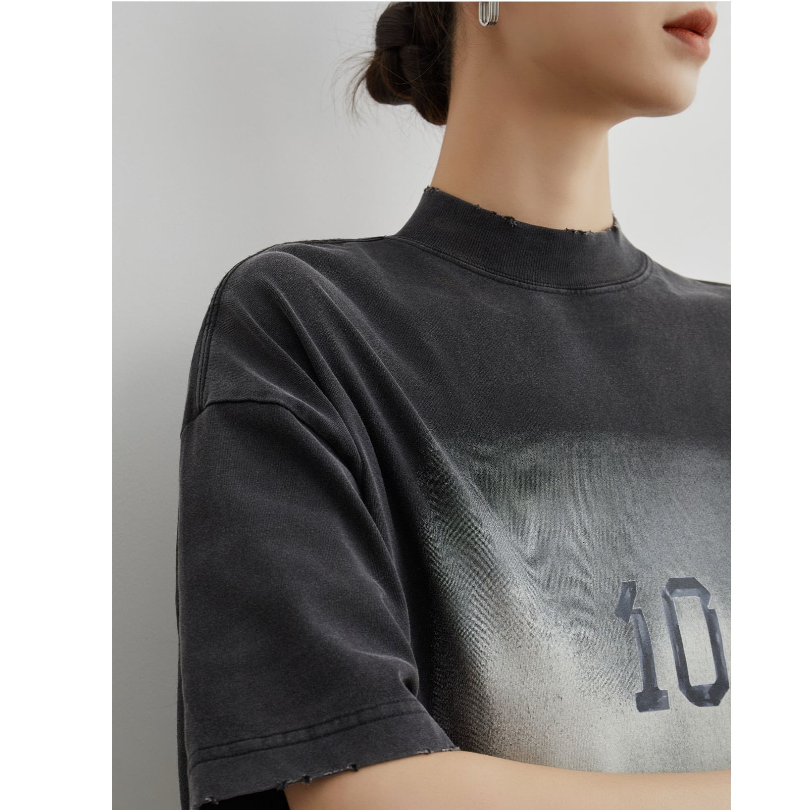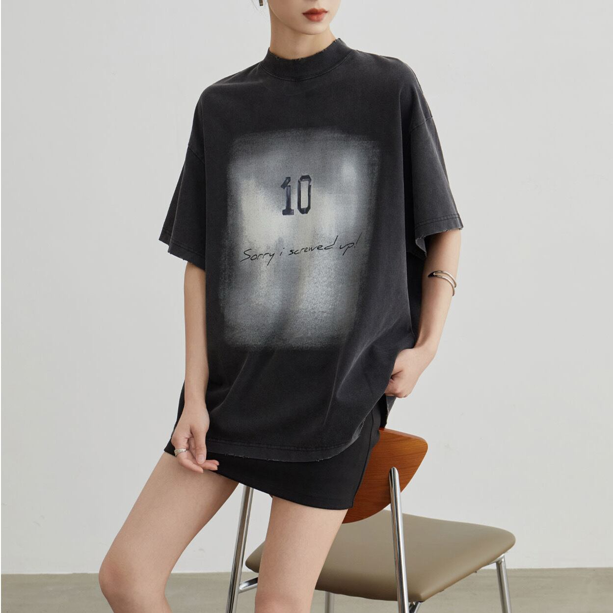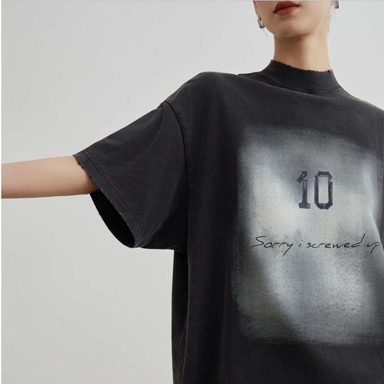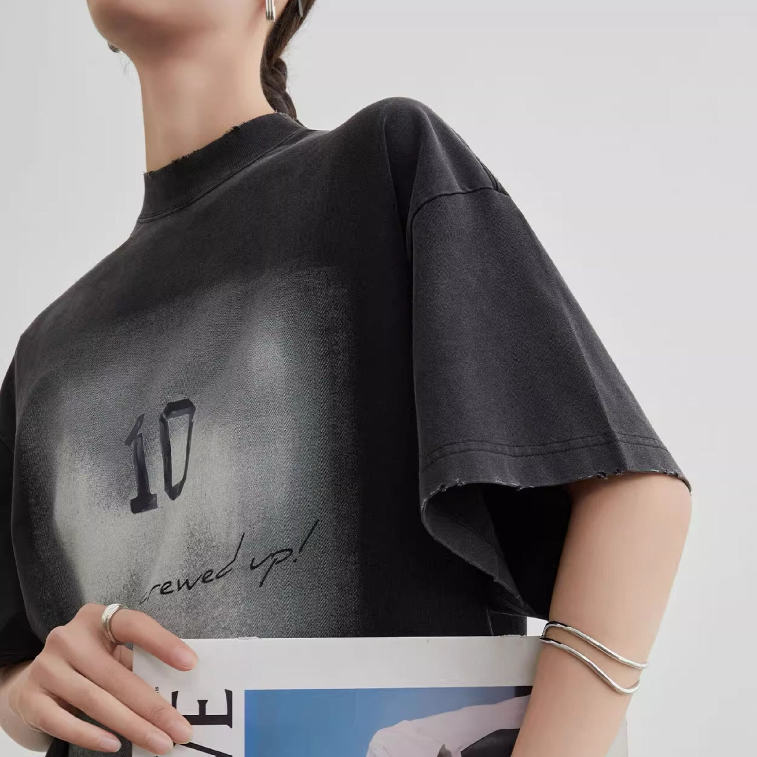 古着のような風合いの加工が施されたオーバーサイズTシャツのフロントには、かすれたグラフィックプリントを施し、一枚で主役級の存在感を放ちます。