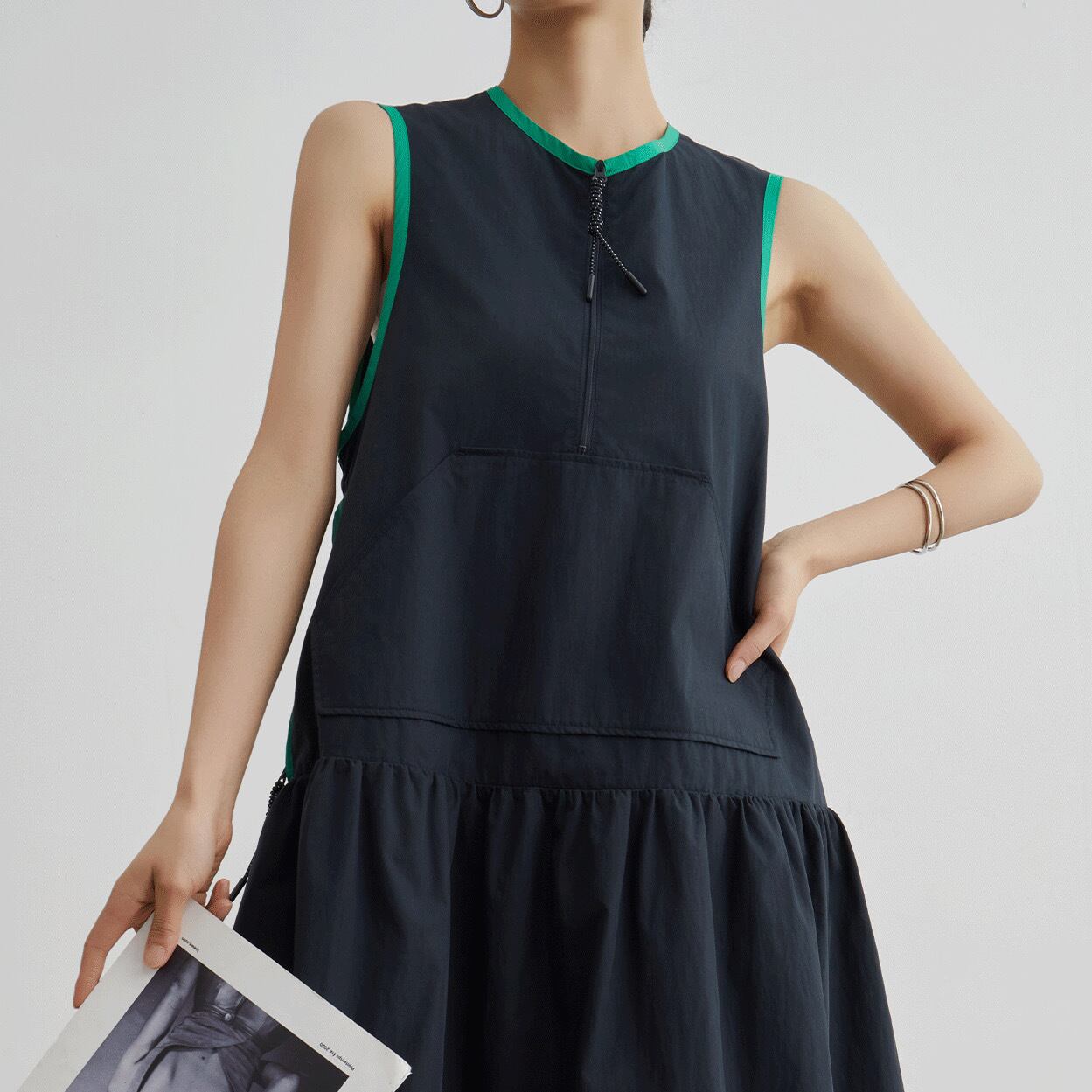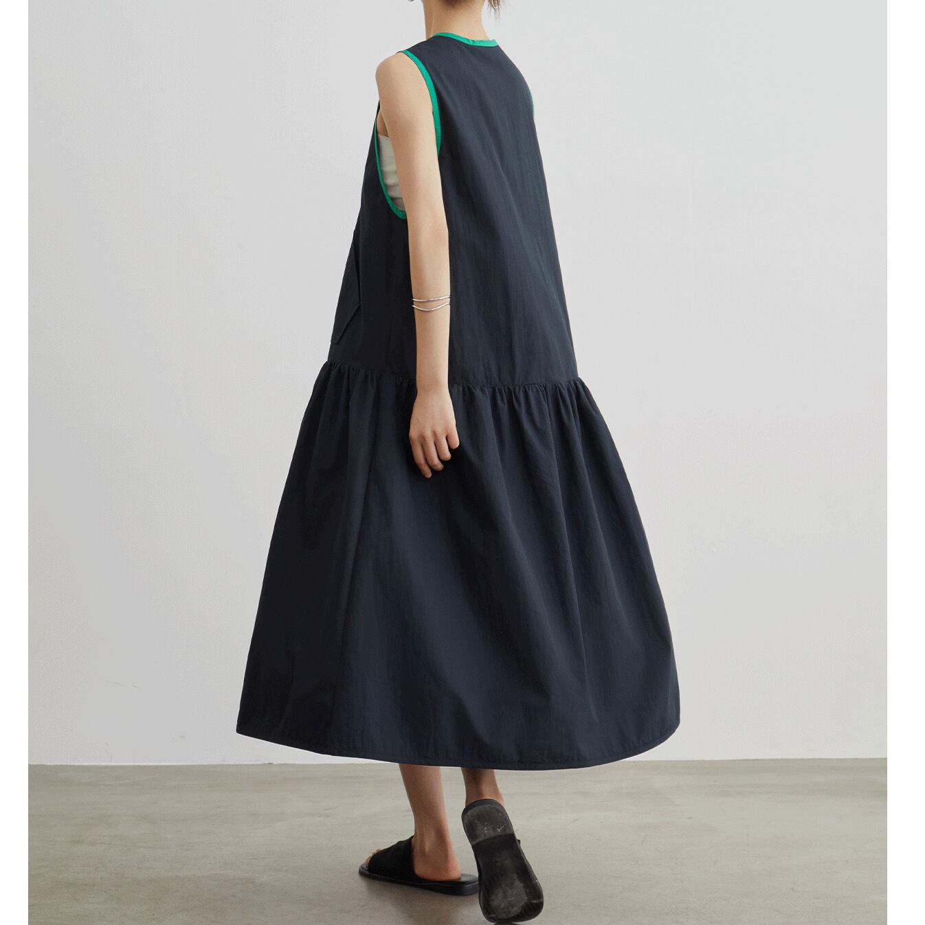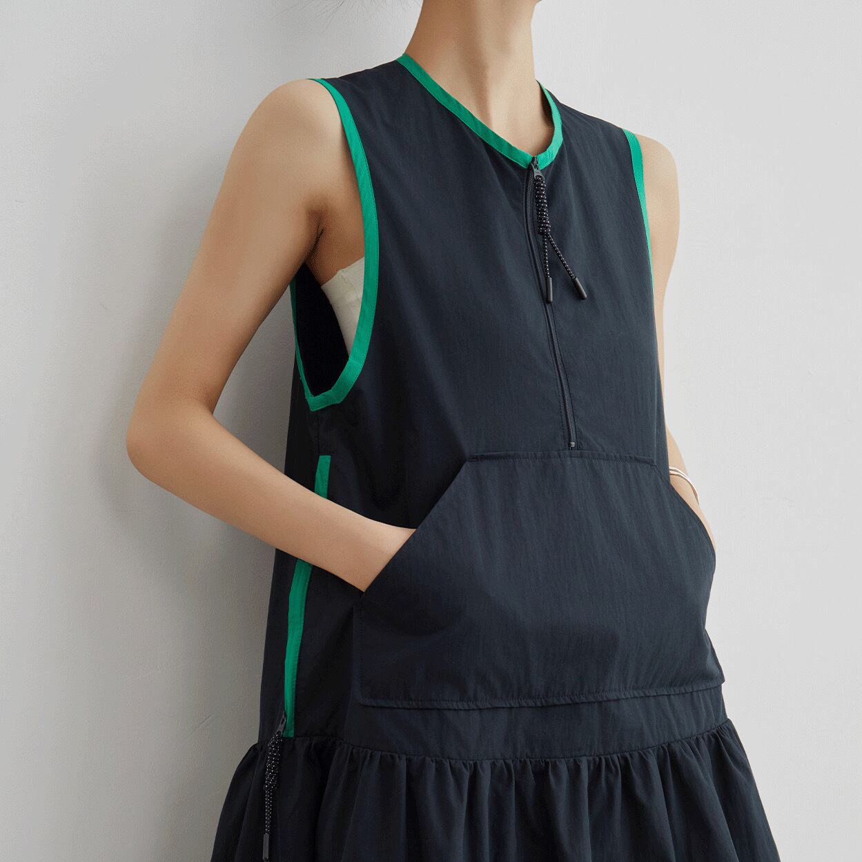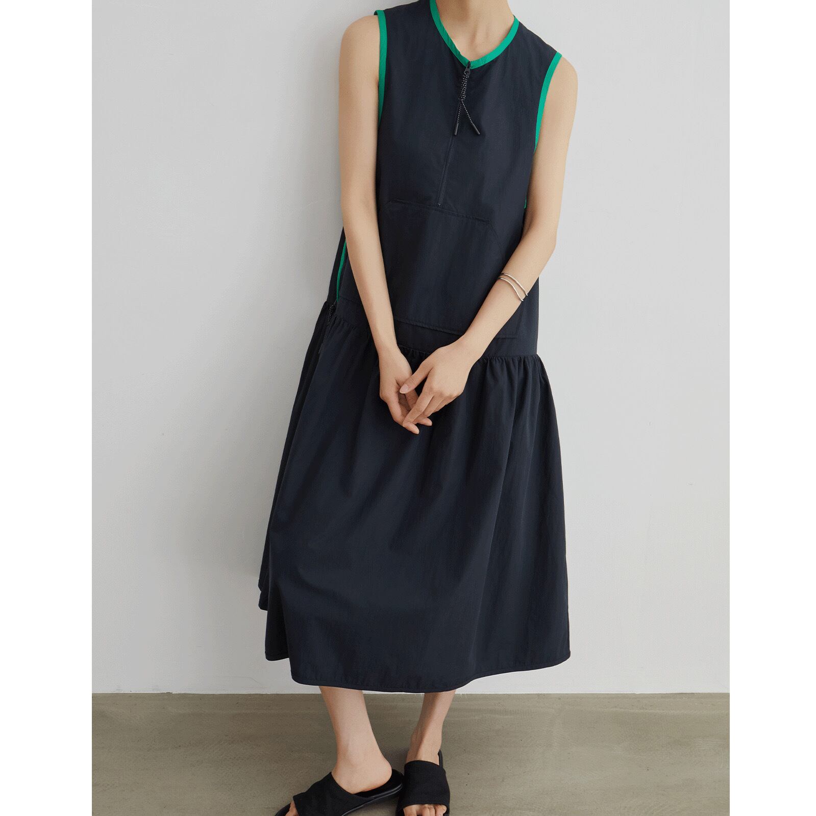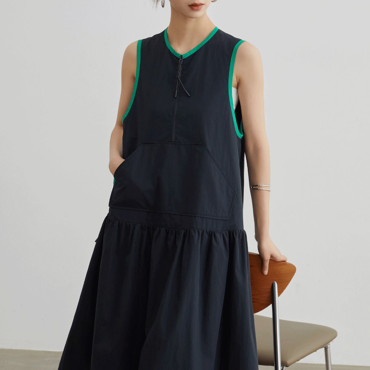クリーンなブラックに、鮮やかなグリーンのパイピングがアクセントになったノースリーブワンピースです。シンプルなデザインながら、胸元のポケットやギャザーを寄せた切り替えが、遊び心と立体感をプラスしています。