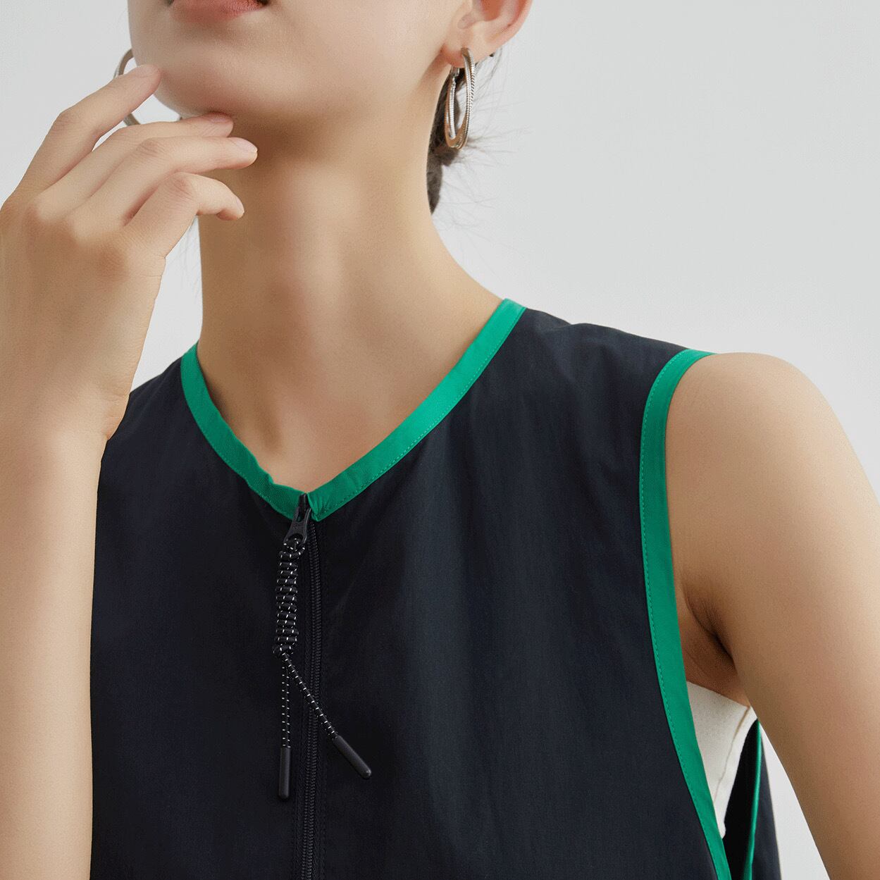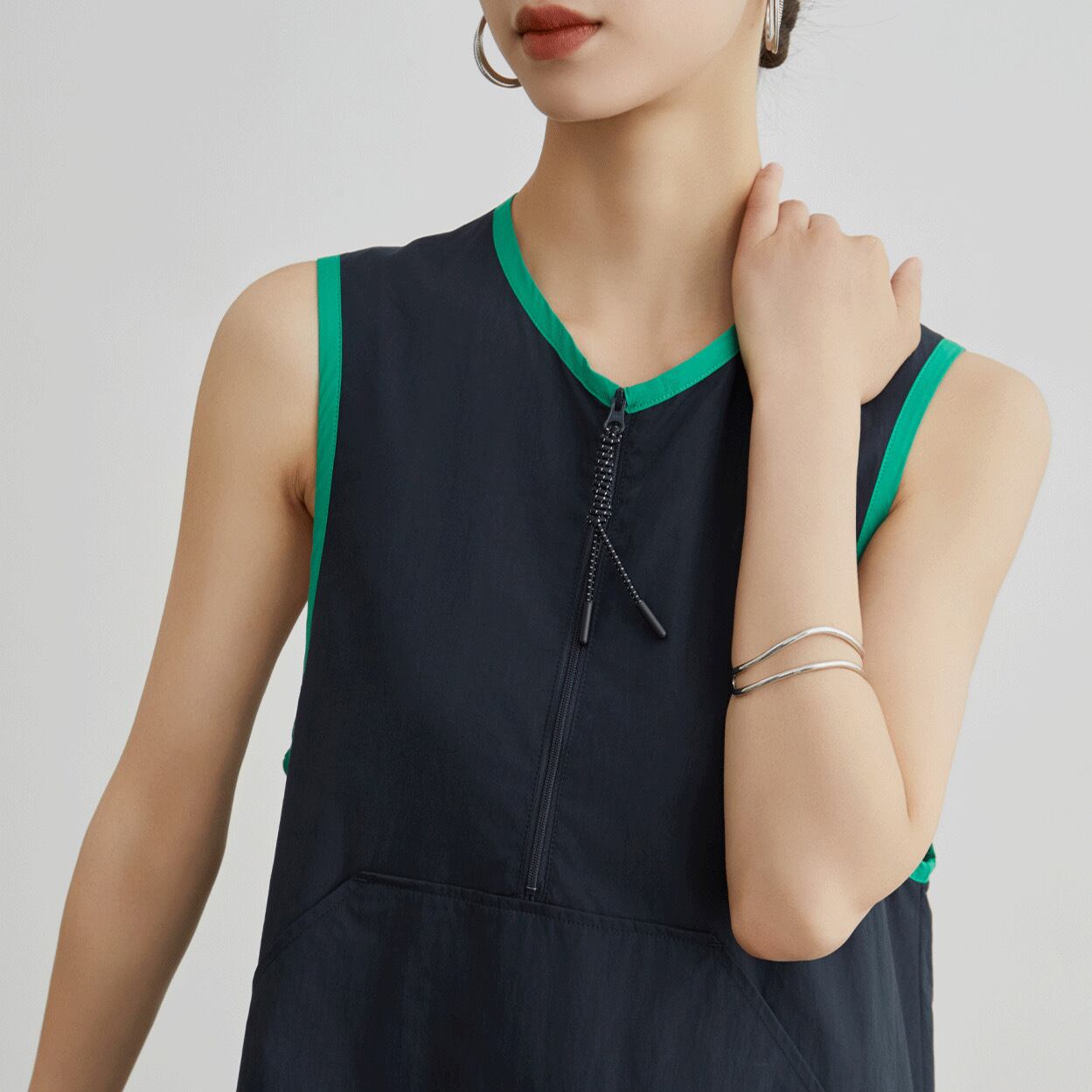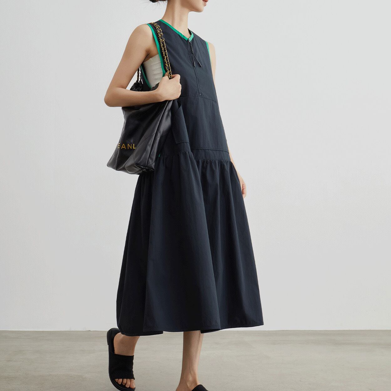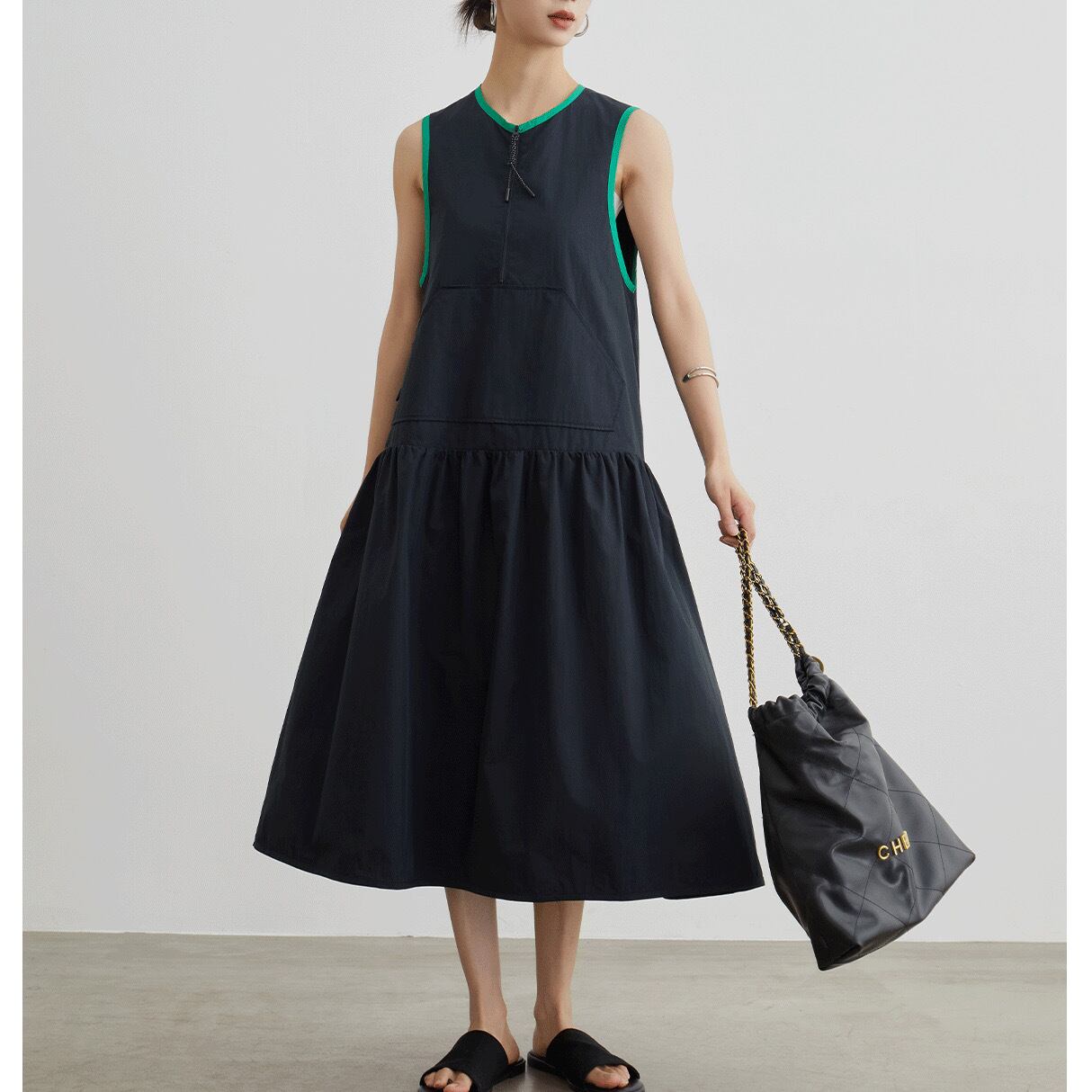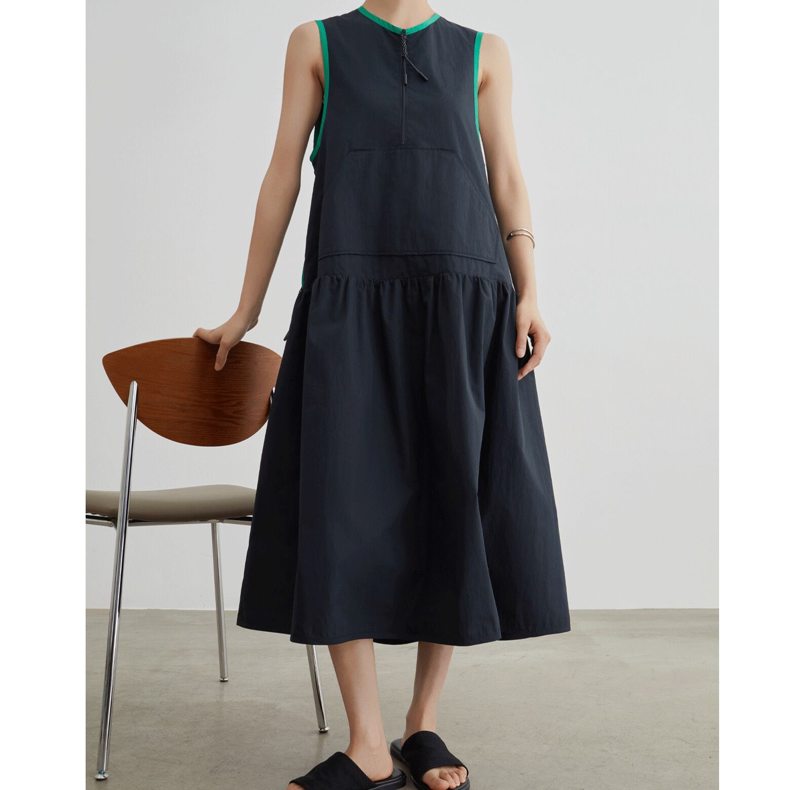 クリーンなブラックに、鮮やかなグリーンのパイピングがアクセントになったノースリーブワンピースです。シンプルなデザインながら、胸元のポケットやギャザーを寄せた切り替えが、遊び心と立体感をプラスしています。