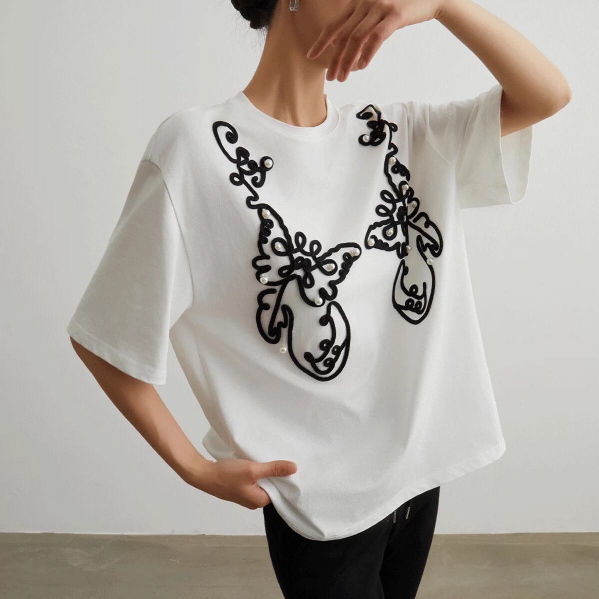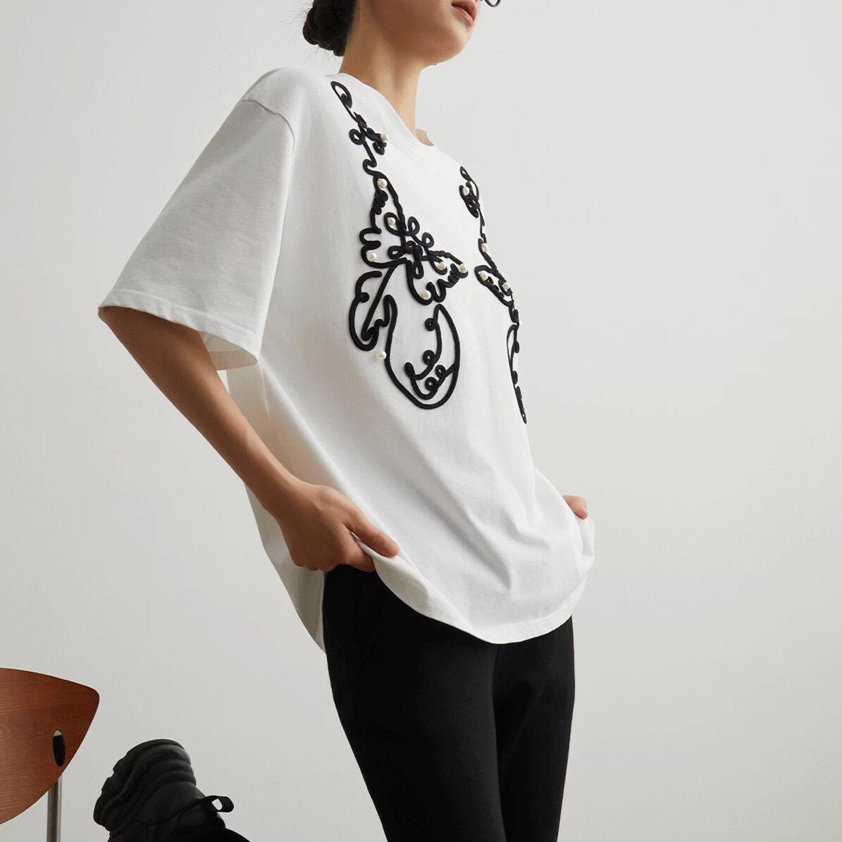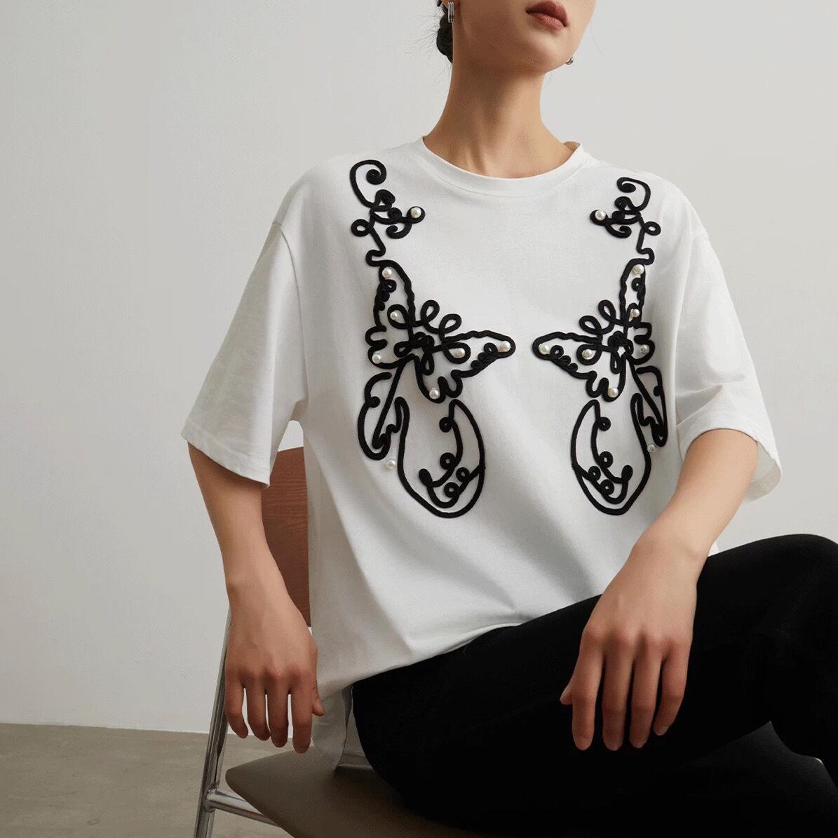 シンプルな白Tシャツに、黒のコード刺繍とパールをあしらった、エレガントなデザインTシャツです。大胆な曲線で描かれたアートのような刺繍が、一枚で着るだけで存在感を放ちます。