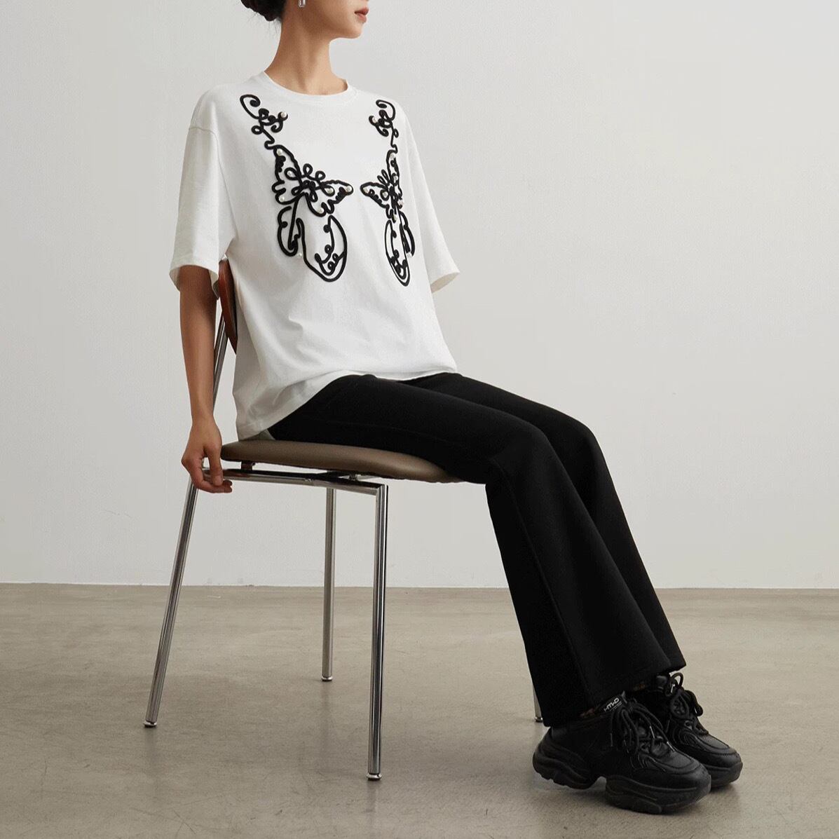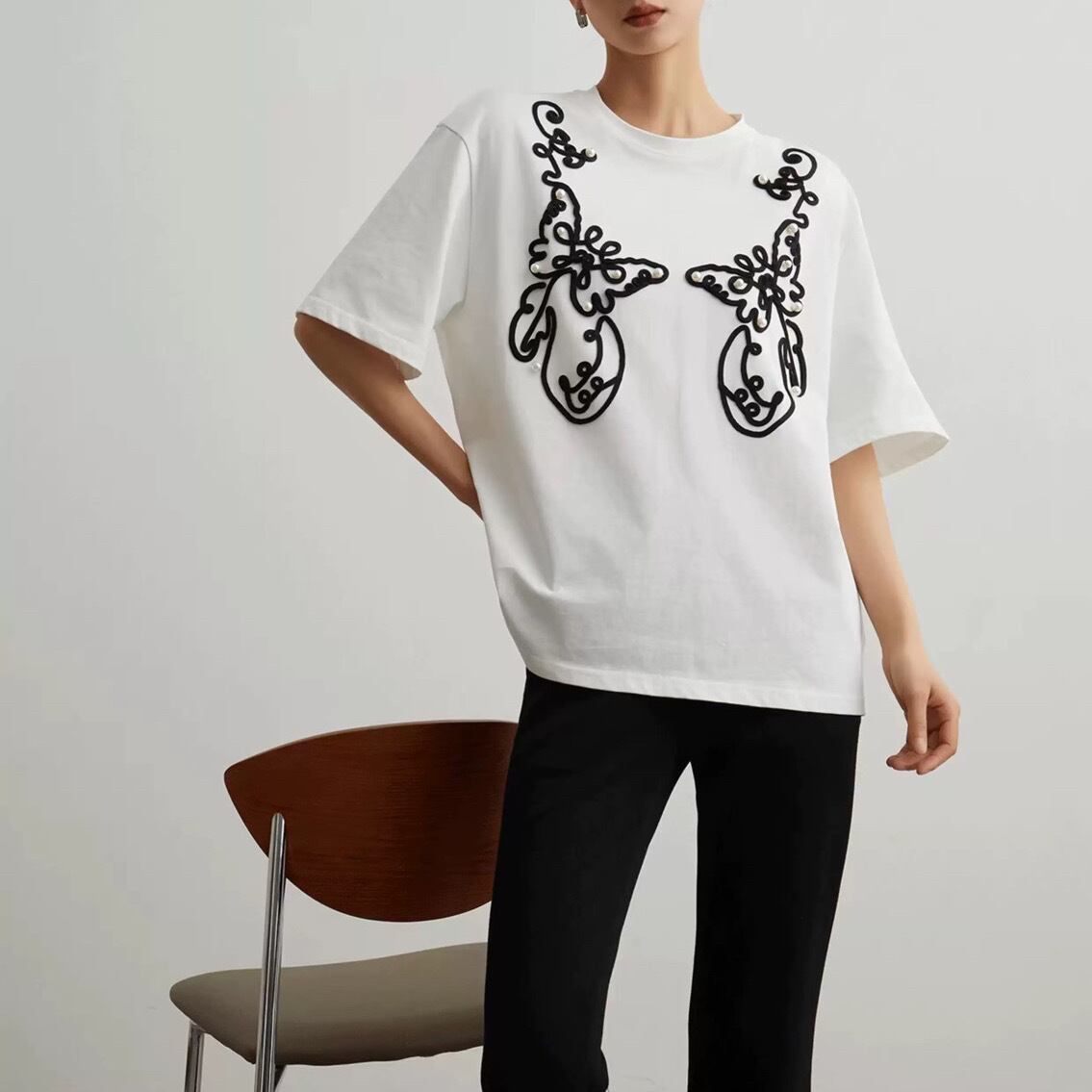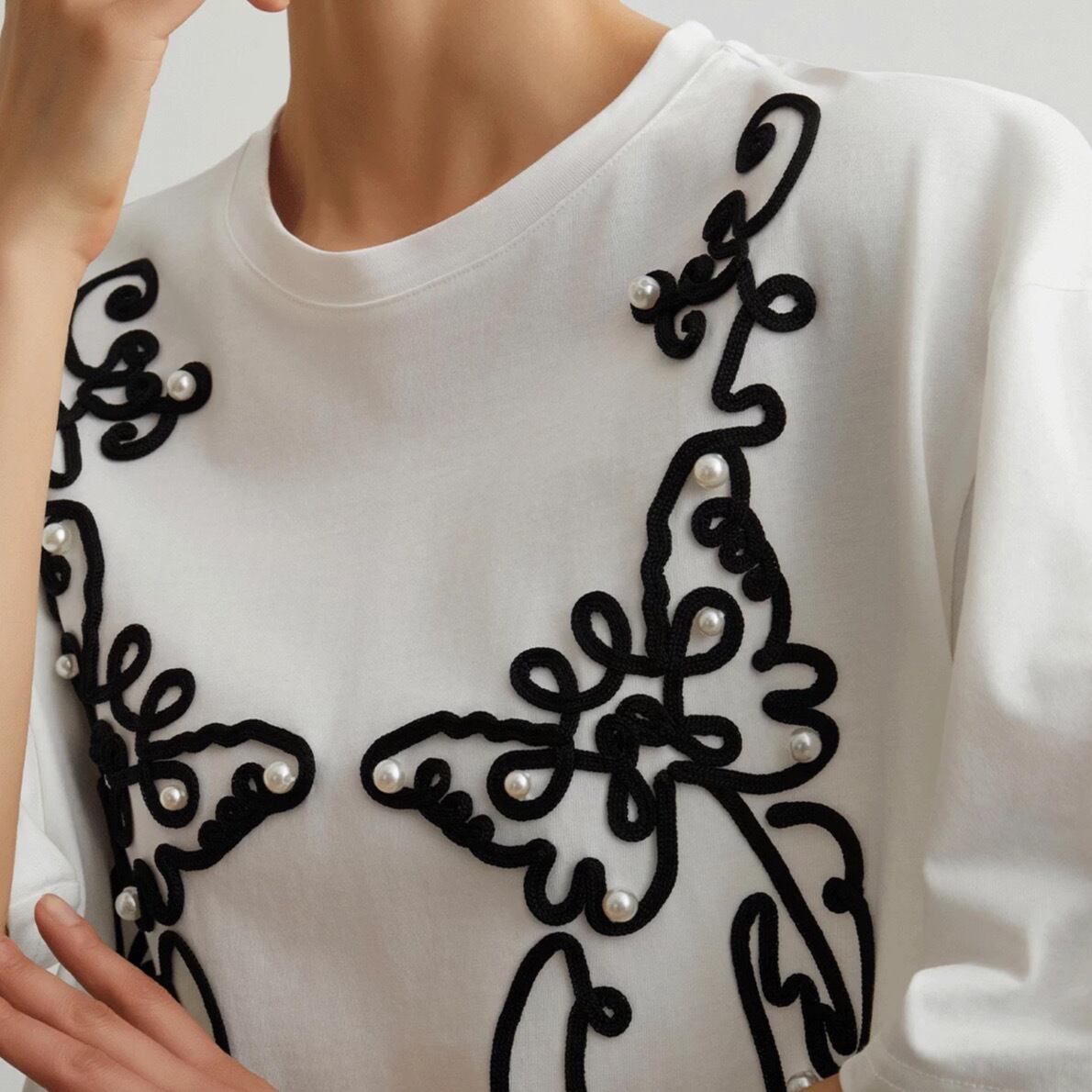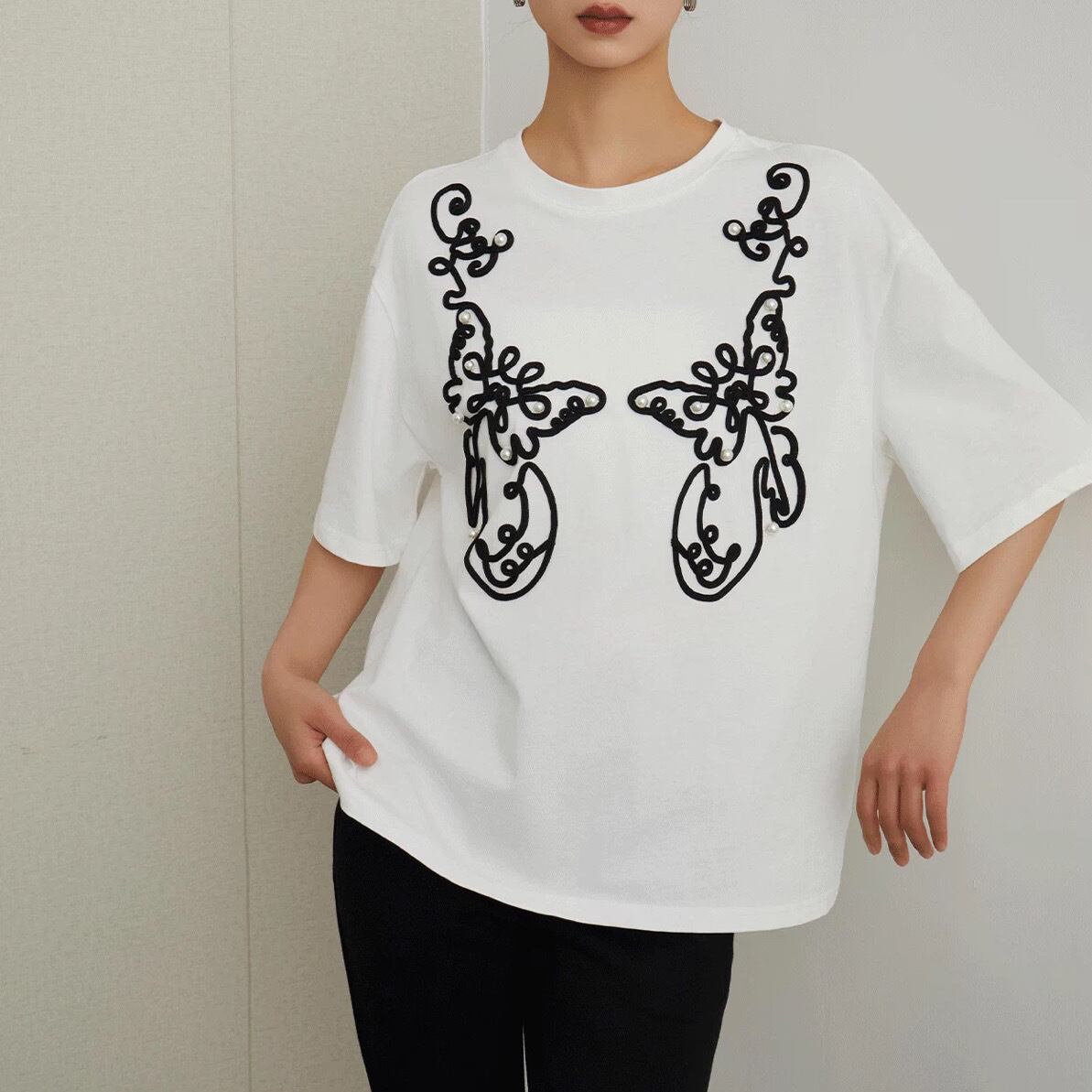 シンプルな白Tシャツに、黒のコード刺繍とパールをあしらった、エレガントなデザインTシャツです。大胆な曲線で描かれたアートのような刺繍が、一枚で着るだけで存在感を放ちます。