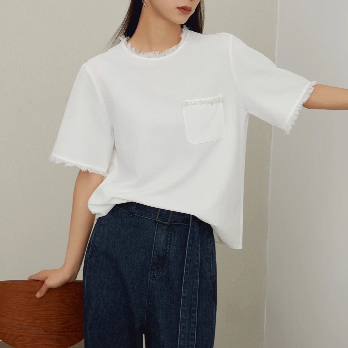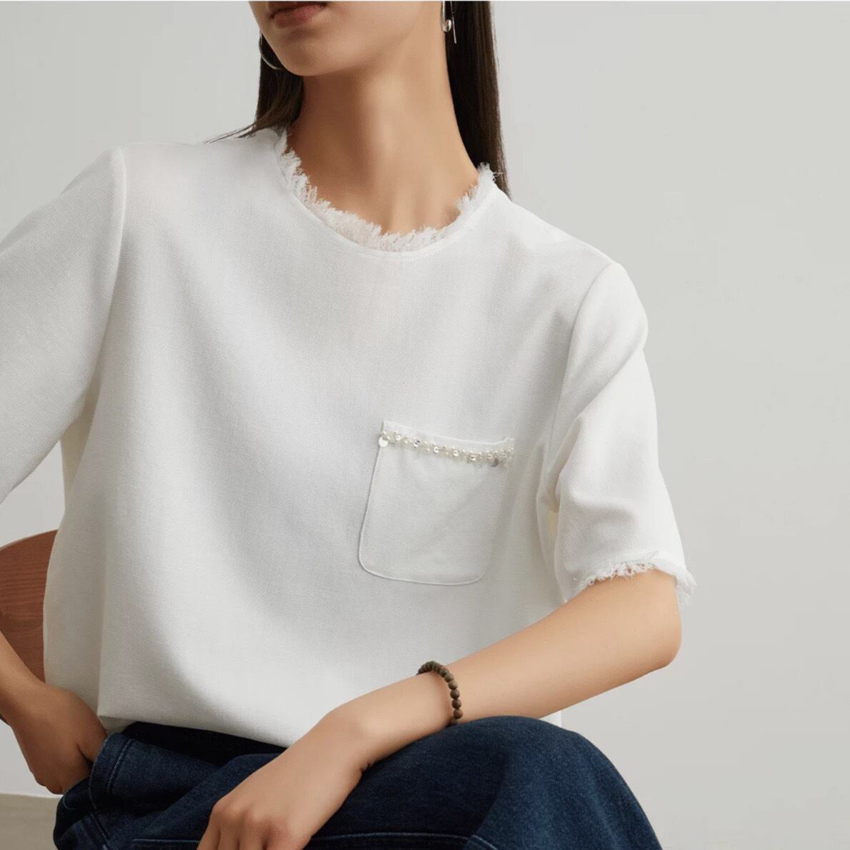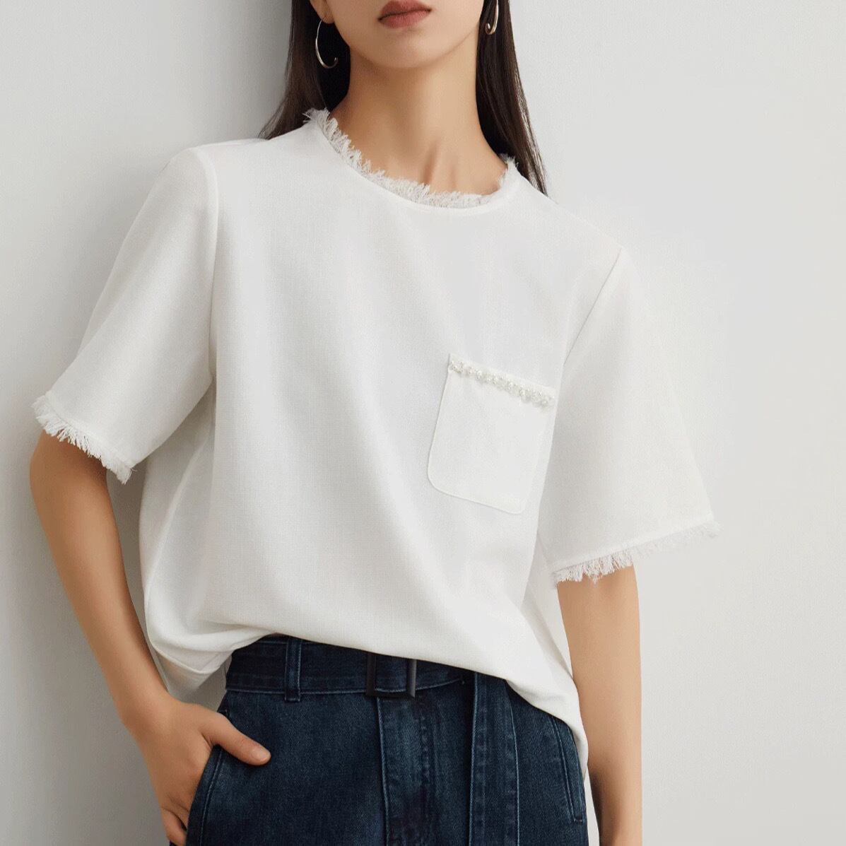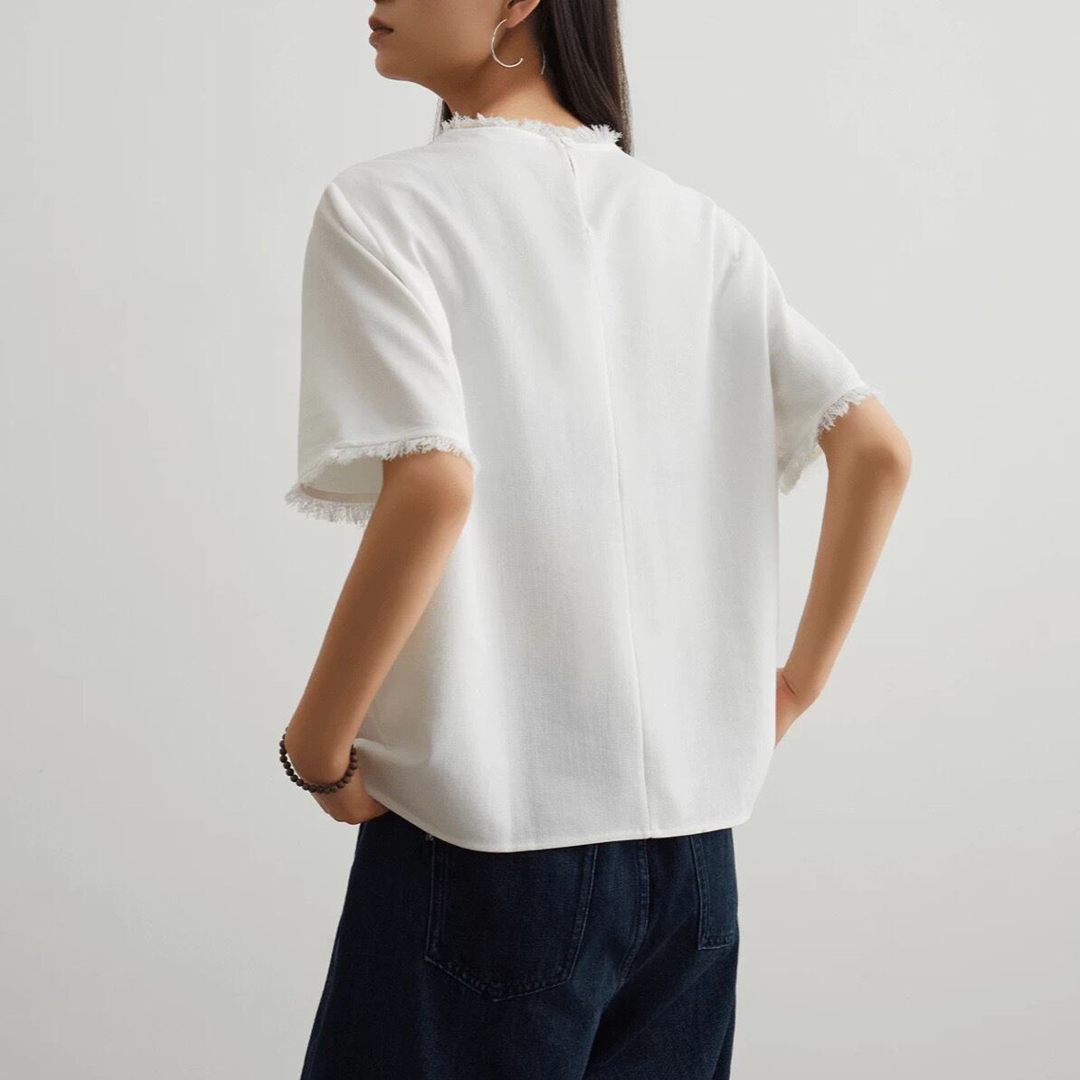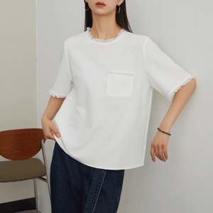 シンプルなTシャツに、襟元や袖口に施されたフリンジ加工がアクセントになったトップスです。