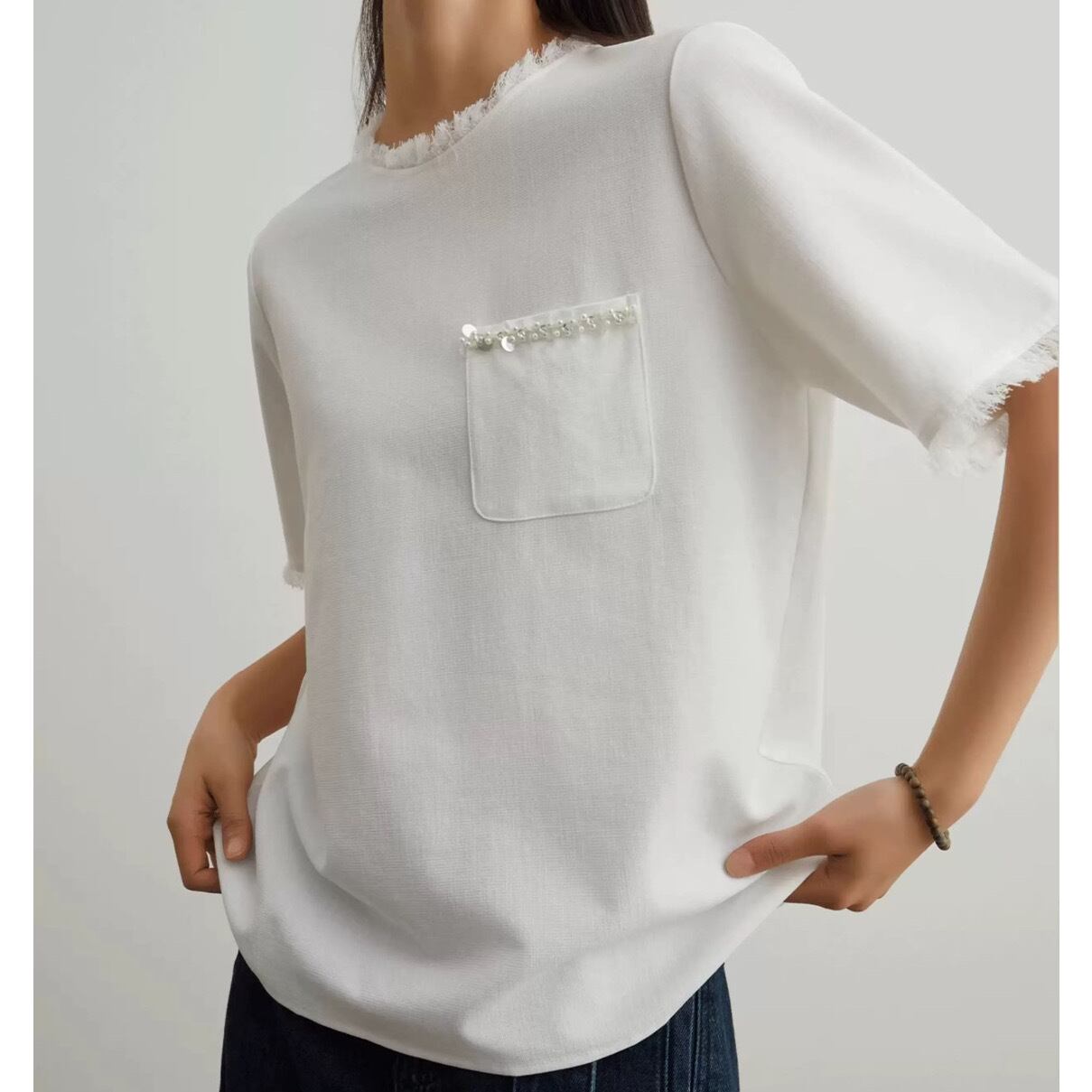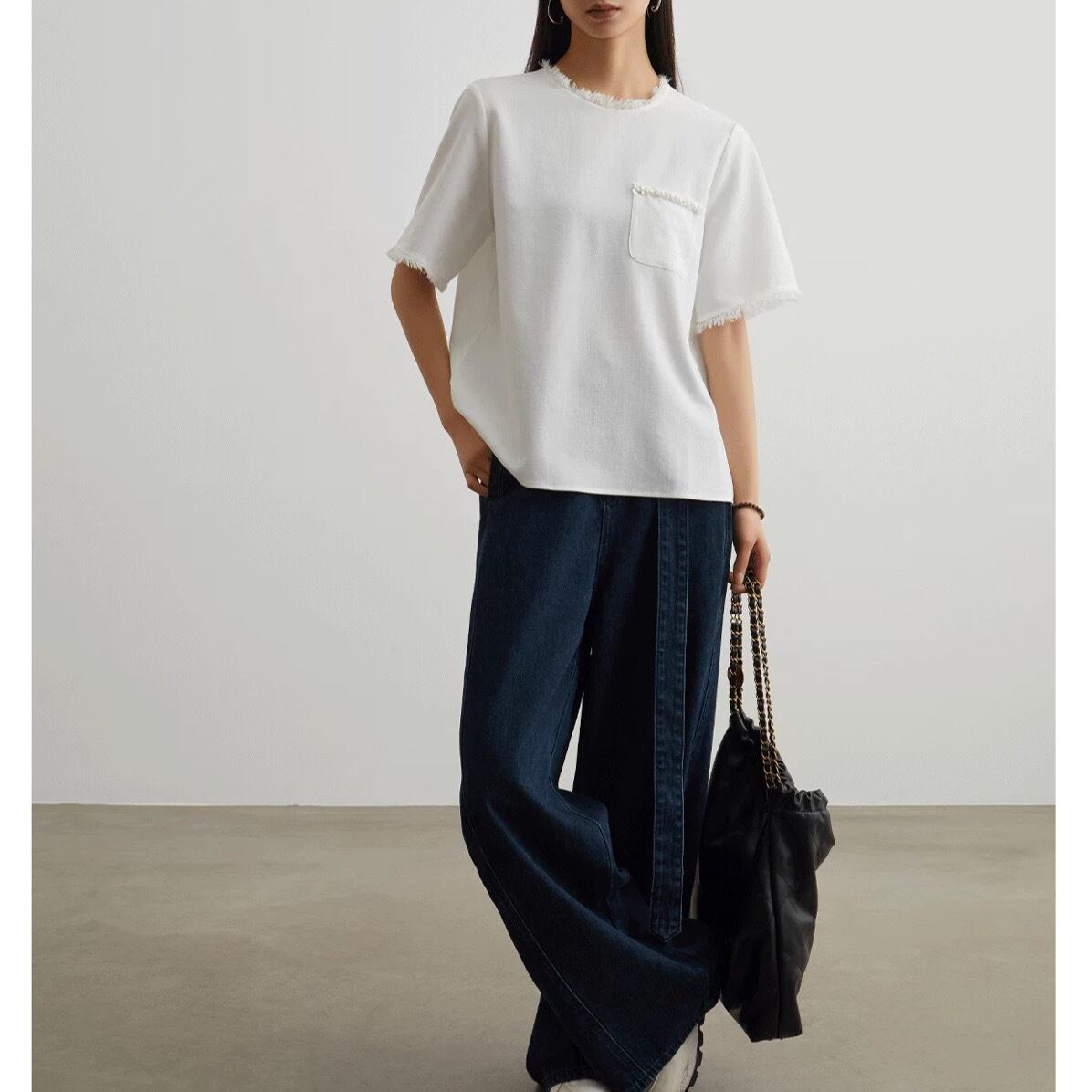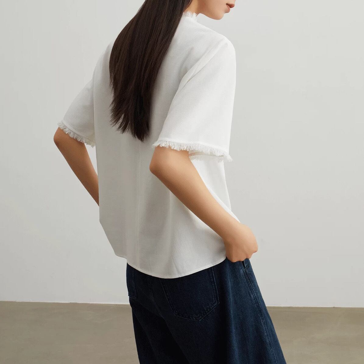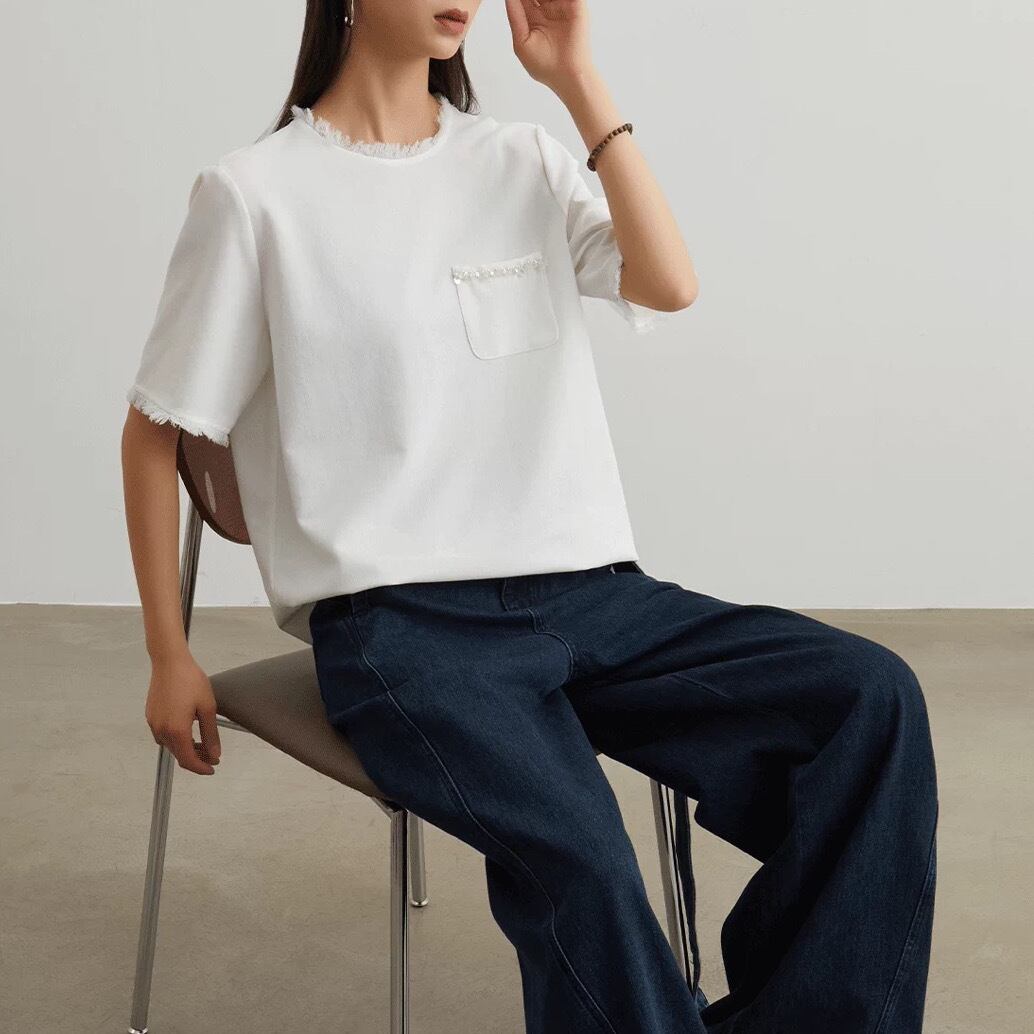 シンプルなTシャツに、襟元や袖口に施されたフリンジ加工がアクセントになったトップスです。