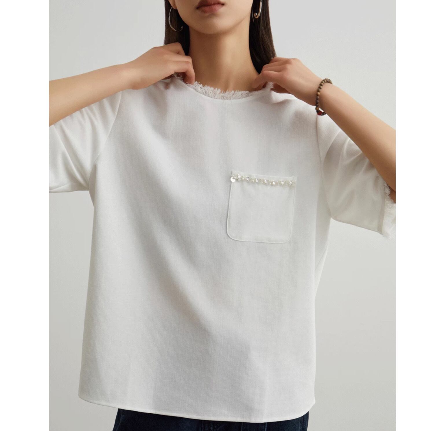 胸元には、パールが施されたポケットを配し、さりげない個性をプラス。リラックス感のある着心地と、こなれた雰囲気を両立させます。