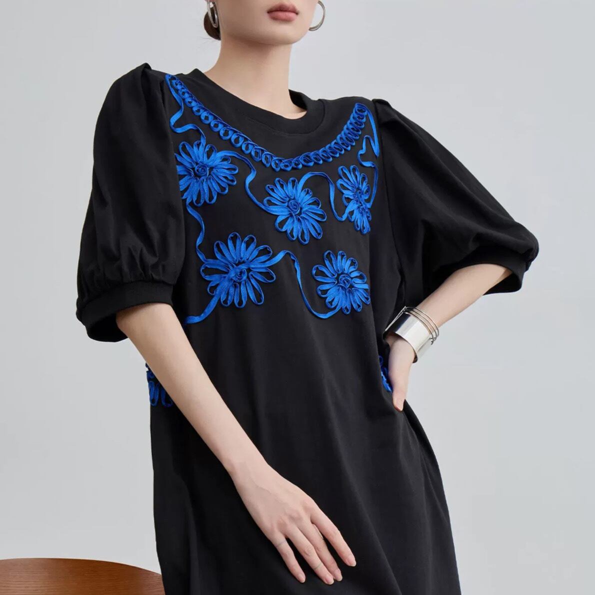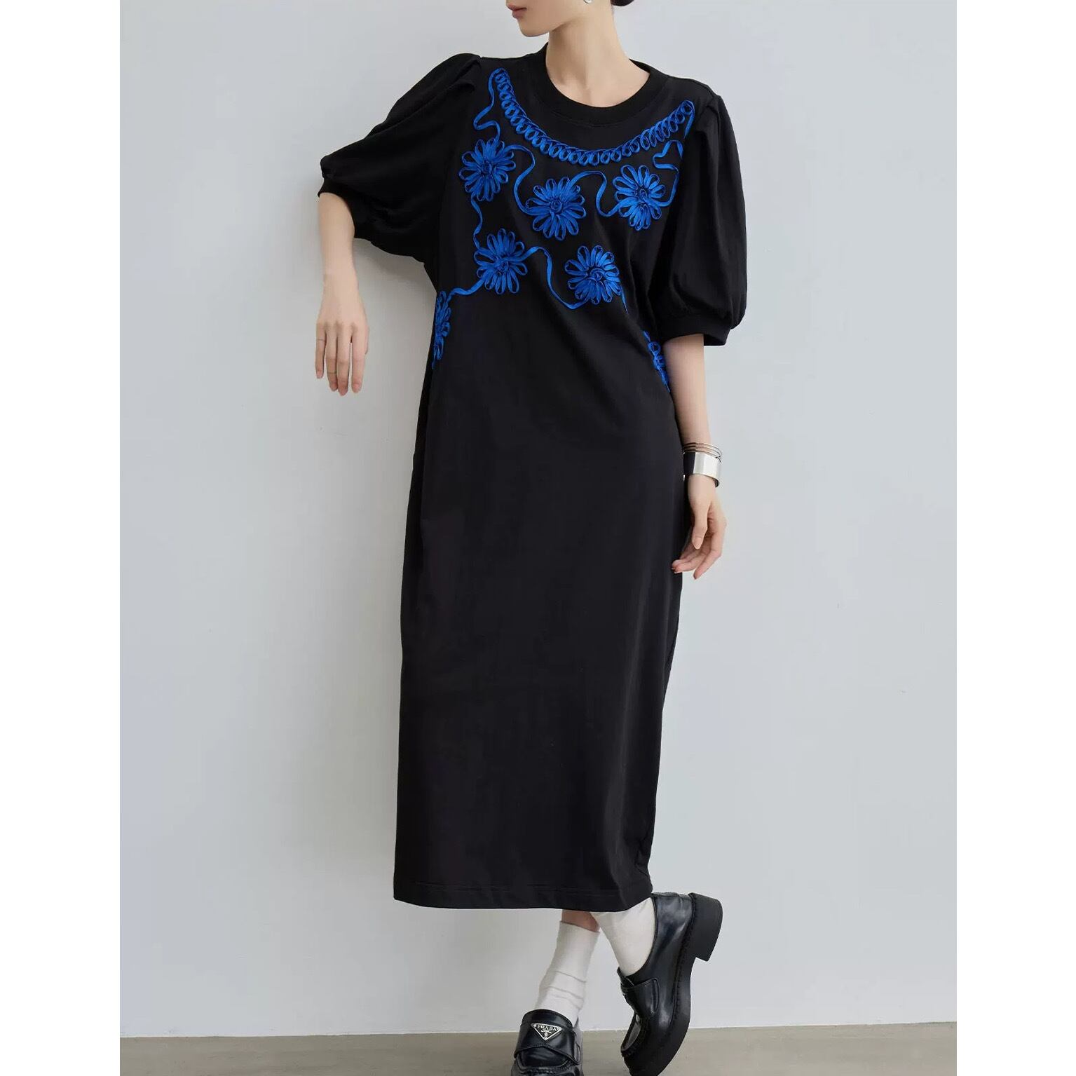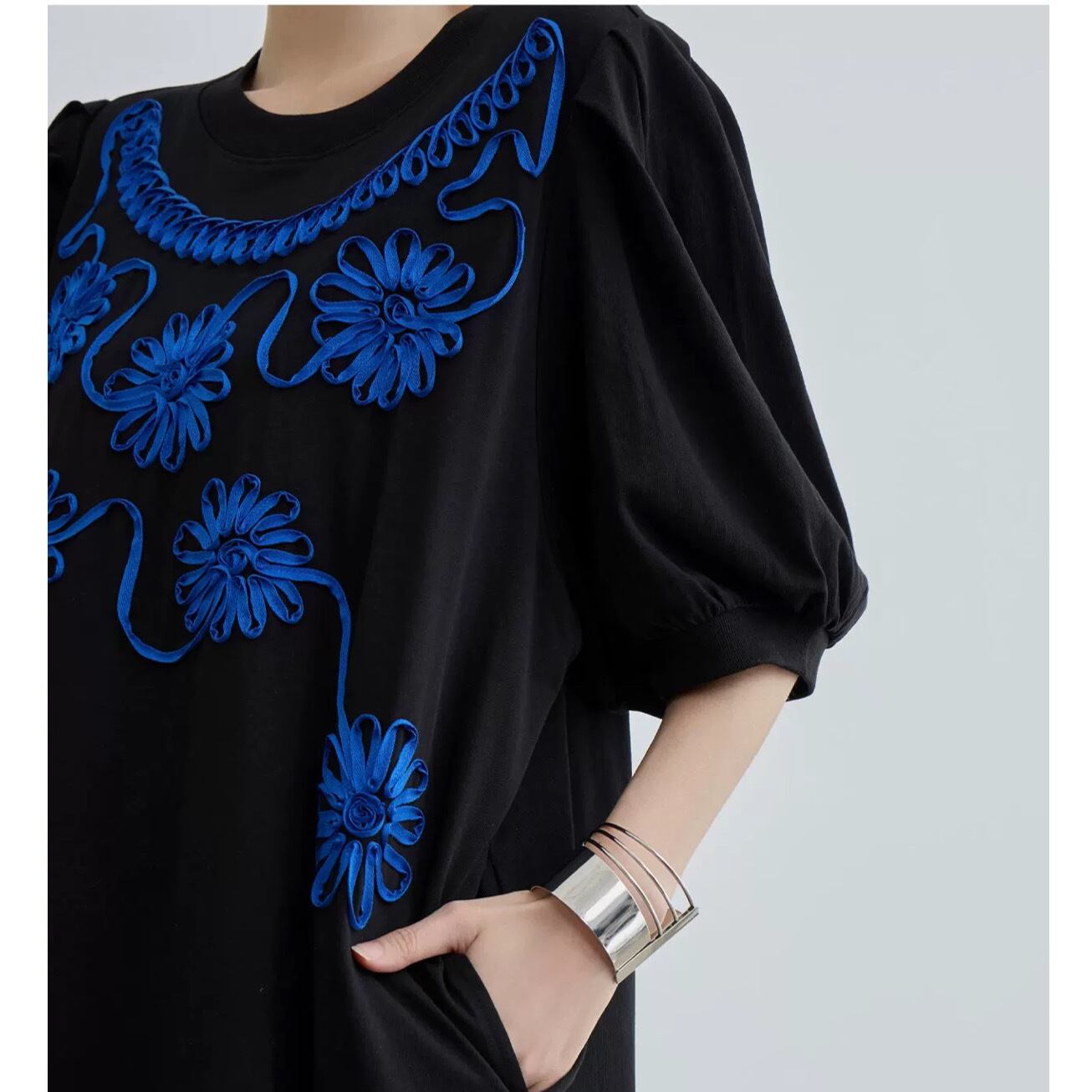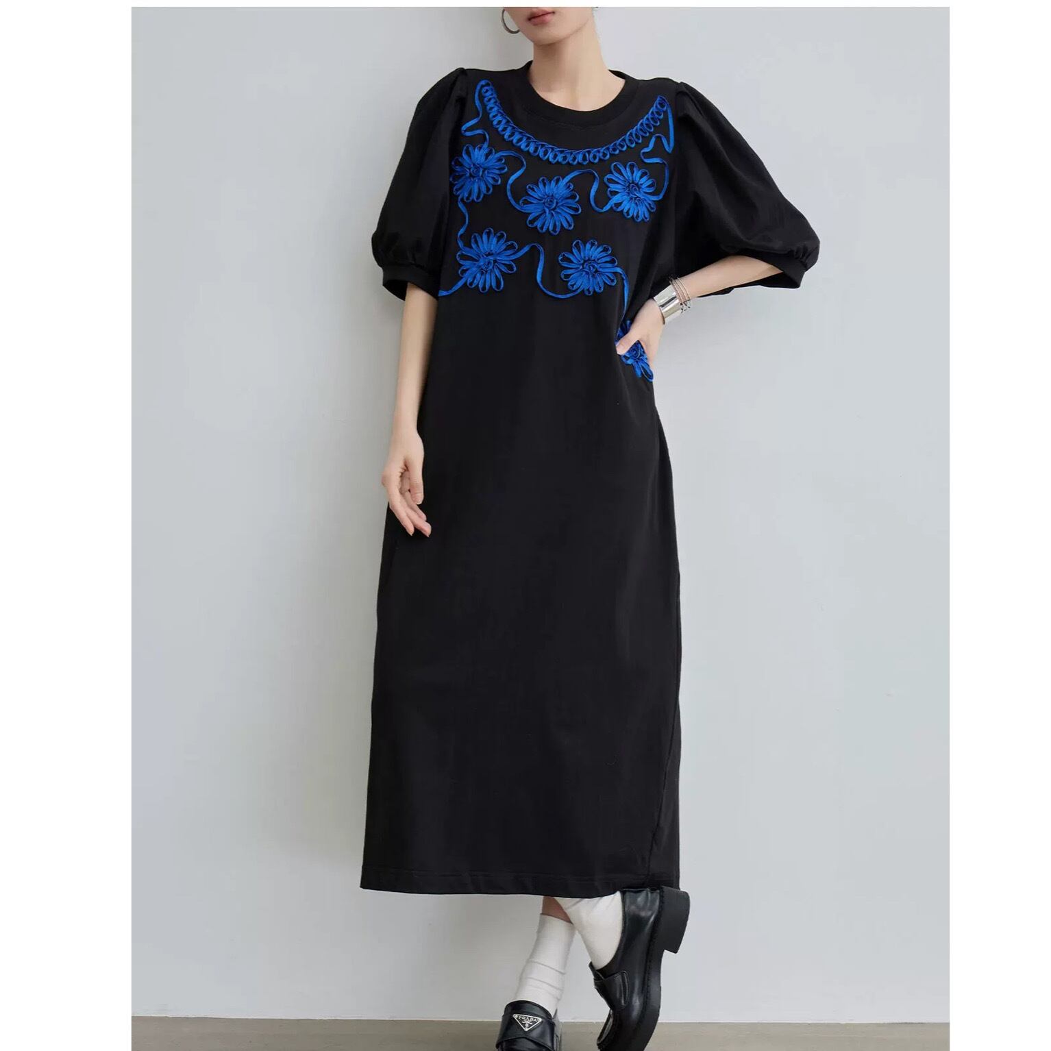 シンプルなブラックのボディに、鮮やかなブルーのリボン刺繍を施したロング丈のTシャツワンピースです。首元から肩にかけて大胆にあしらわれた刺繍が、まるでアート作品のような存在感を放ち、着こなしの主役になります。