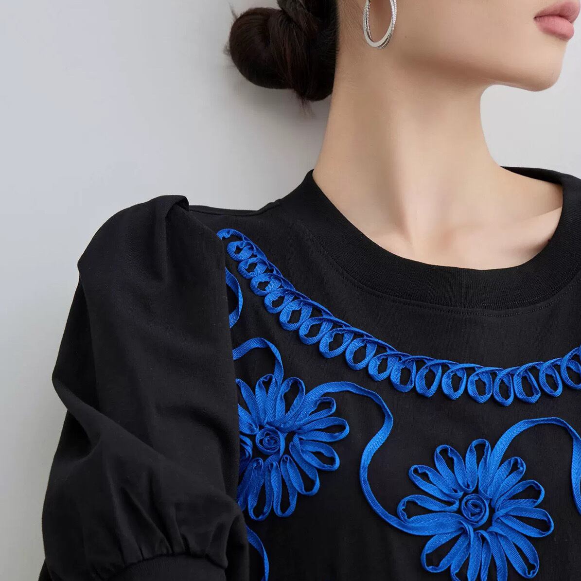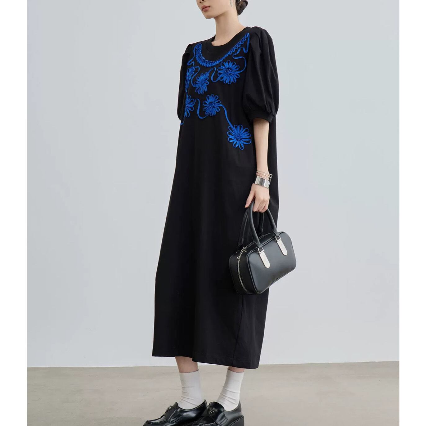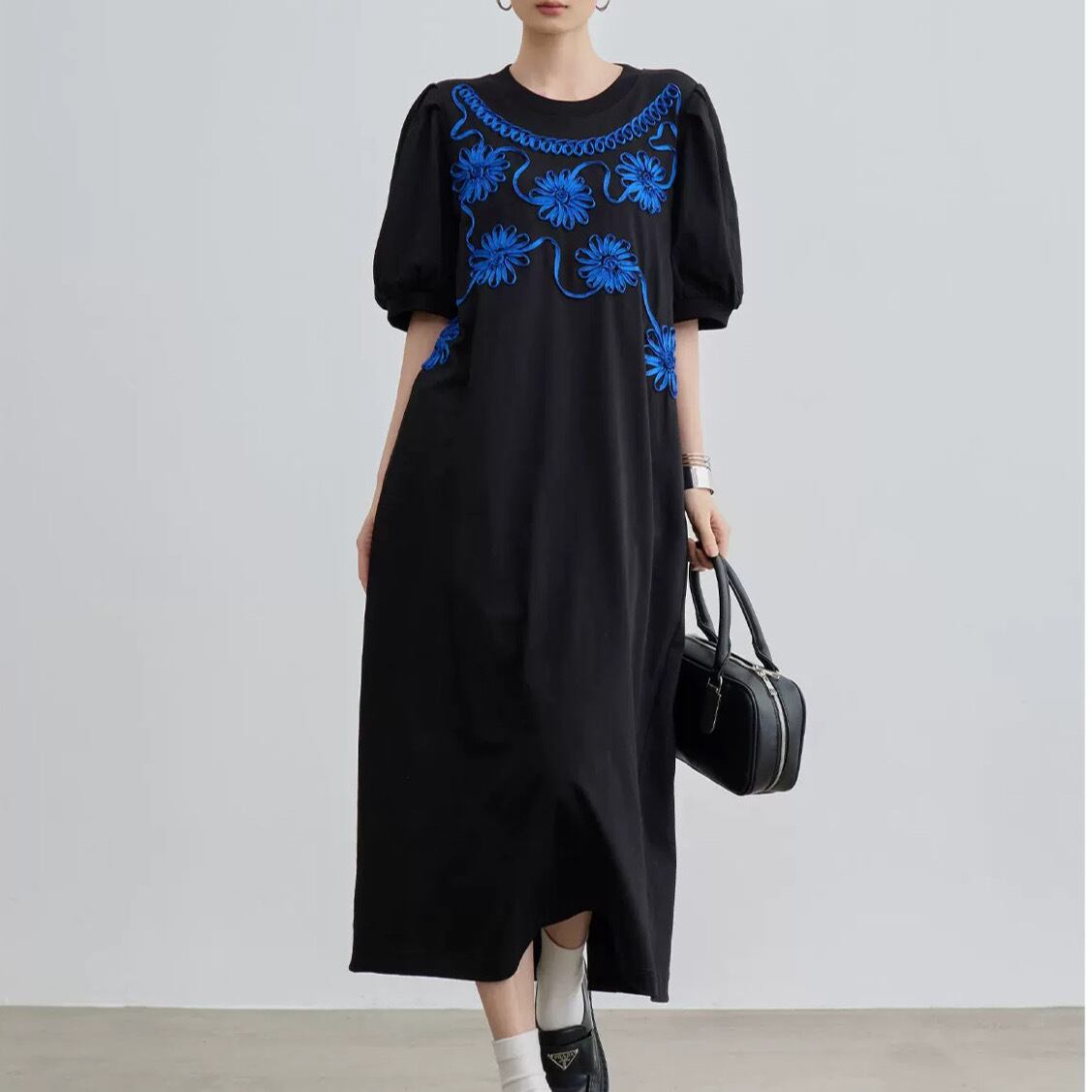 シンプルなブラックのボディに、鮮やかなブルーのリボン刺繍を施したロング丈のTシャツワンピースです。首元から肩にかけて大胆にあしらわれた刺繍が、まるでアート作品のような存在感を放ち、着こなしの主役になります。