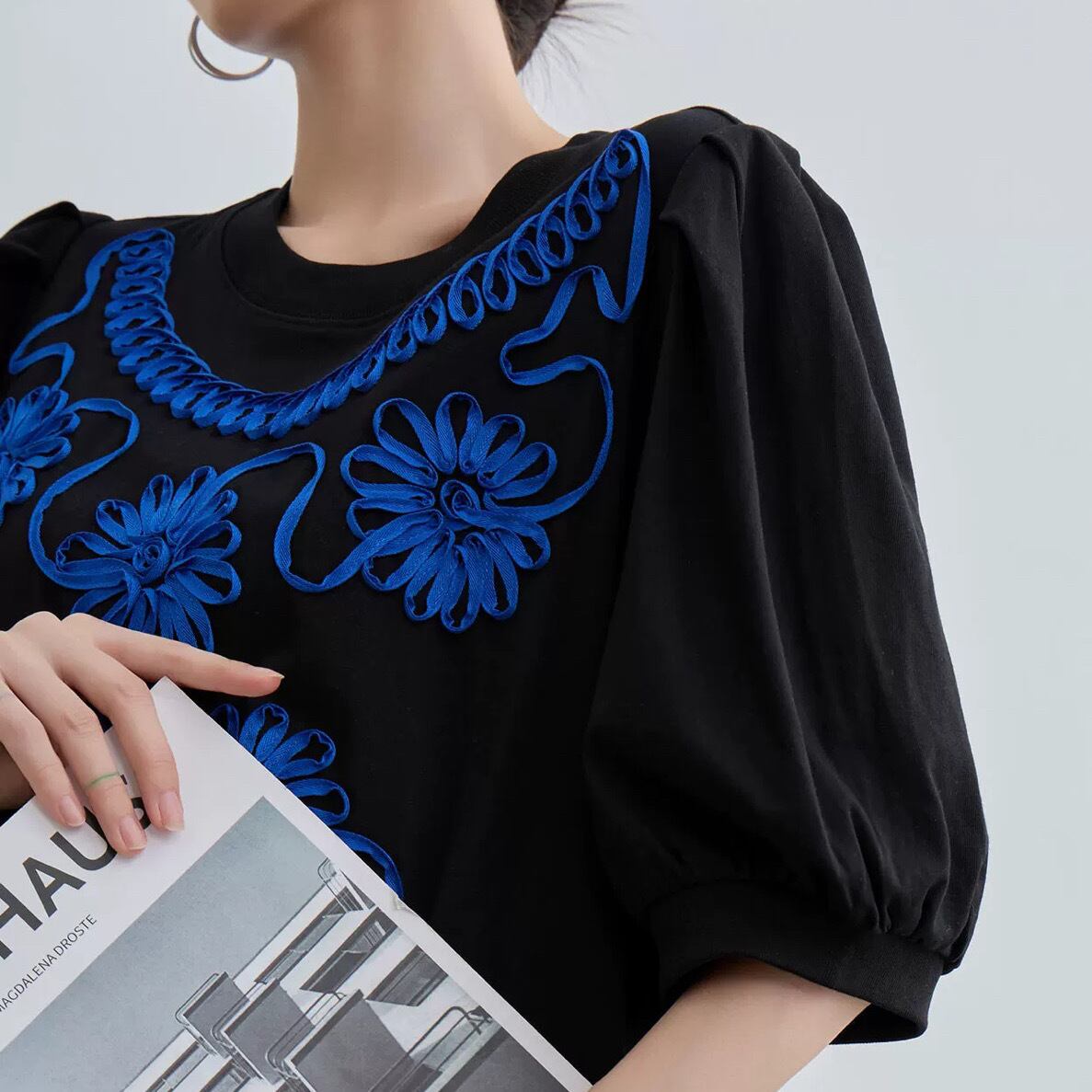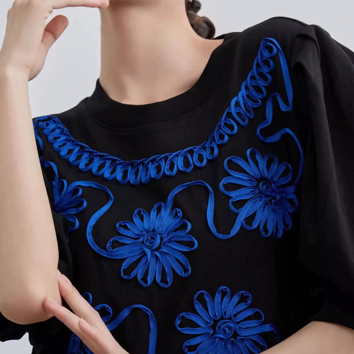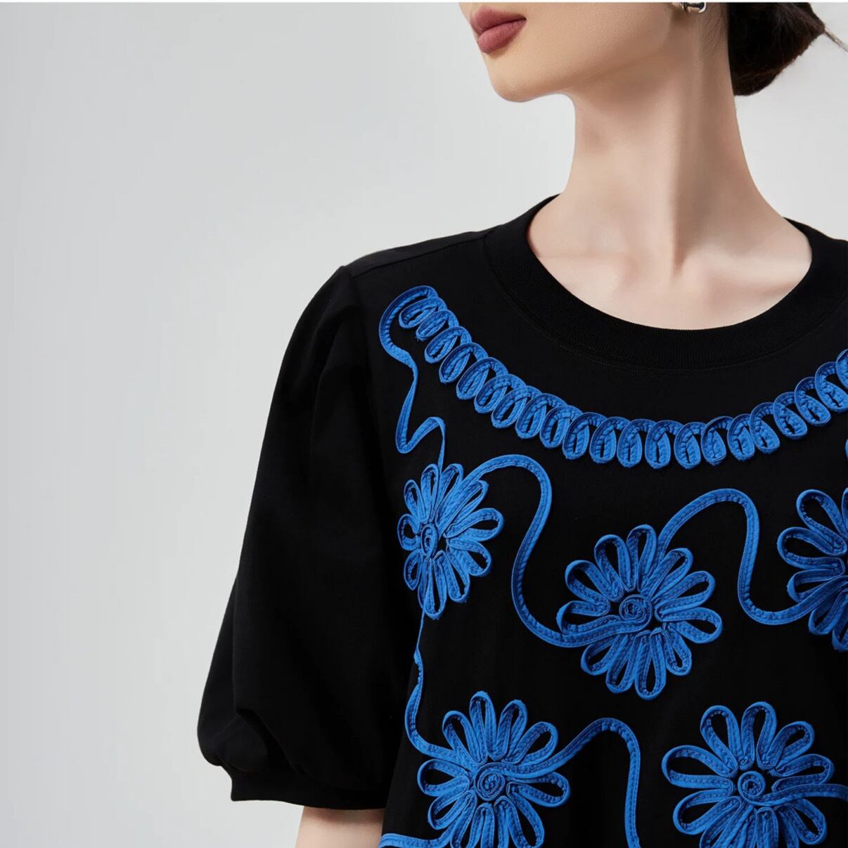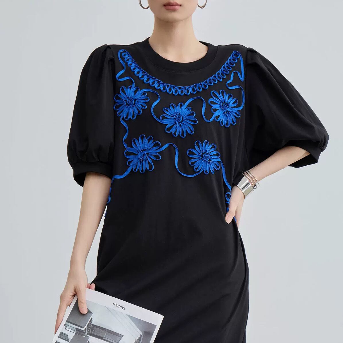 シンプルなブラックのボディに、鮮やかなブルーのリボン刺繍を施したロング丈のTシャツワンピースです。首元から肩にかけて大胆にあしらわれた刺繍が、まるでアート作品のような存在感を放ち、着こなしの主役になります。