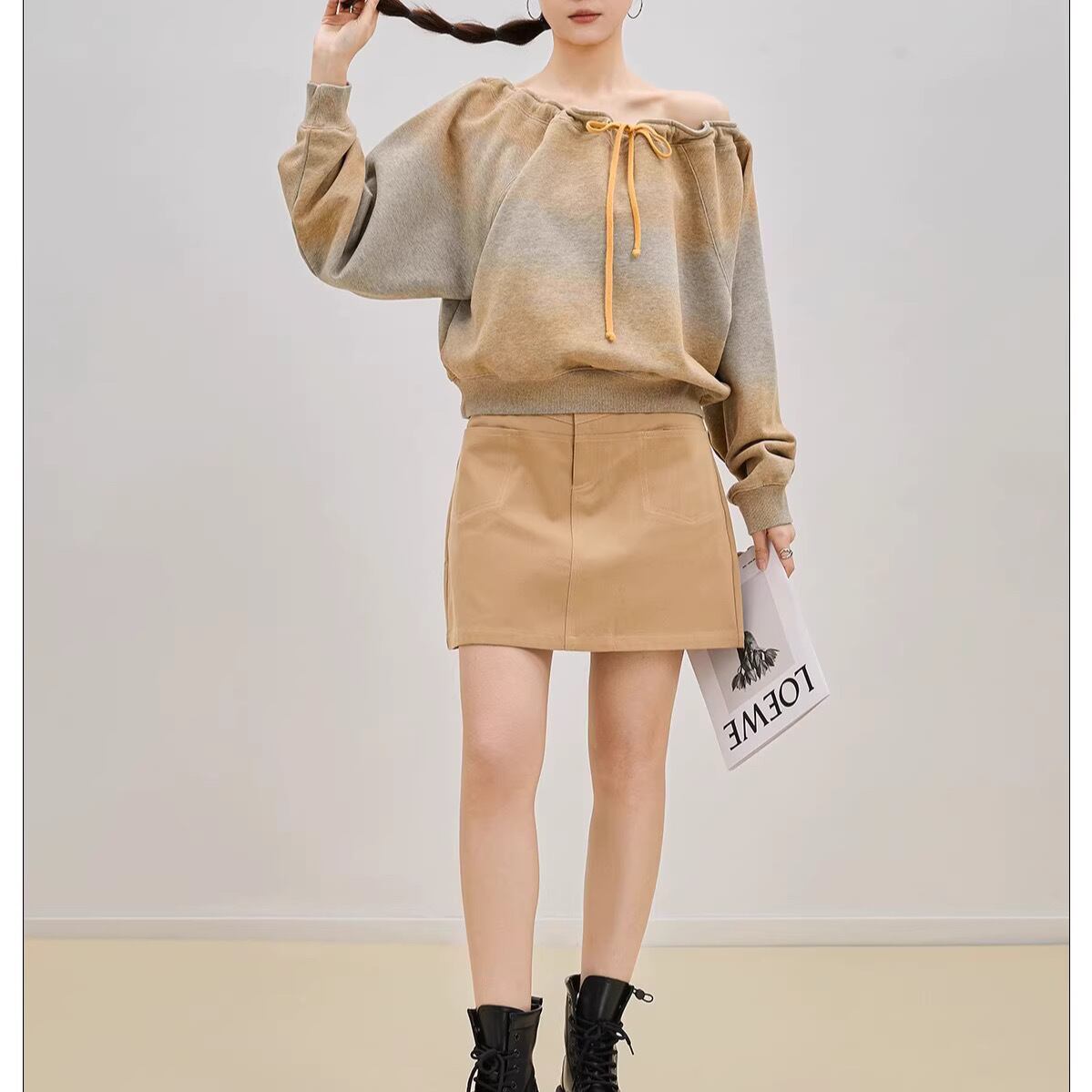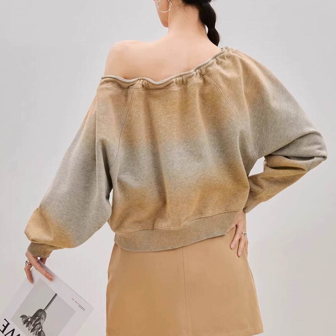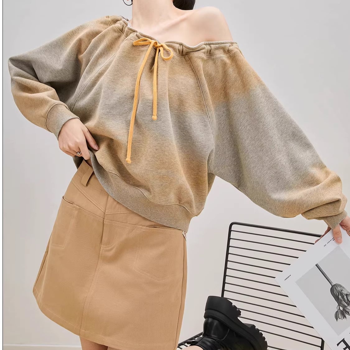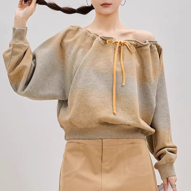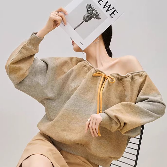 ラテカラーで大人可愛いゆるシルエットのオフショルダースウェット。デコルテを綺麗に見せたり、カジュアルに着こなしたり、首元のリボンで自由にアレンジできます。
