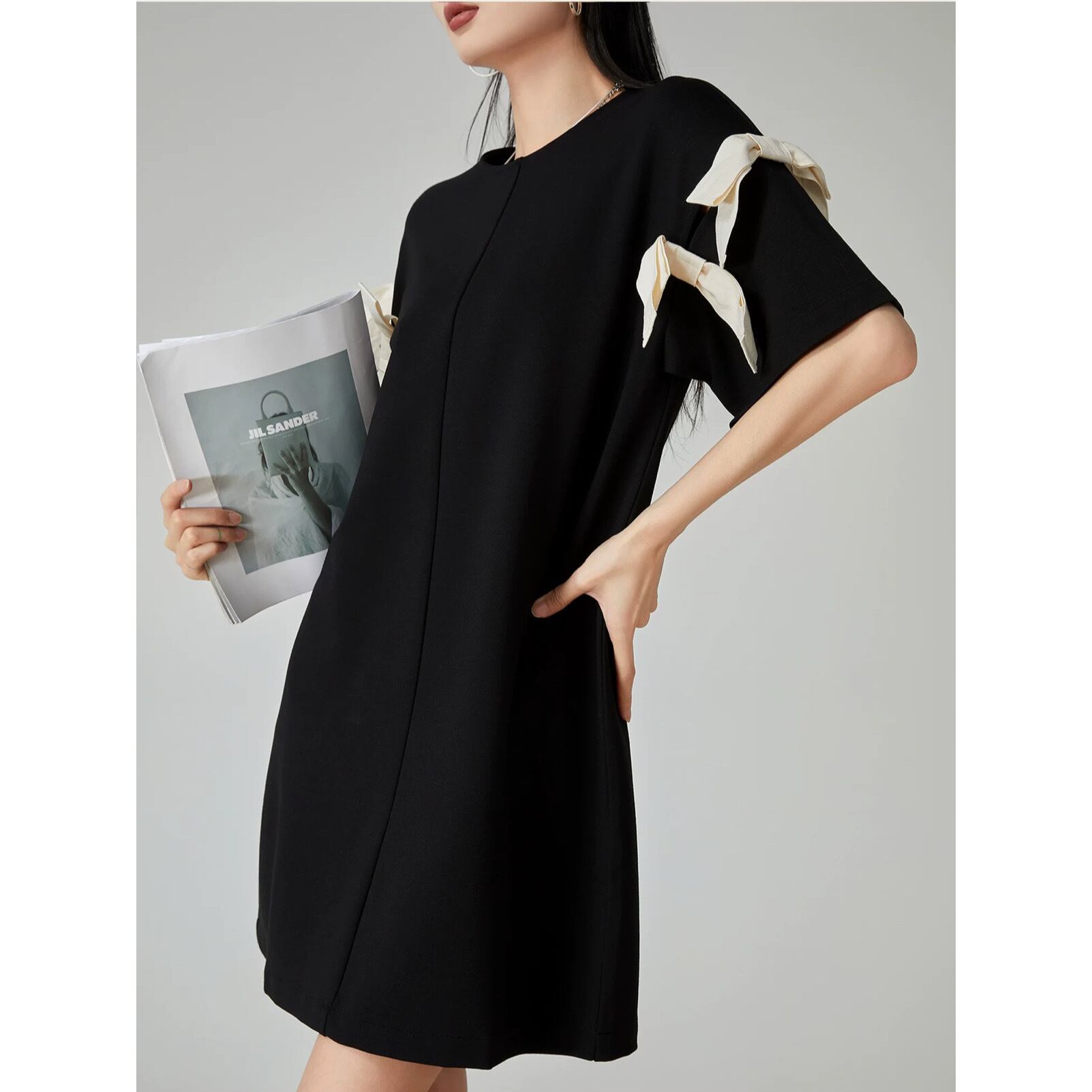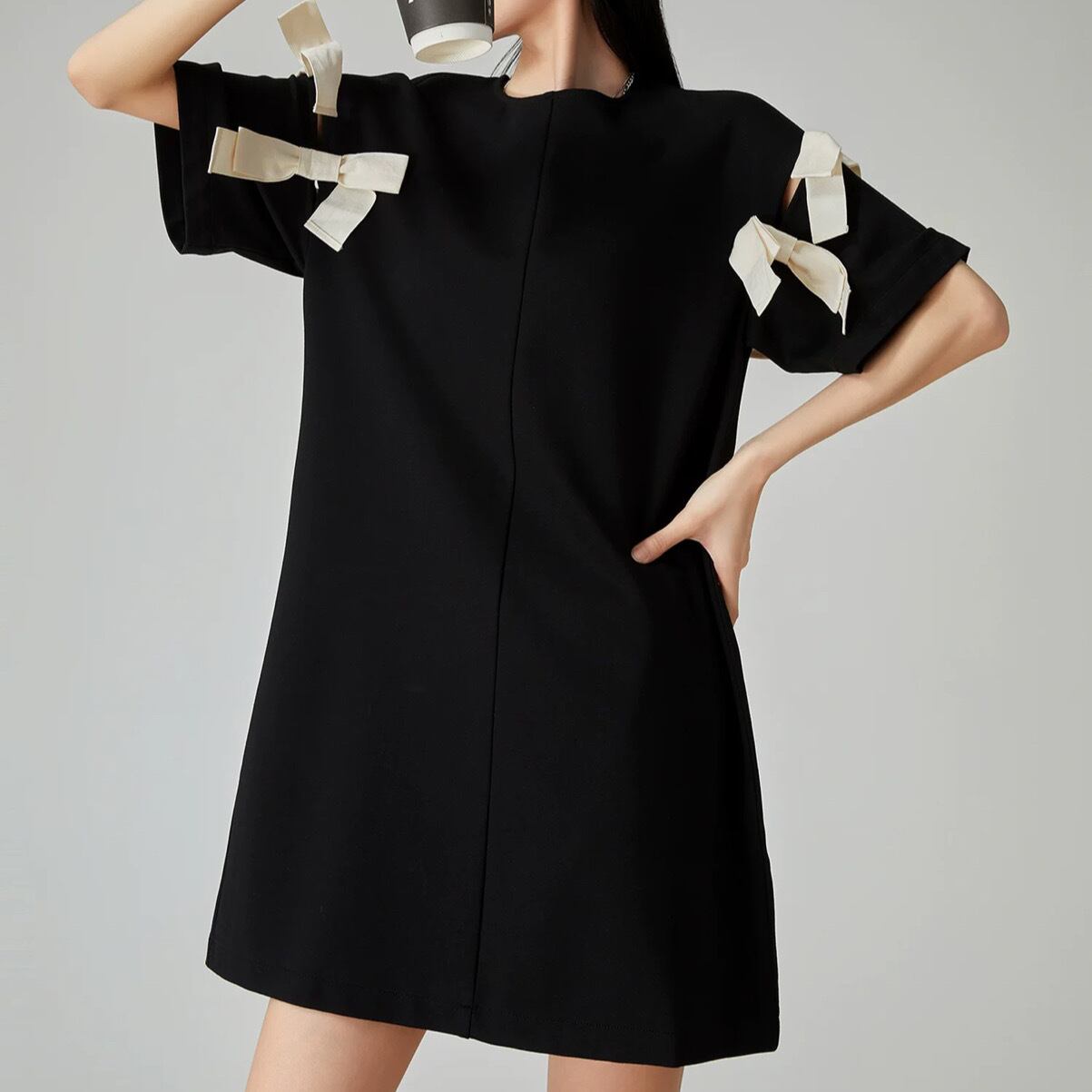 肩から袖にかけて施された複数のリボンが、大人の甘さを引き出すミニワンピース。シンプルなブラックのボディに映えるオフホワイトのリボンが、シックで洗練された印象を与えます。