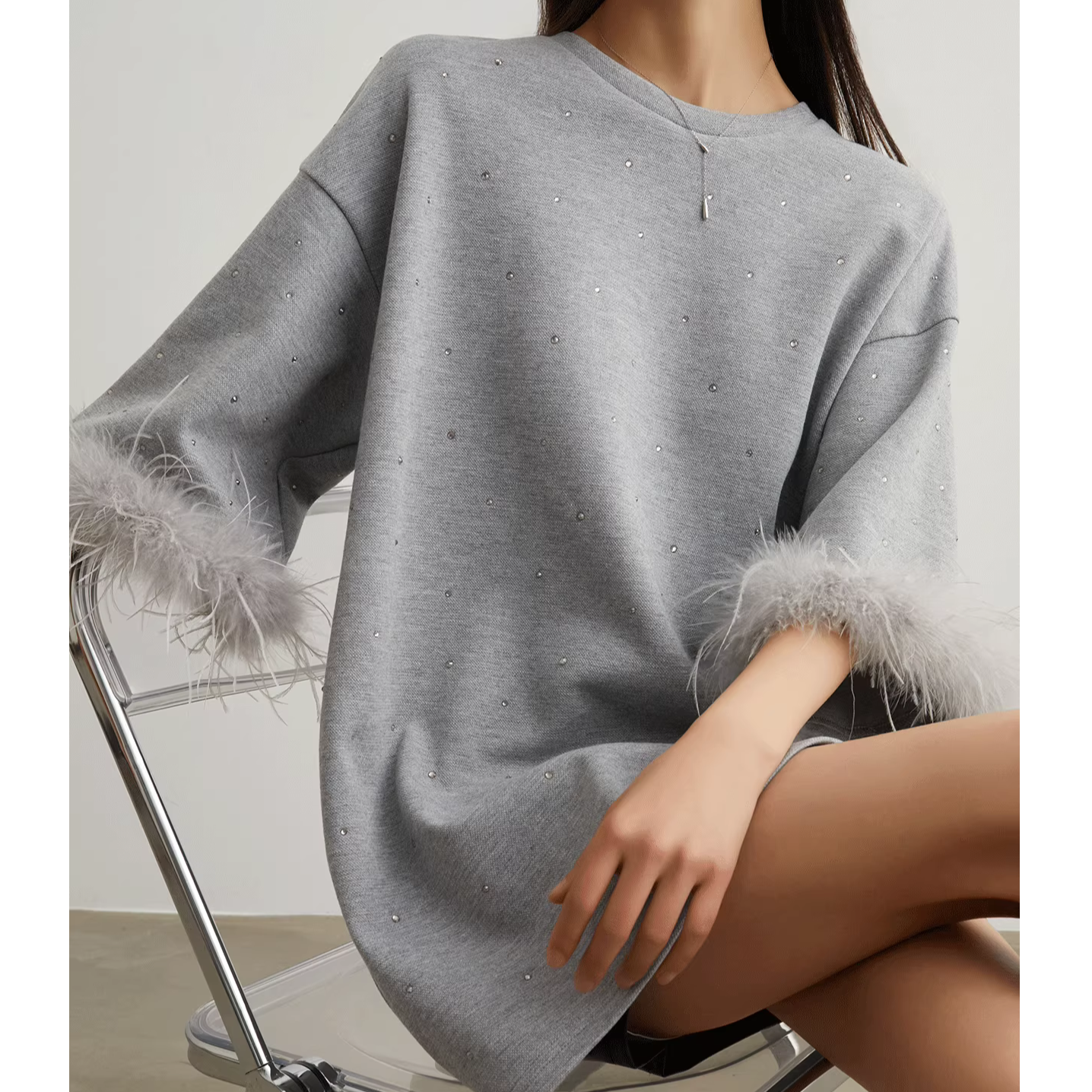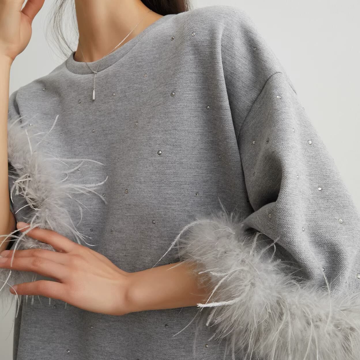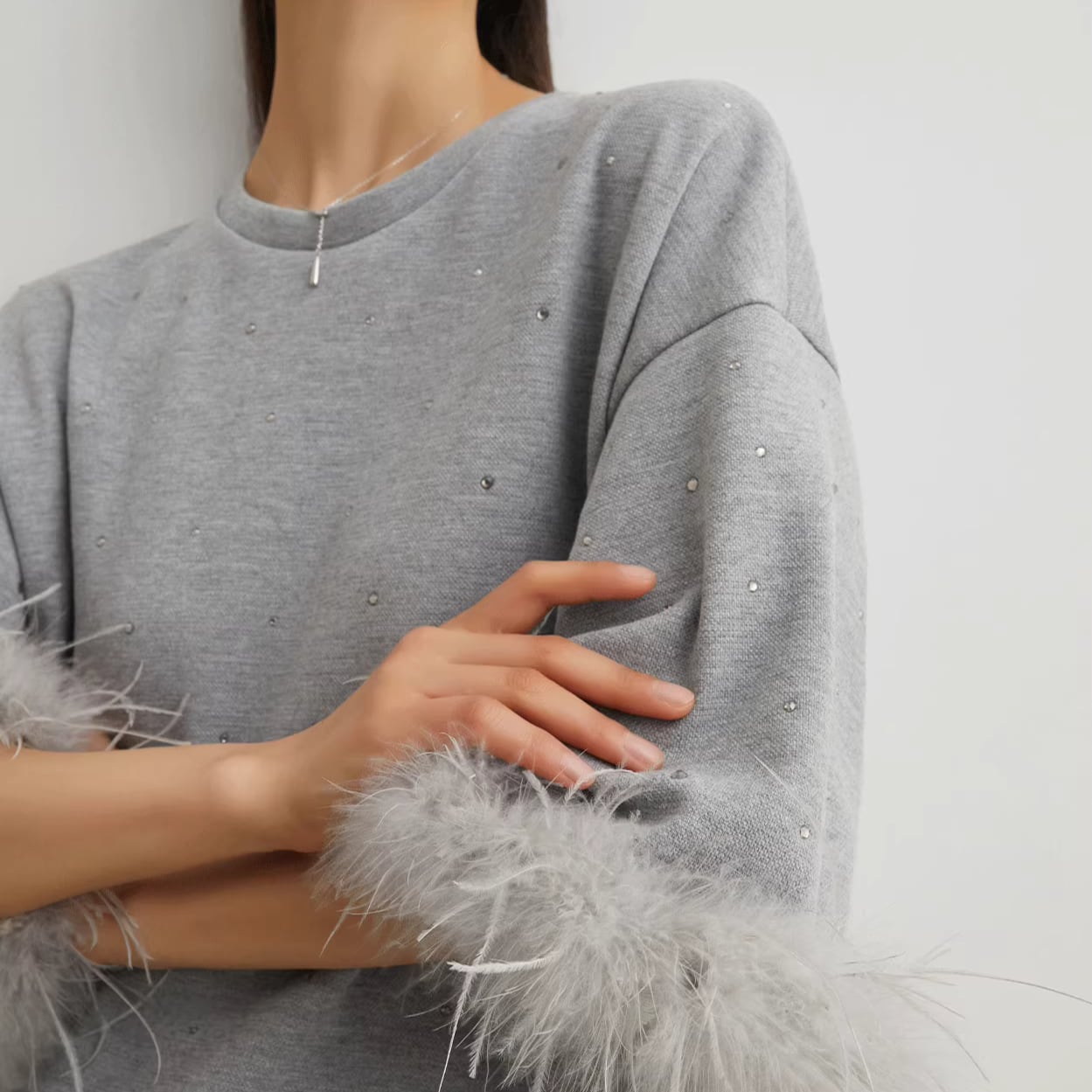 カジュアルなスウェット素材を、袖口のふわふわとしたフェザーと散りばめられたラインストーンで一気に華やかにアップデート。一枚で主役級の存在感を放つデザインスウェットです。