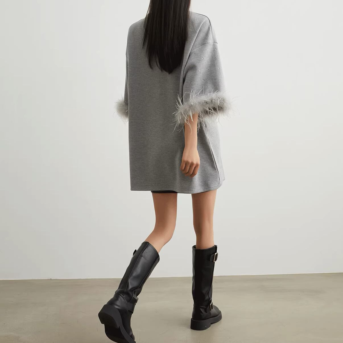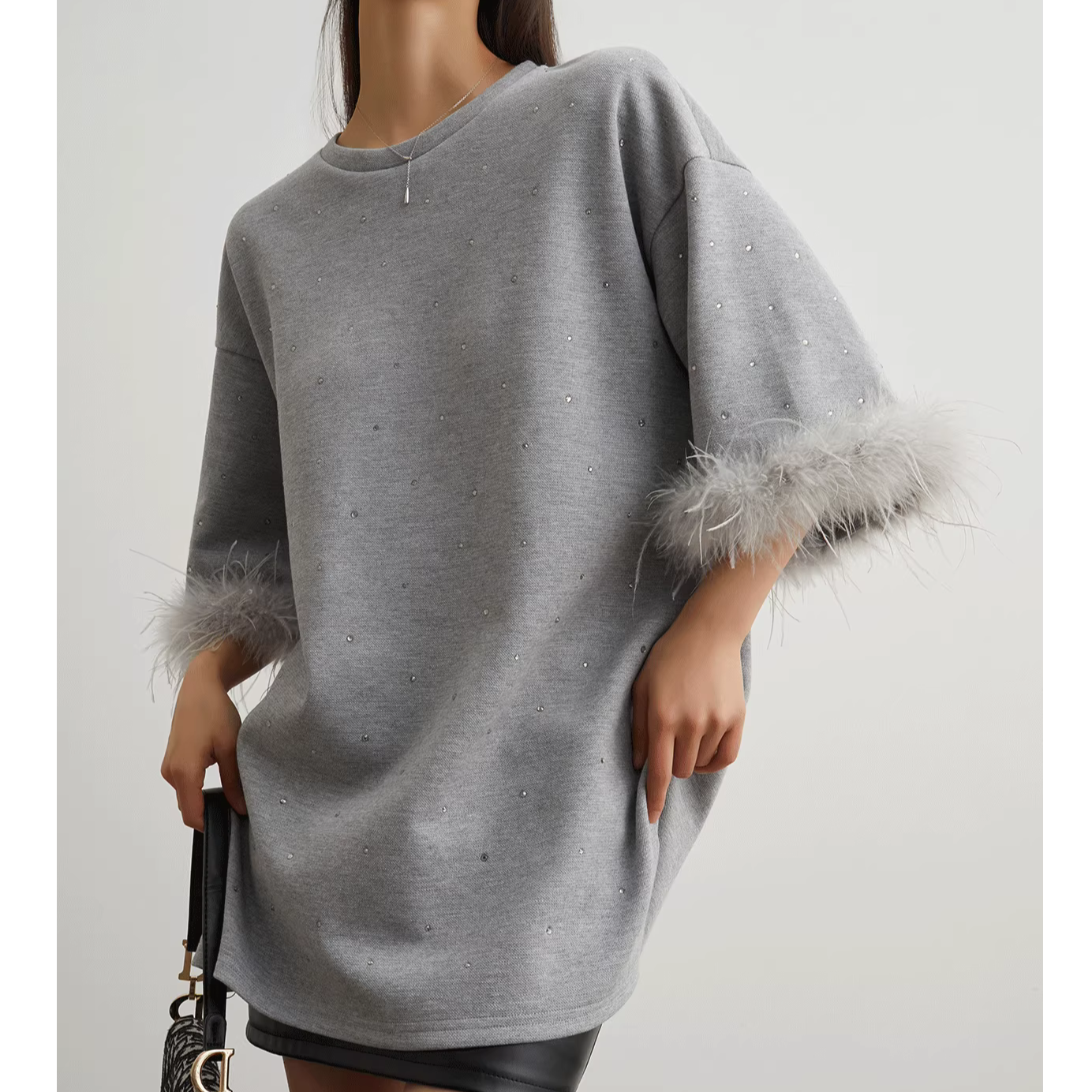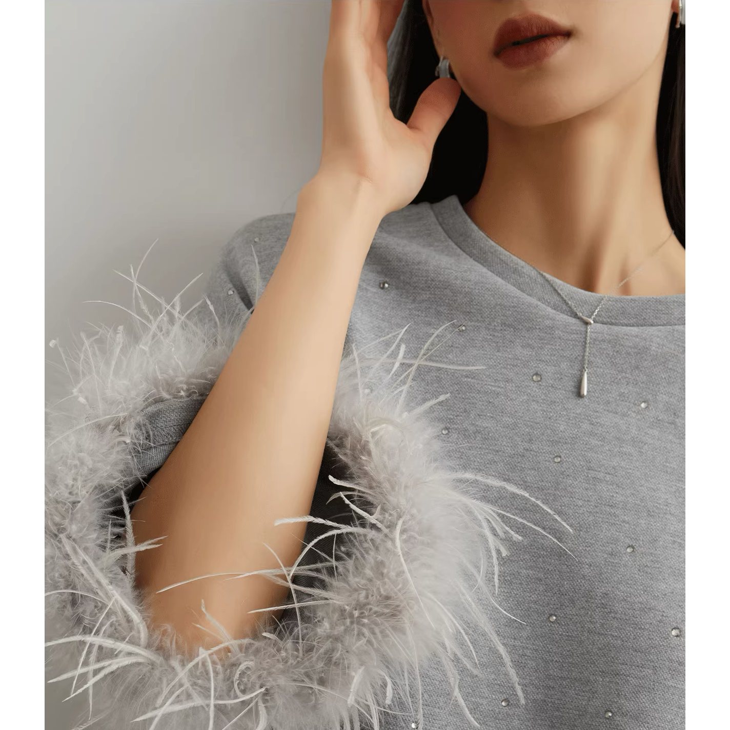 カジュアルなスウェット素材を、袖口のふわふわとしたフェザーと散りばめられたラインストーンで一気に華やかにアップデート。一枚で主役級の存在感を放つデザインスウェットです。