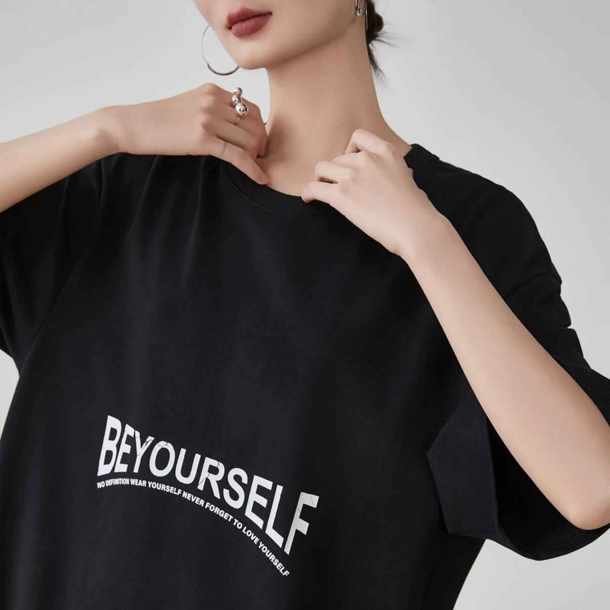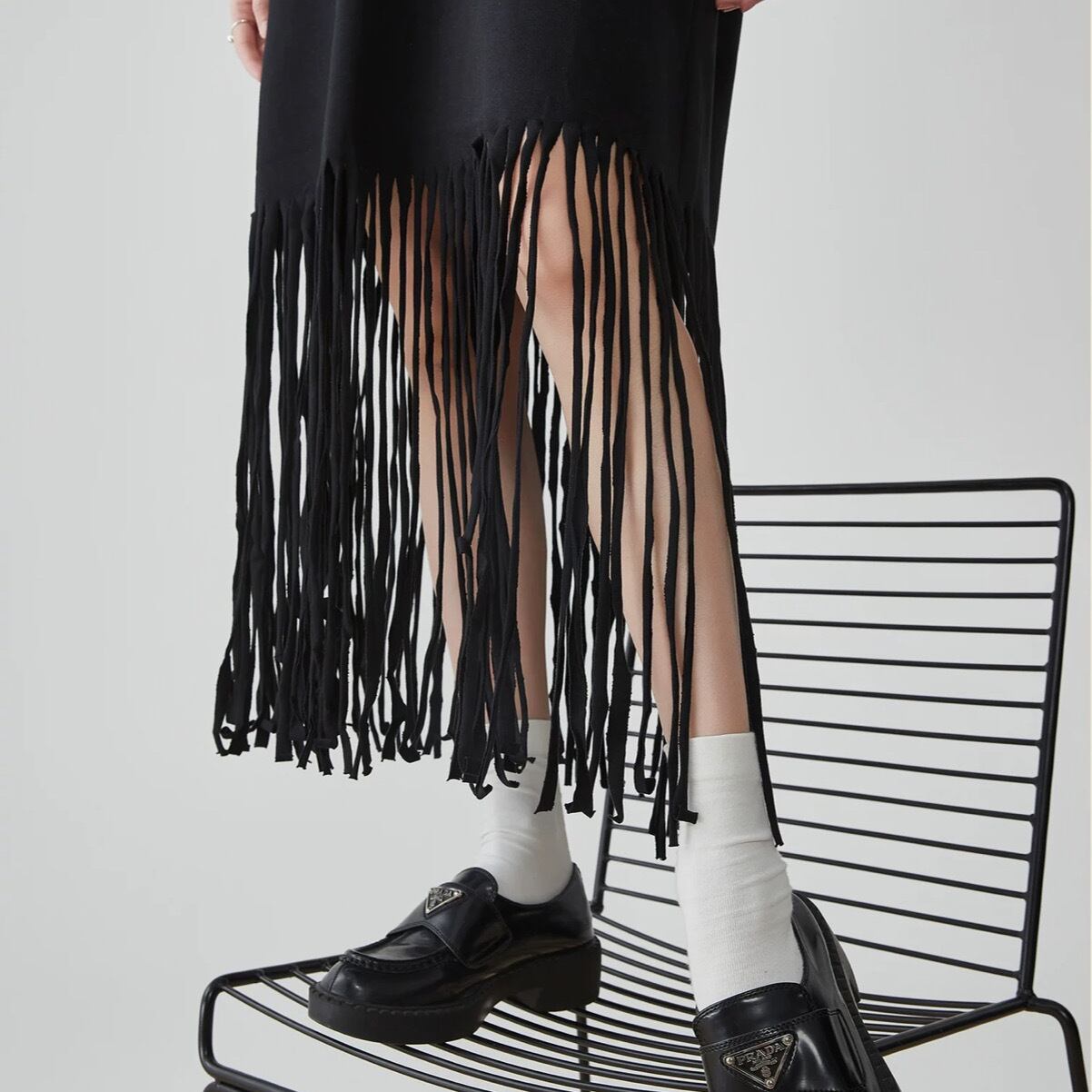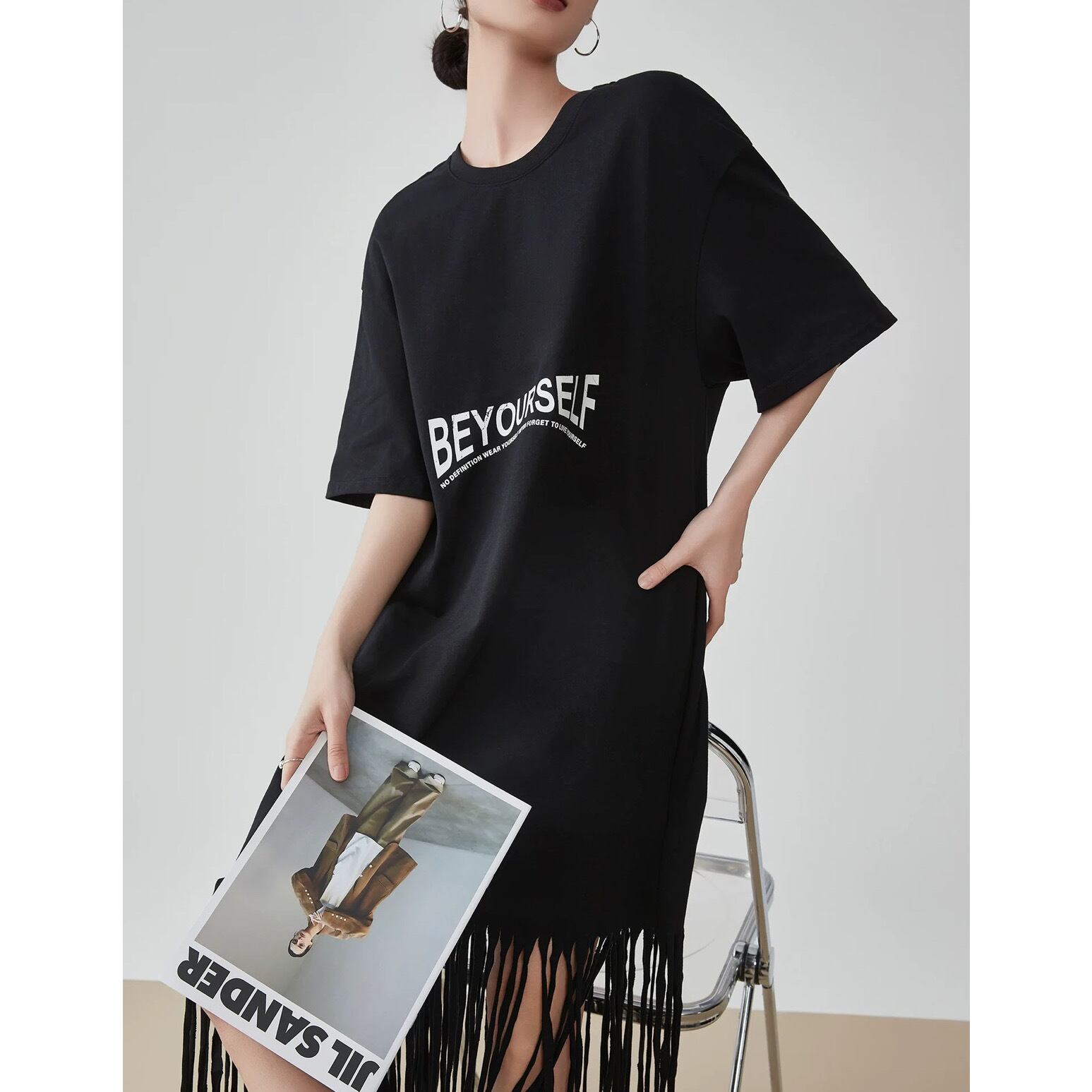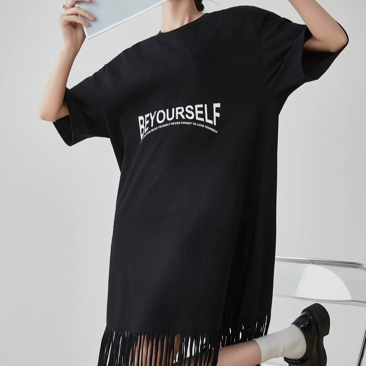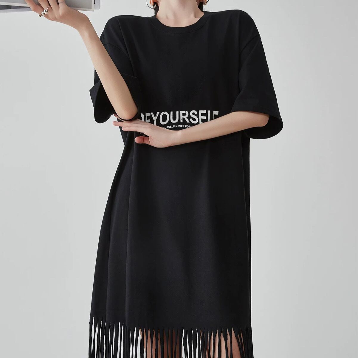 シンプルながらも個性的なデザインが目を引く、ロゴプリントTシャツワンピース。裾にあしらわれた大胆なフリンジが、歩くたびに揺れてコーディネートに動きと軽やかさをプラスします。