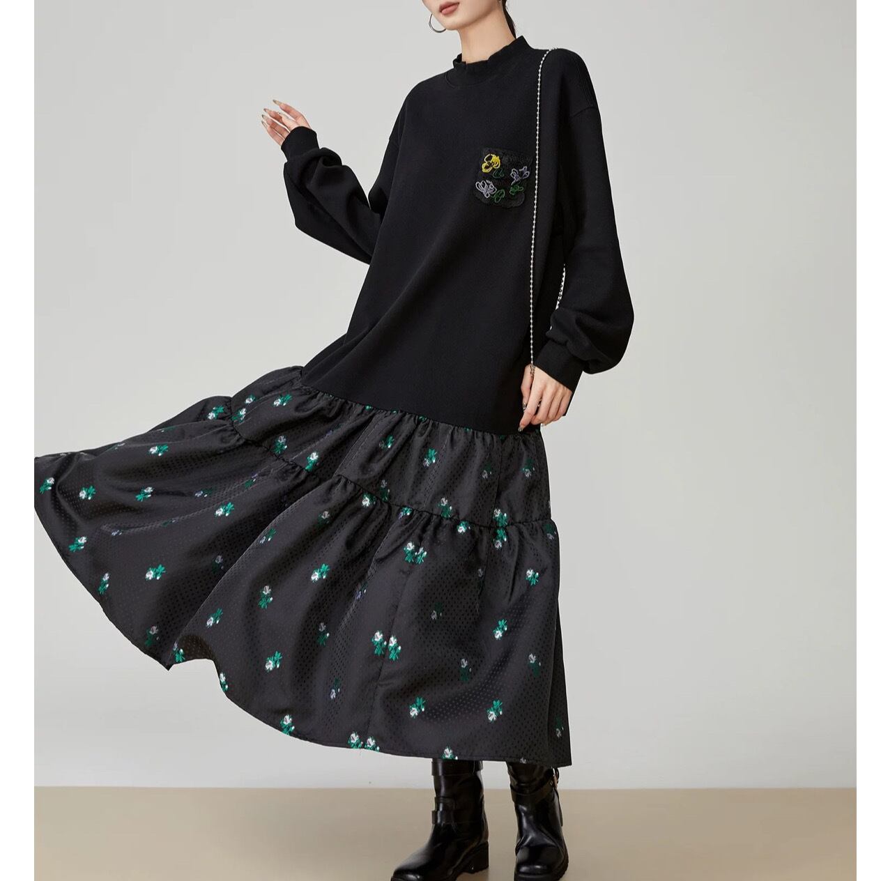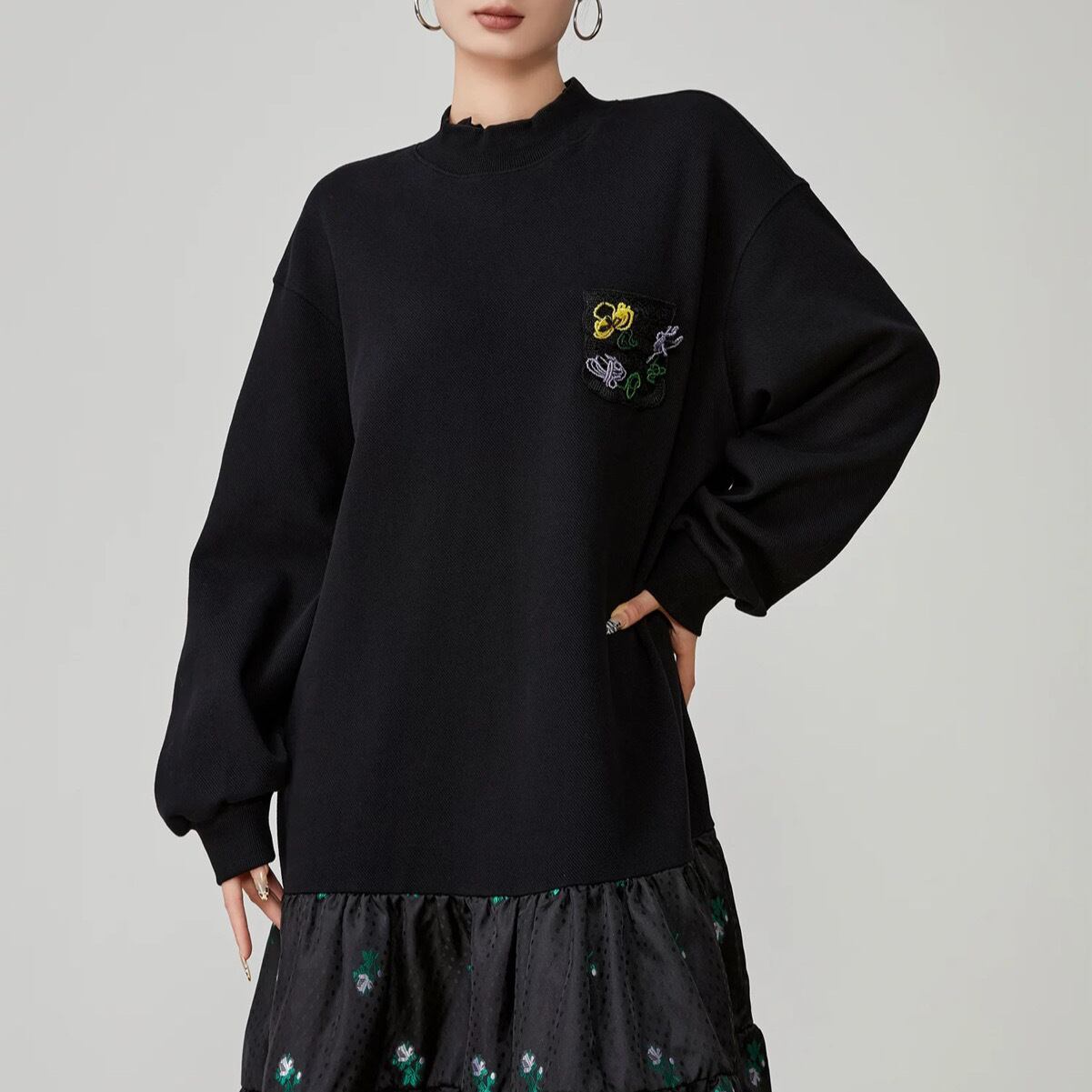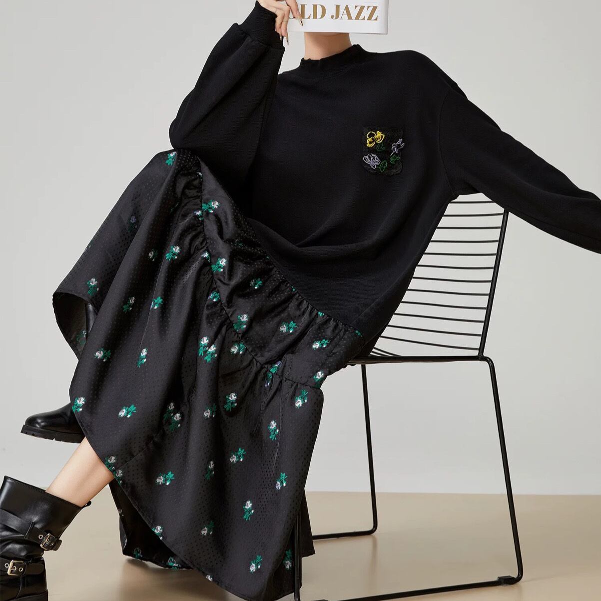スウェット生地のトップスと、花柄のティアードスカートをドッキングさせた、1枚でスタイリングが完成するワンピースです。スタンドカラーのフリルネックが顔まわりを華やかに演出し、左胸には刺繍の入った個性的なポケットが施されています。