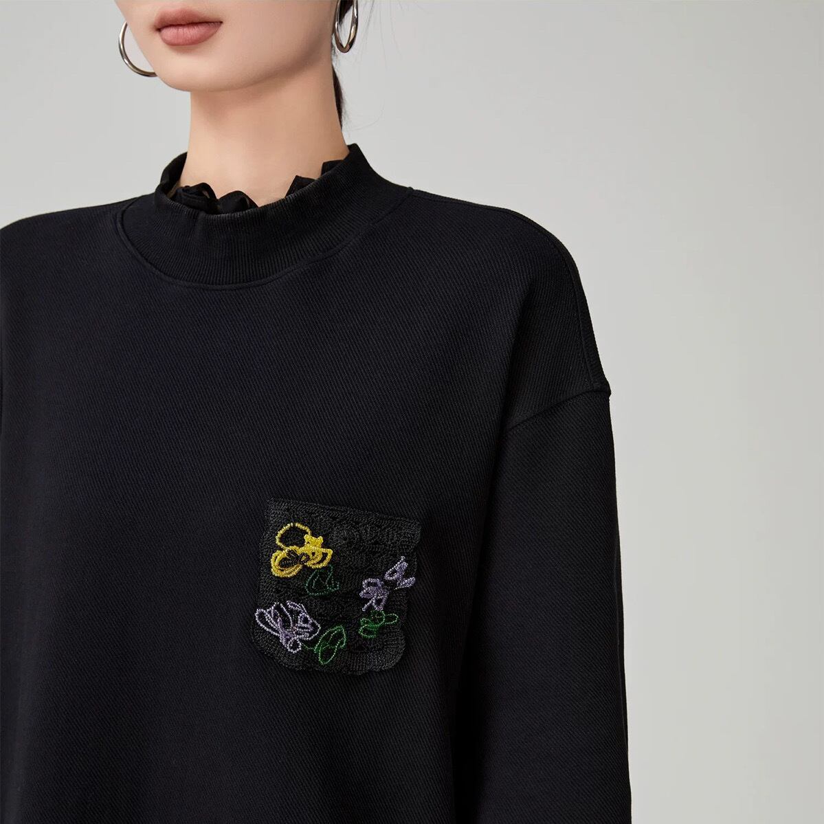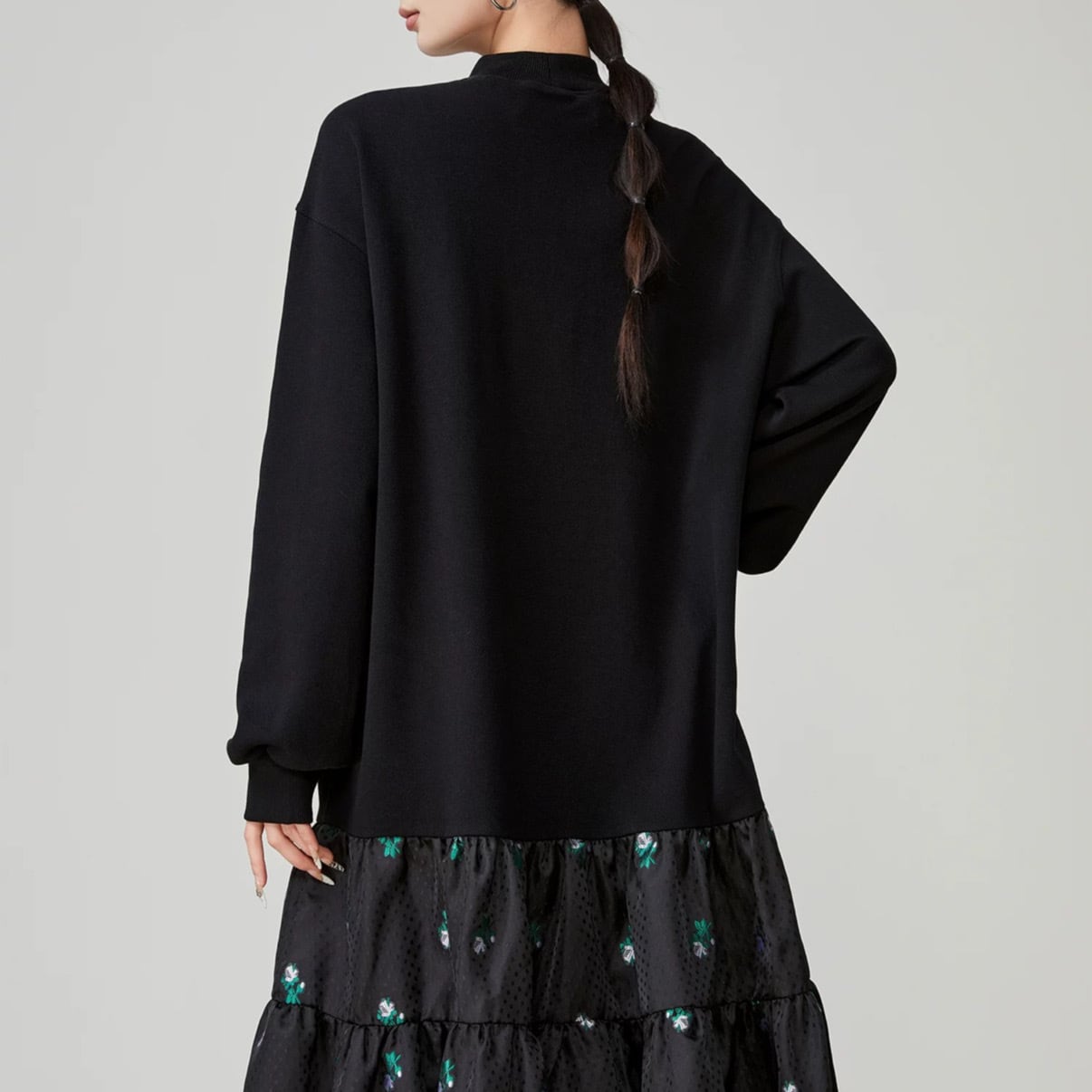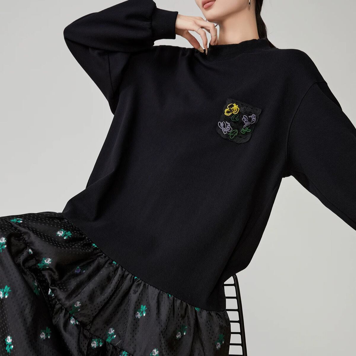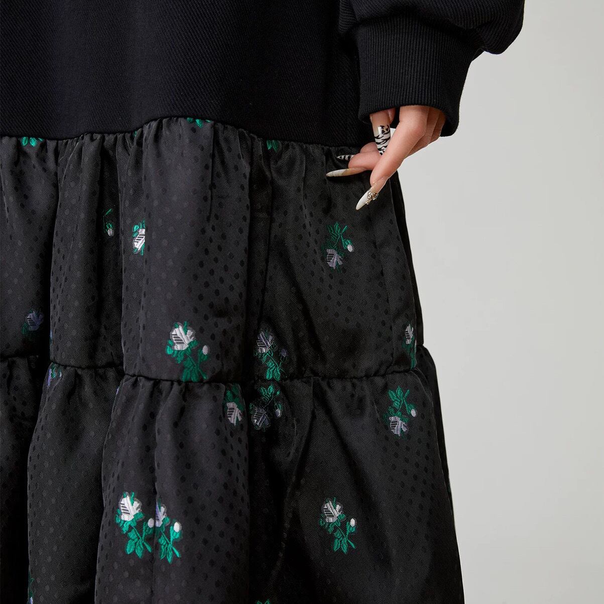 スウェット生地のトップスと、花柄のティアードスカートをドッキングさせた、1枚でスタイリングが完成するワンピースです。スタンドカラーのフリルネックが顔まわりを華やかに演出し、左胸には刺繍の入った個性的なポケットが施されています。