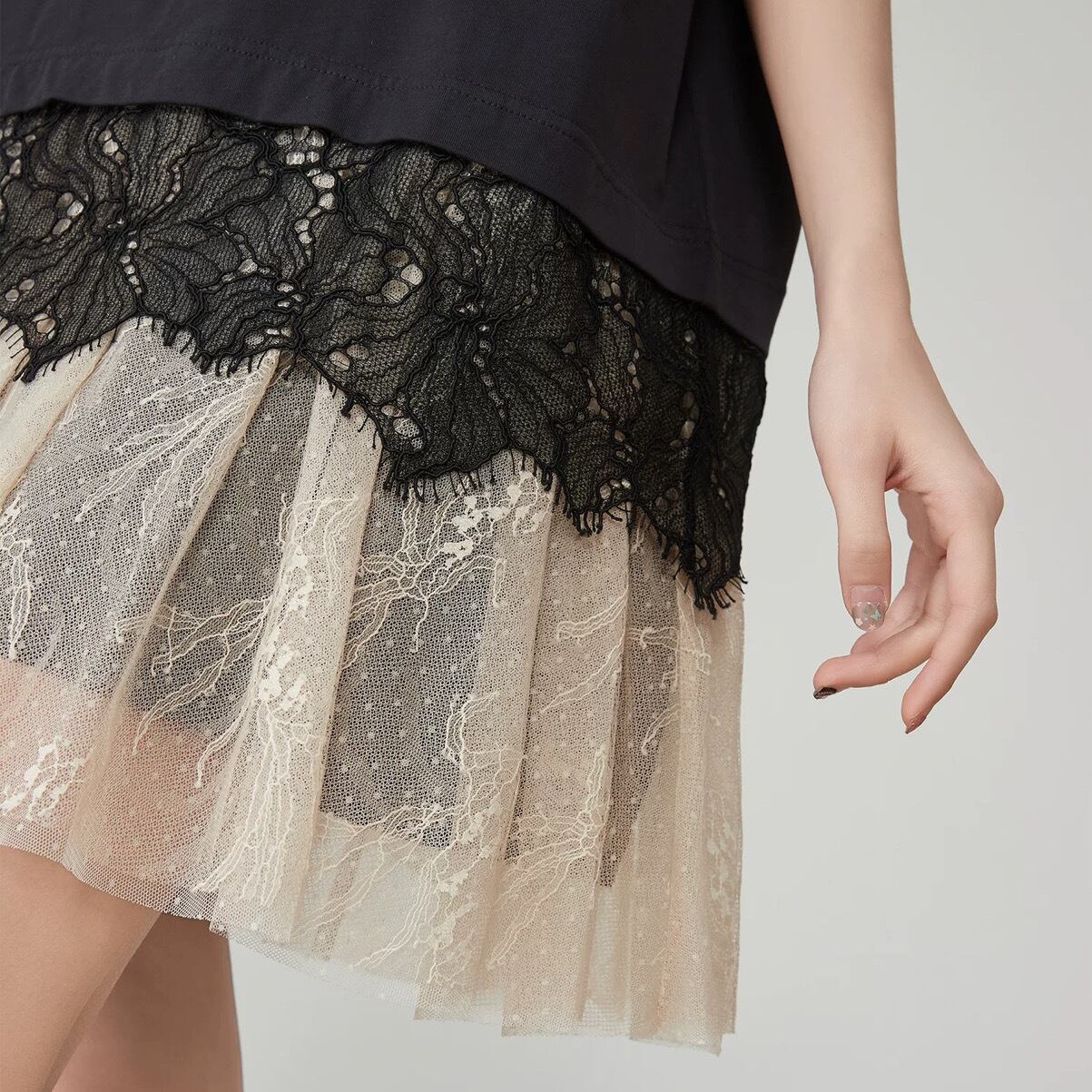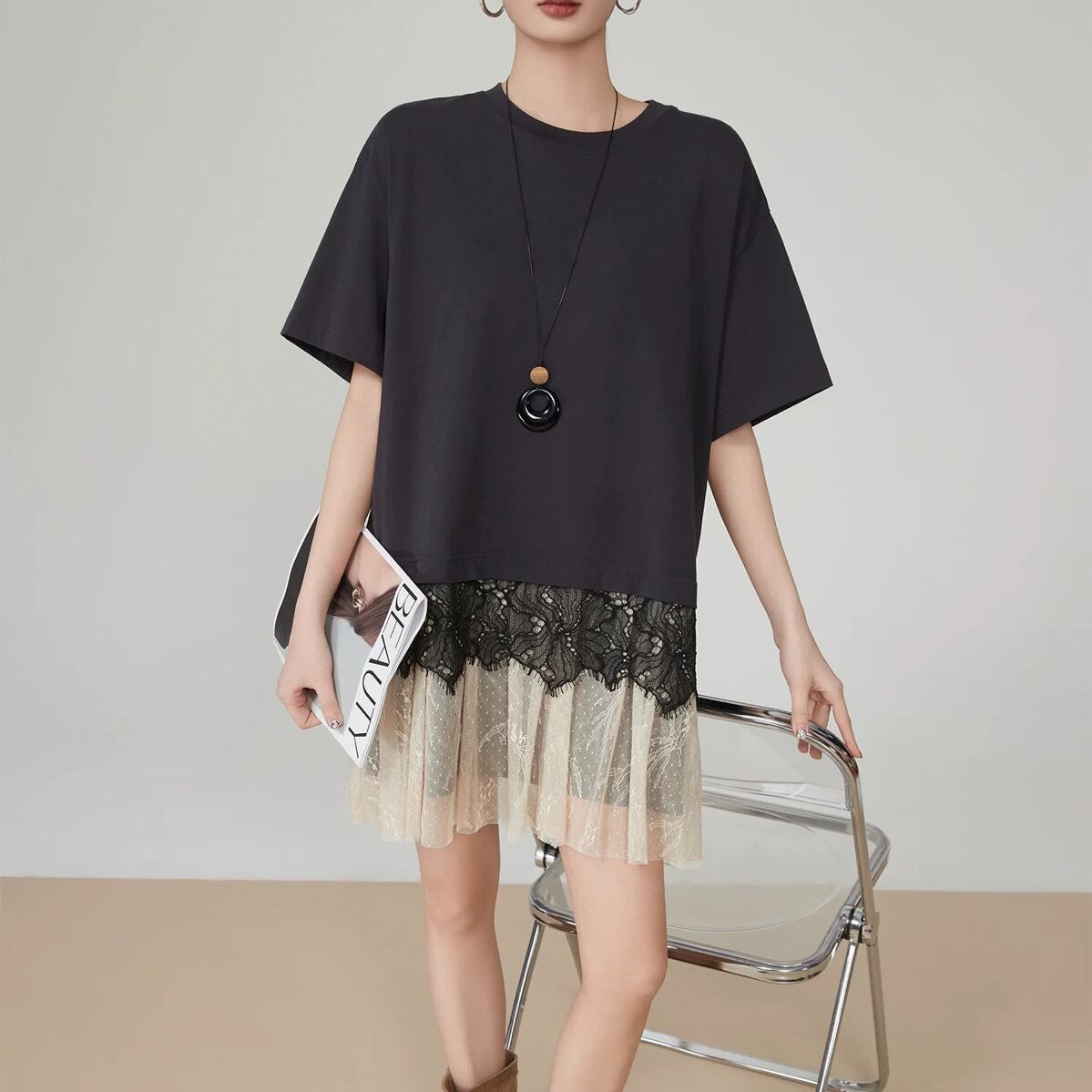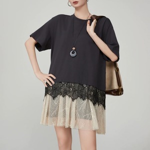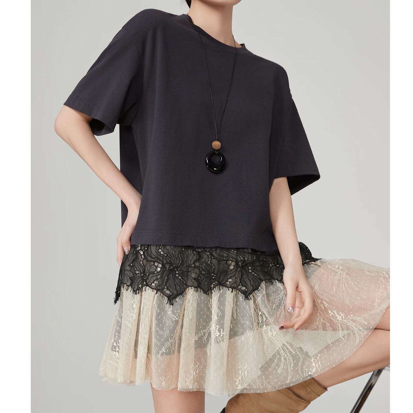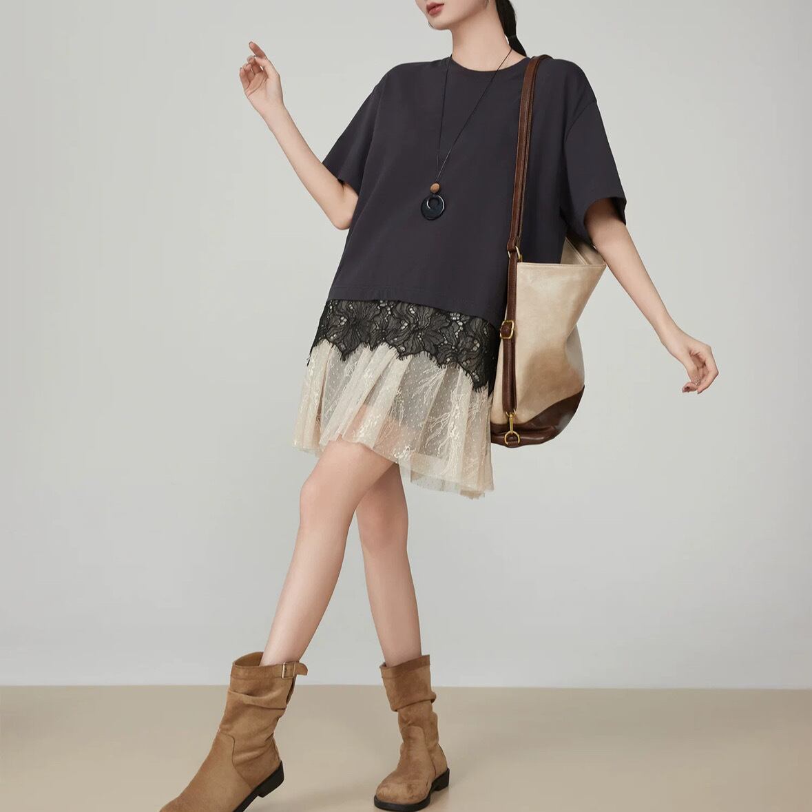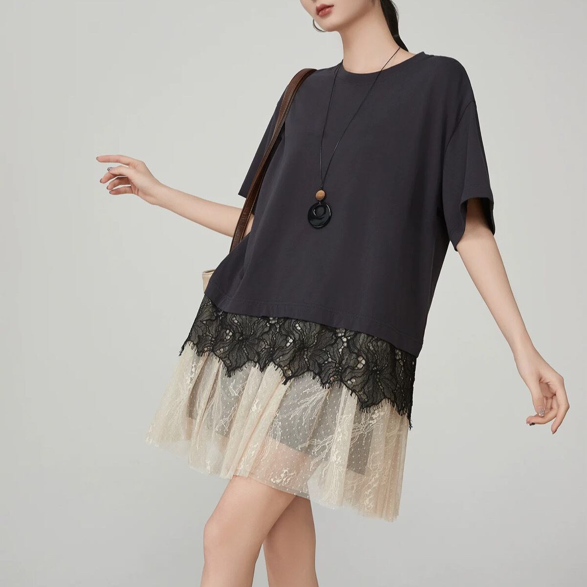 シンプルでゆったりとしたTシャツと、繊細なレーススカートを組み合わせた、一枚でレイヤードスタイルが完成するTシャツワンピースです。