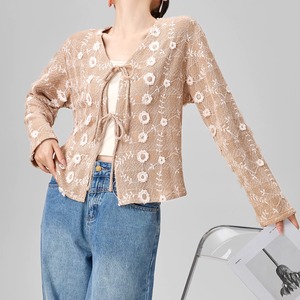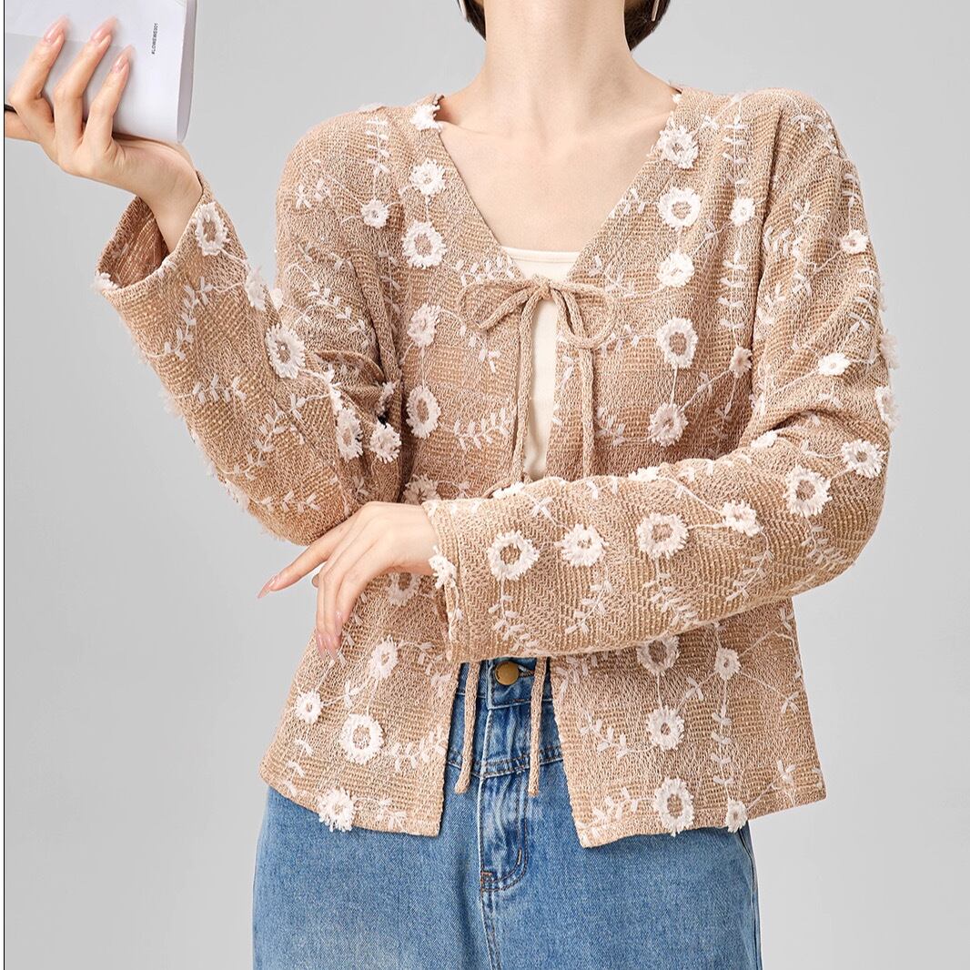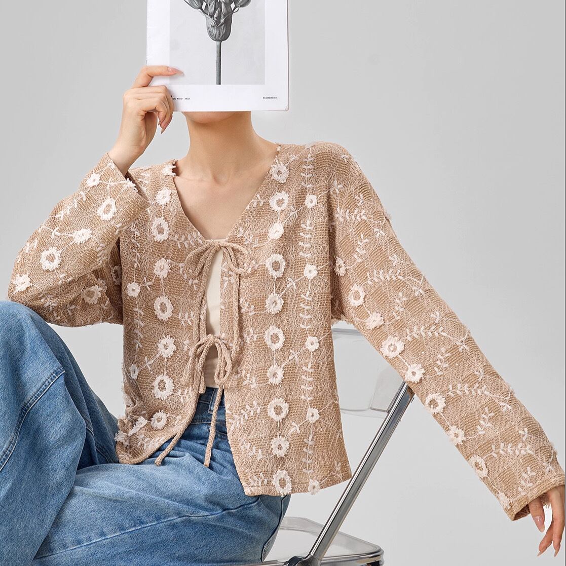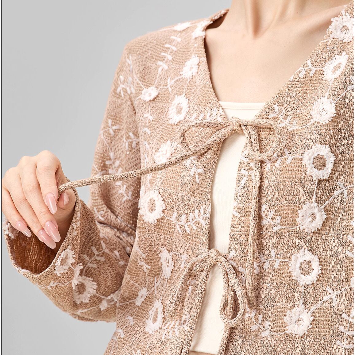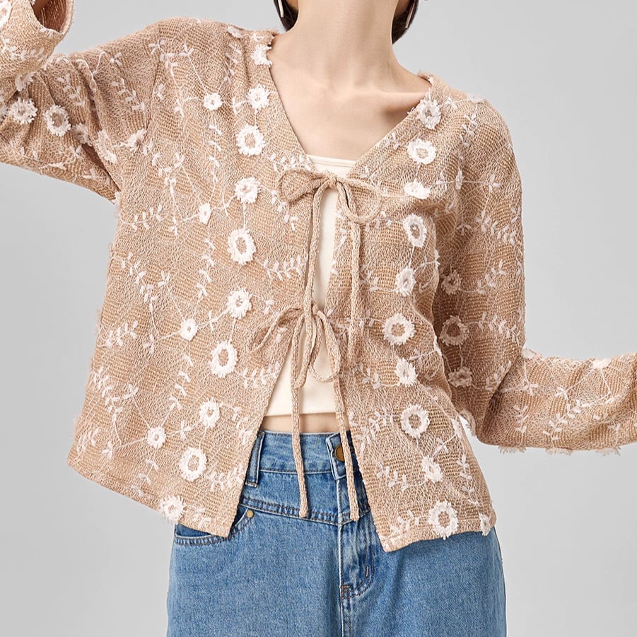 フローラル刺繍が華やかさを添えるショート丈カーディガン。優雅でありながらナチュラルな印象を与えるデザインは、どんなコーディネートにもプラスワンのアクセントを加えてくれます。フロントのリボンで結ぶデザインが、フェミニンな雰囲気を演出します。