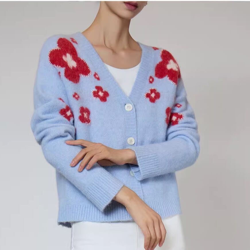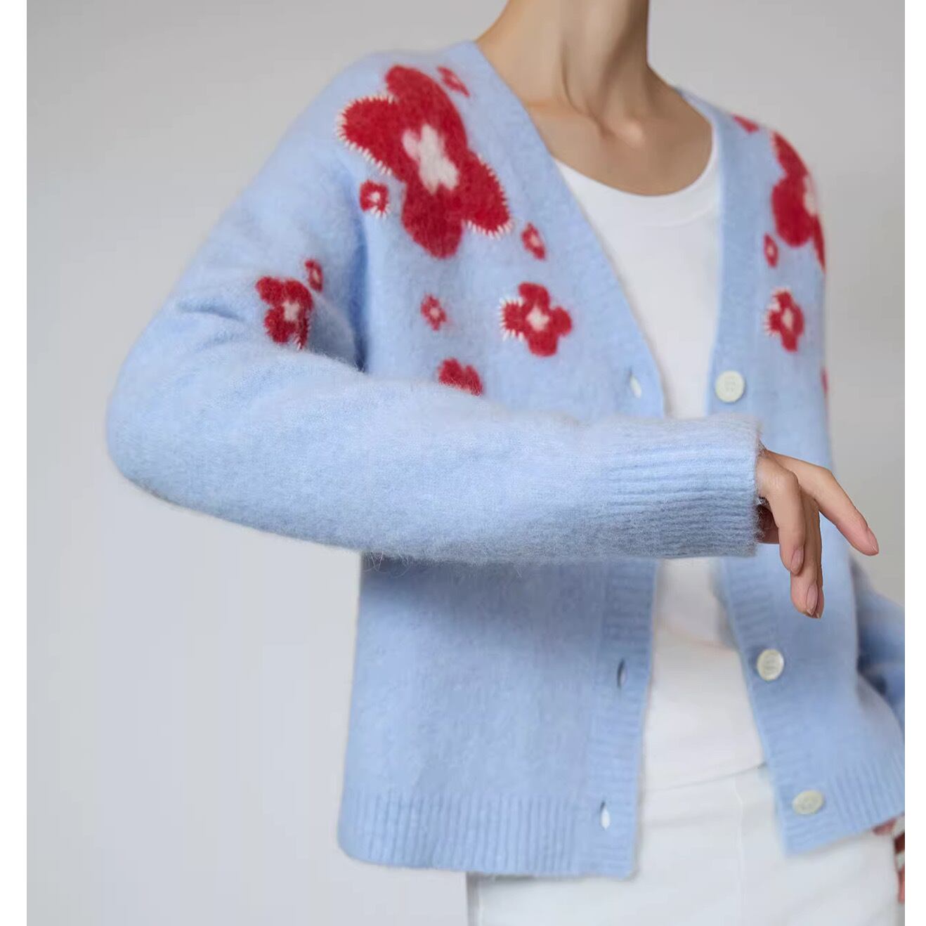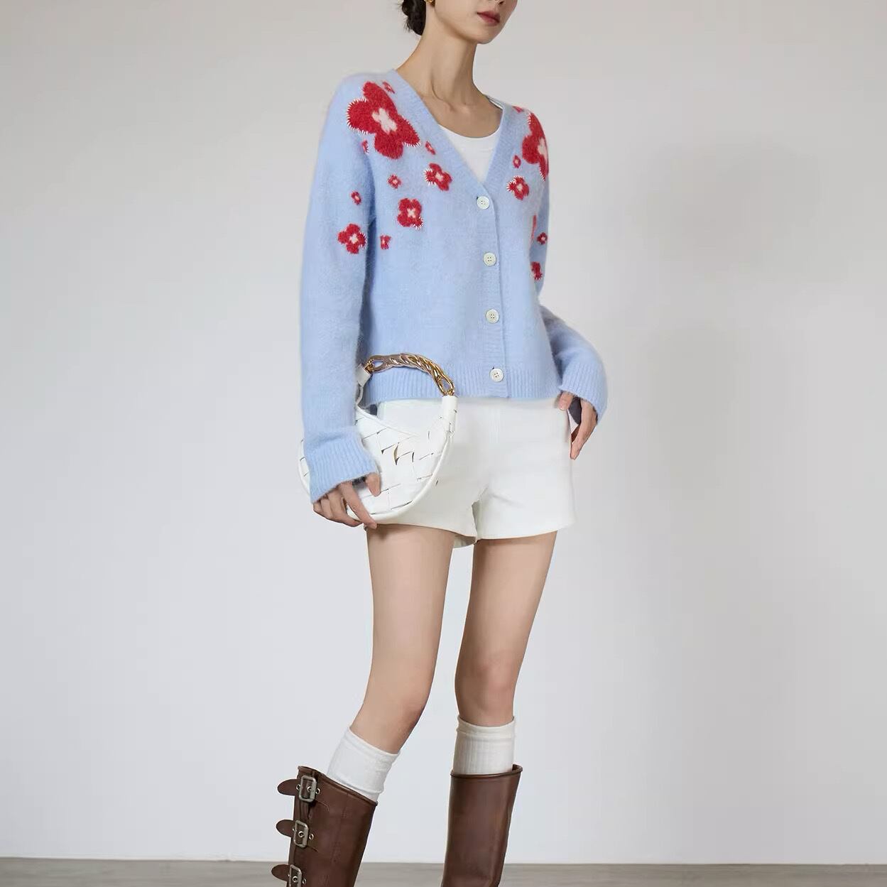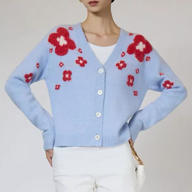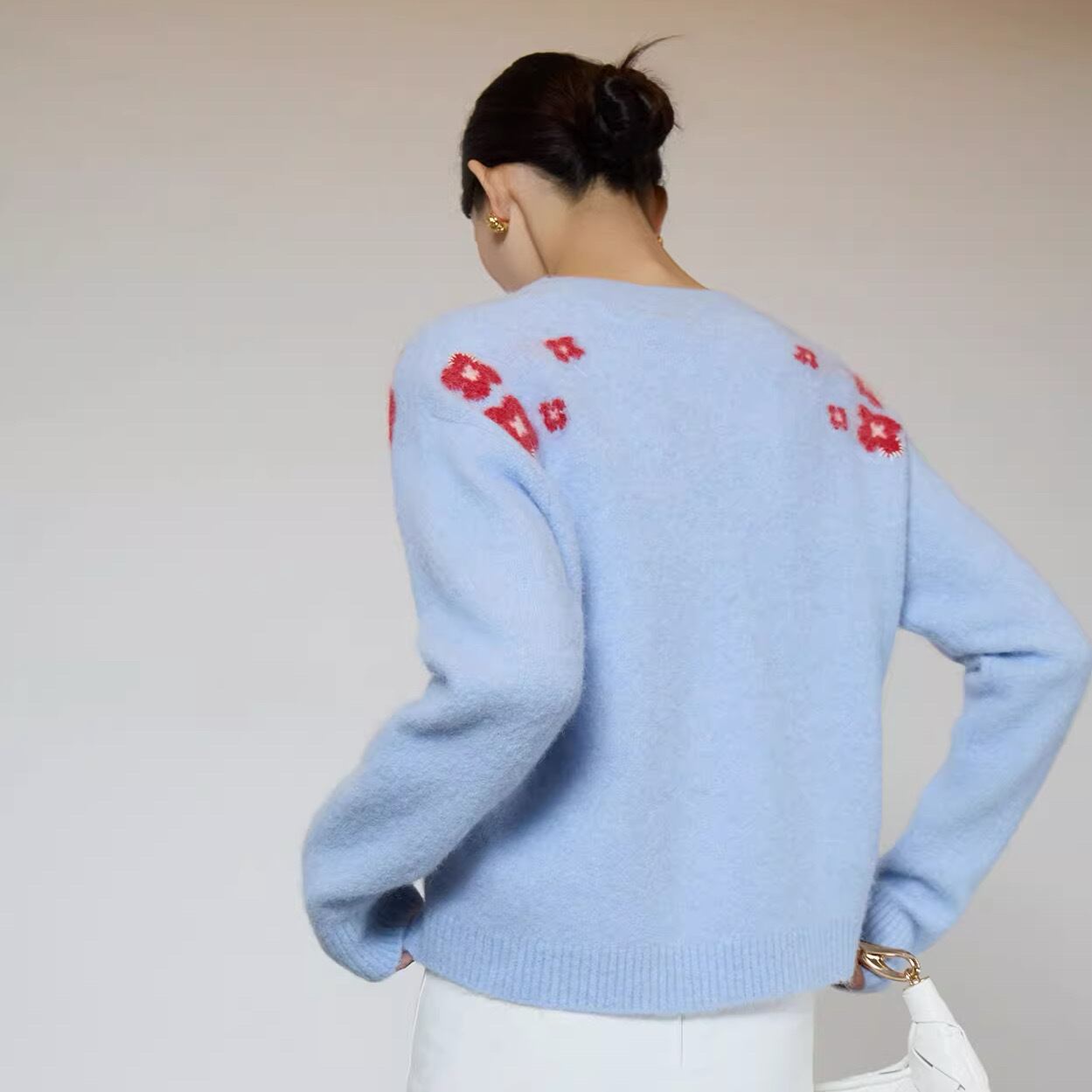 爽やかなスカイブルーのニットに、立体的なレッドのフラワー刺繍を贅沢にあしらいました。思わず目を引く華やかさで、着るだけで気分が上がる一枚です。