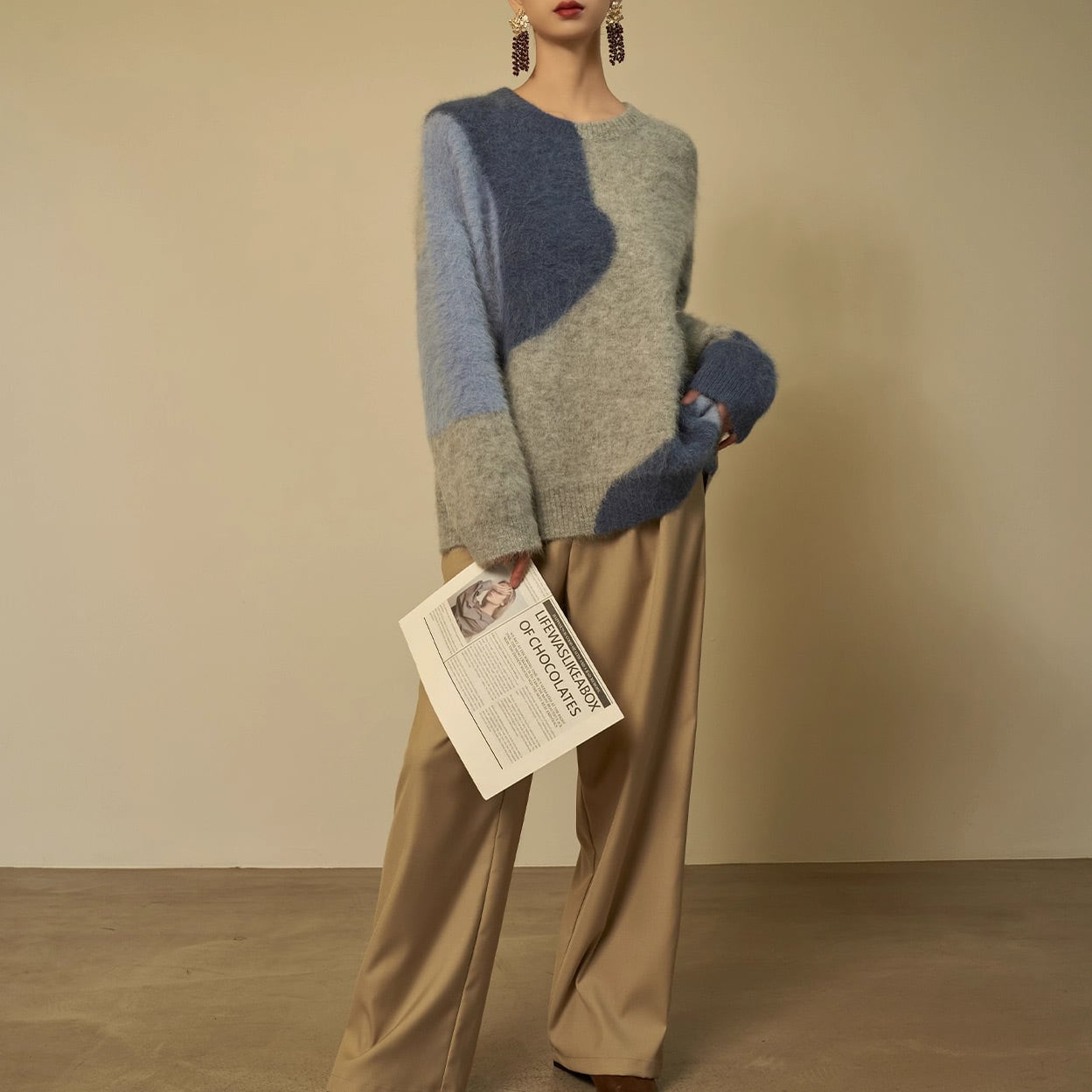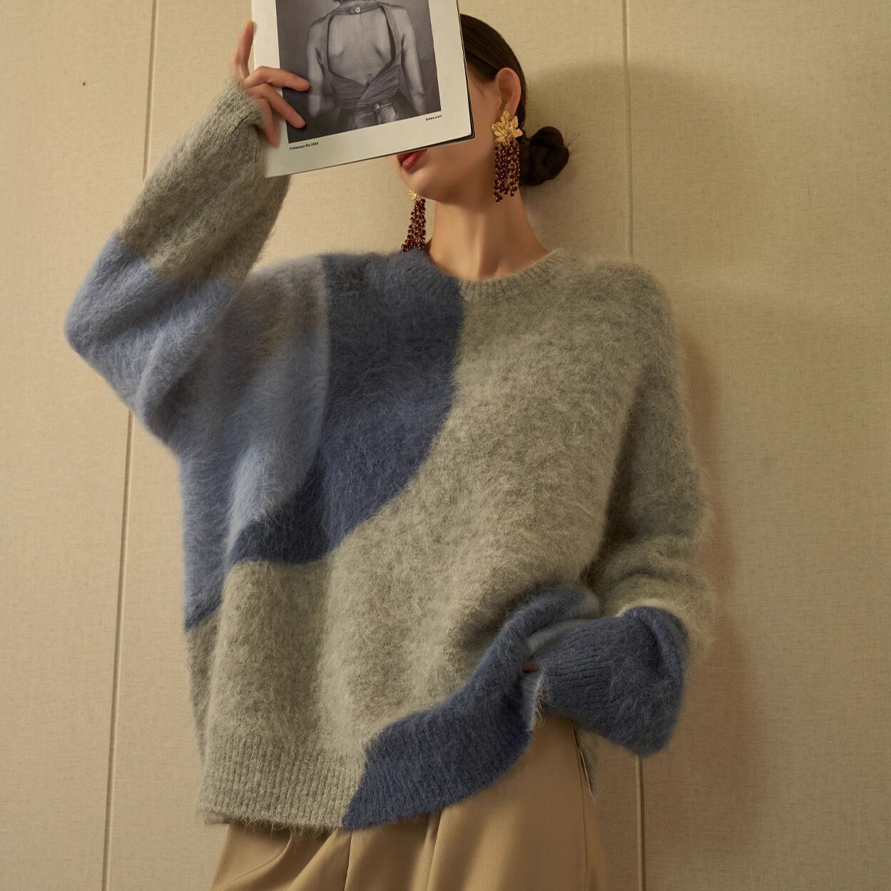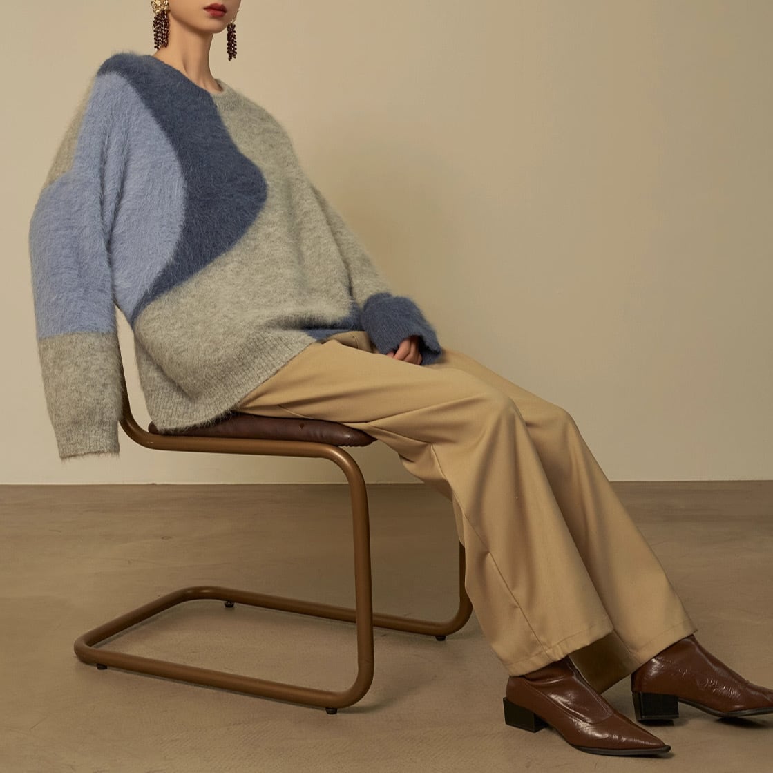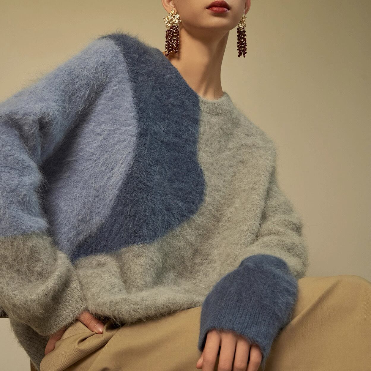 グレーとブルーの絶妙なカラーコンビネーションが魅力的なシャギーニットプルオーバーです。グレーをベースに、ニュアンスカラーのブルーをランダムな曲線で大胆に切り替えた、モダンなデザインが特徴です。ゆったりとしたオーバーサイズシルエットと柔らかな素材で、リラックス感のある着心地。シンプルなボトムスに合わせるだけで、おしゃれ上級者の着こなしが完成します。