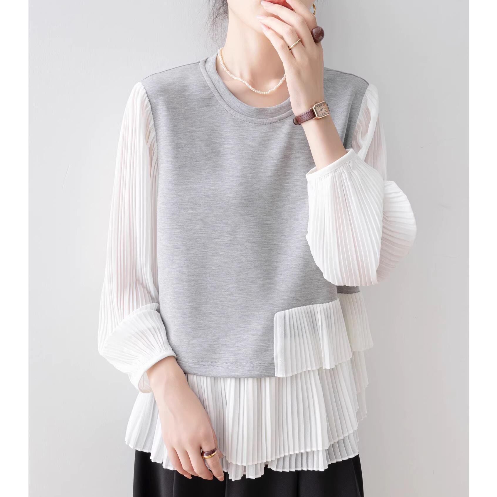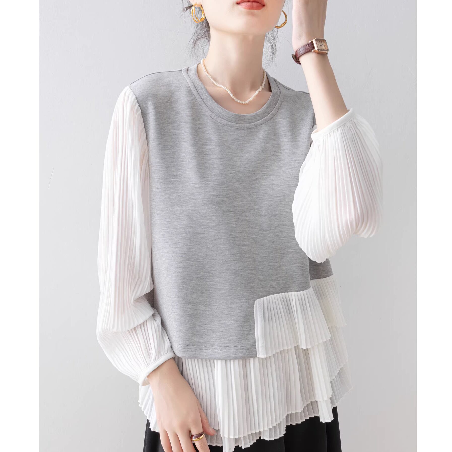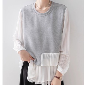 スウェット素材のボディに、プリーツ加工されたシフォン素材の袖と裾を組み合わせた、一枚でおしゃれなレイヤードスタイルが完成するトップスです。