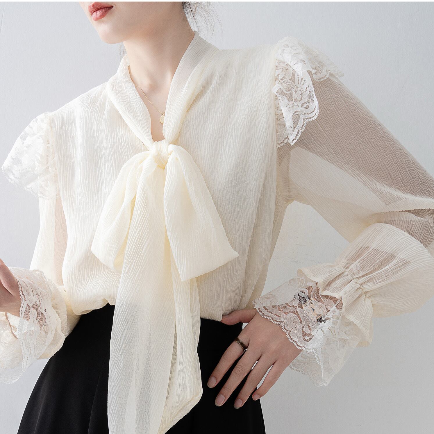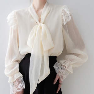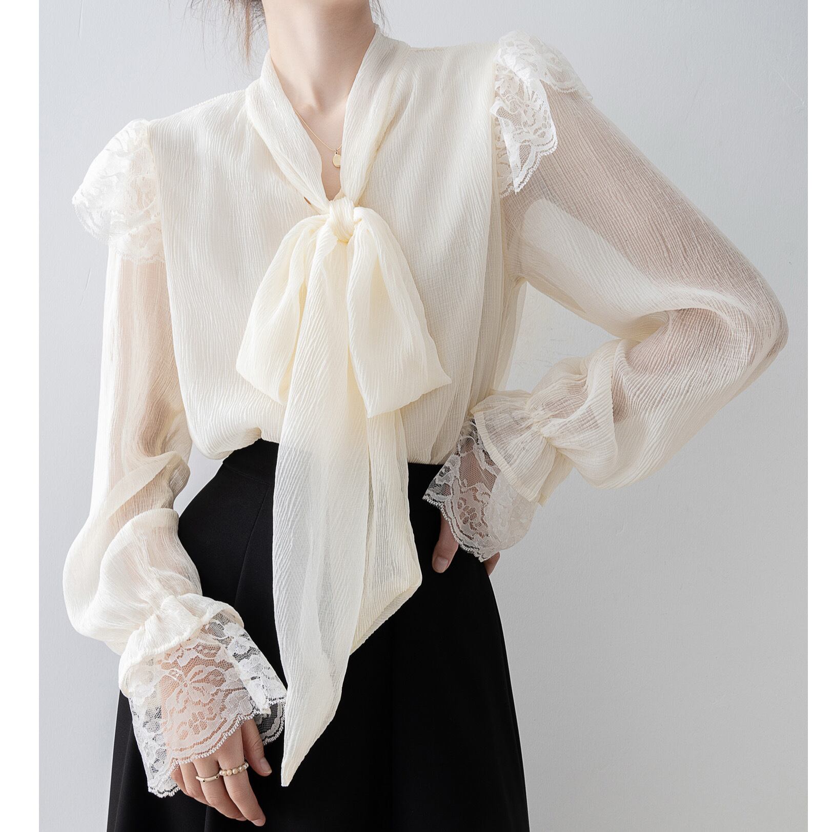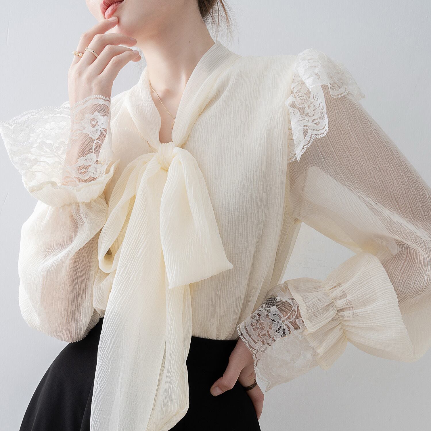 洗練されたボウタイデザインとエレガントなレース切り替えが特徴のシアーブラウスです。透け感のある素材は、軽やかでありながら華やかな印象を与え、カジュアルからきれいめスタイルまで幅広く活躍します。首元の大きなボウタイは、リボン結びやネクタイ風などアレンジ自在で、顔周りを華やかに演出します。袖にはシアー素材を使い、肩や袖口にはレースやフリルカフスを施すなど、細部まで女性らしさにこだわったデザイン。