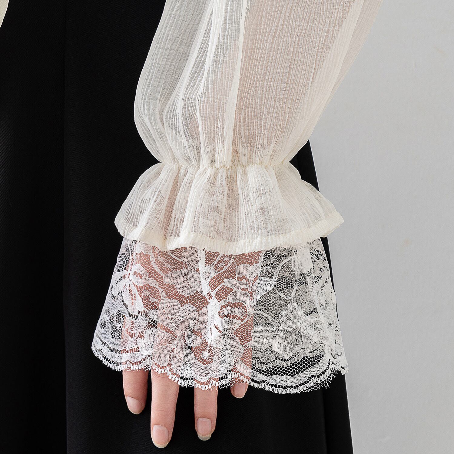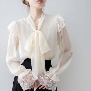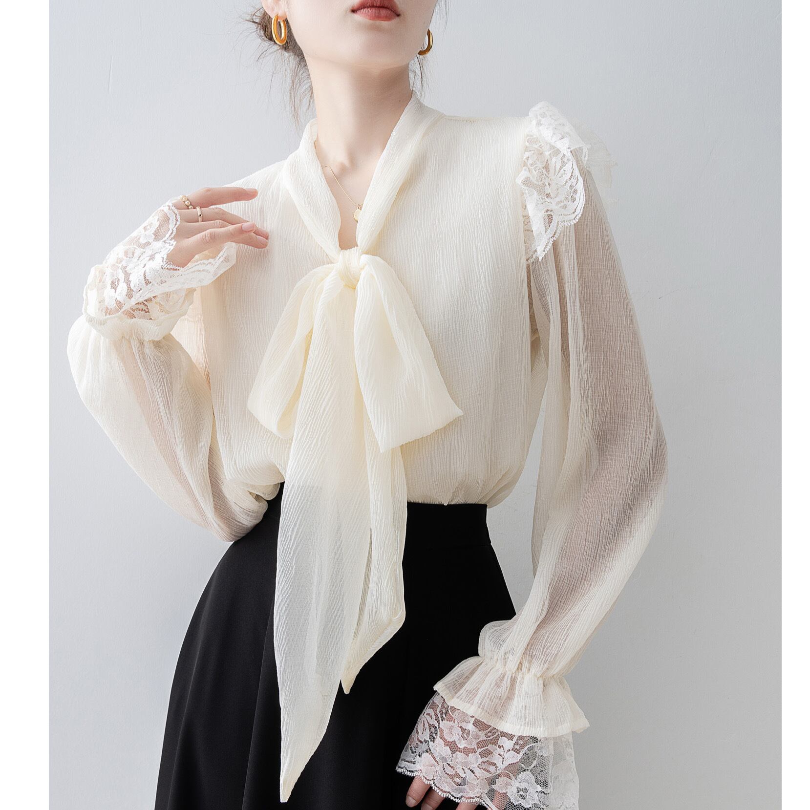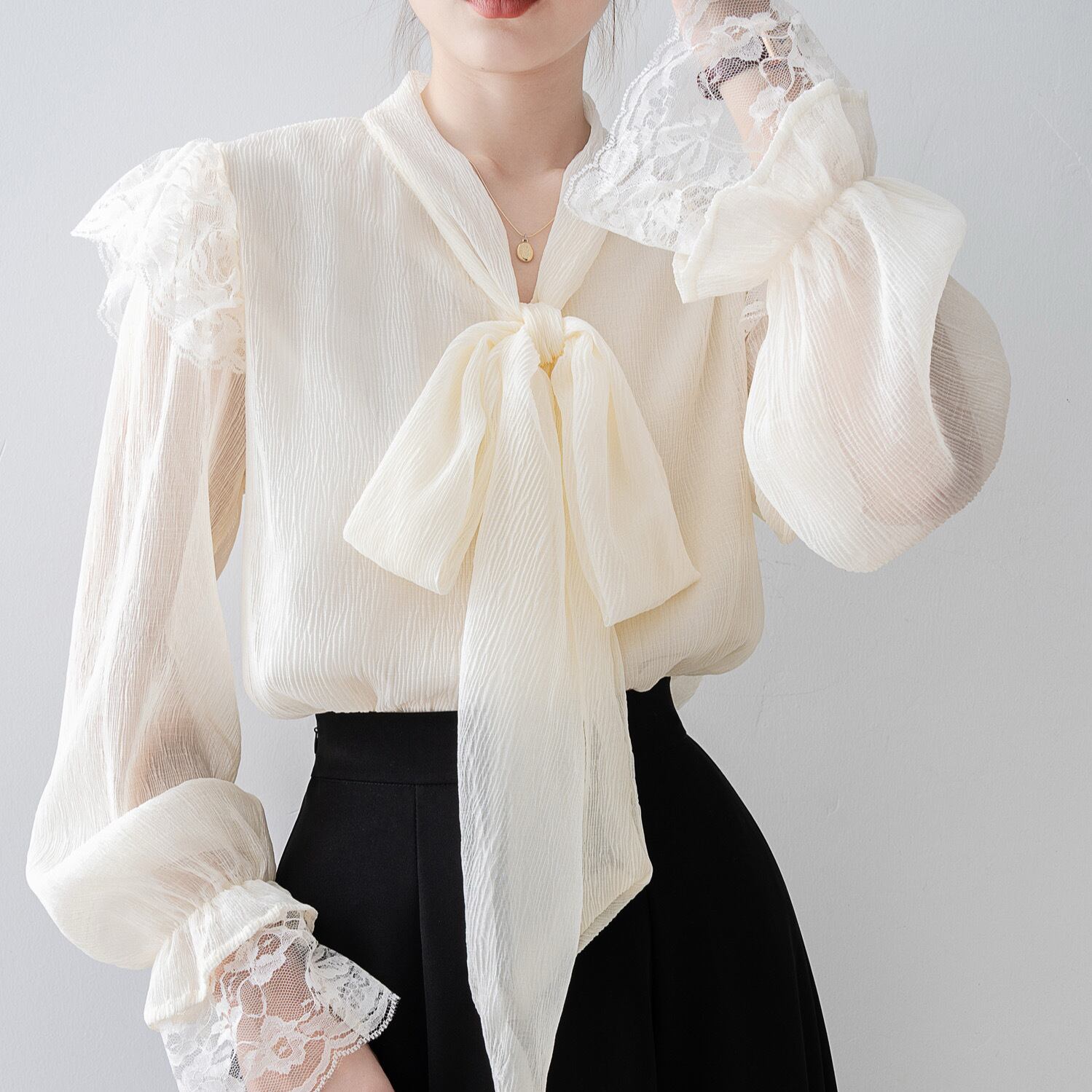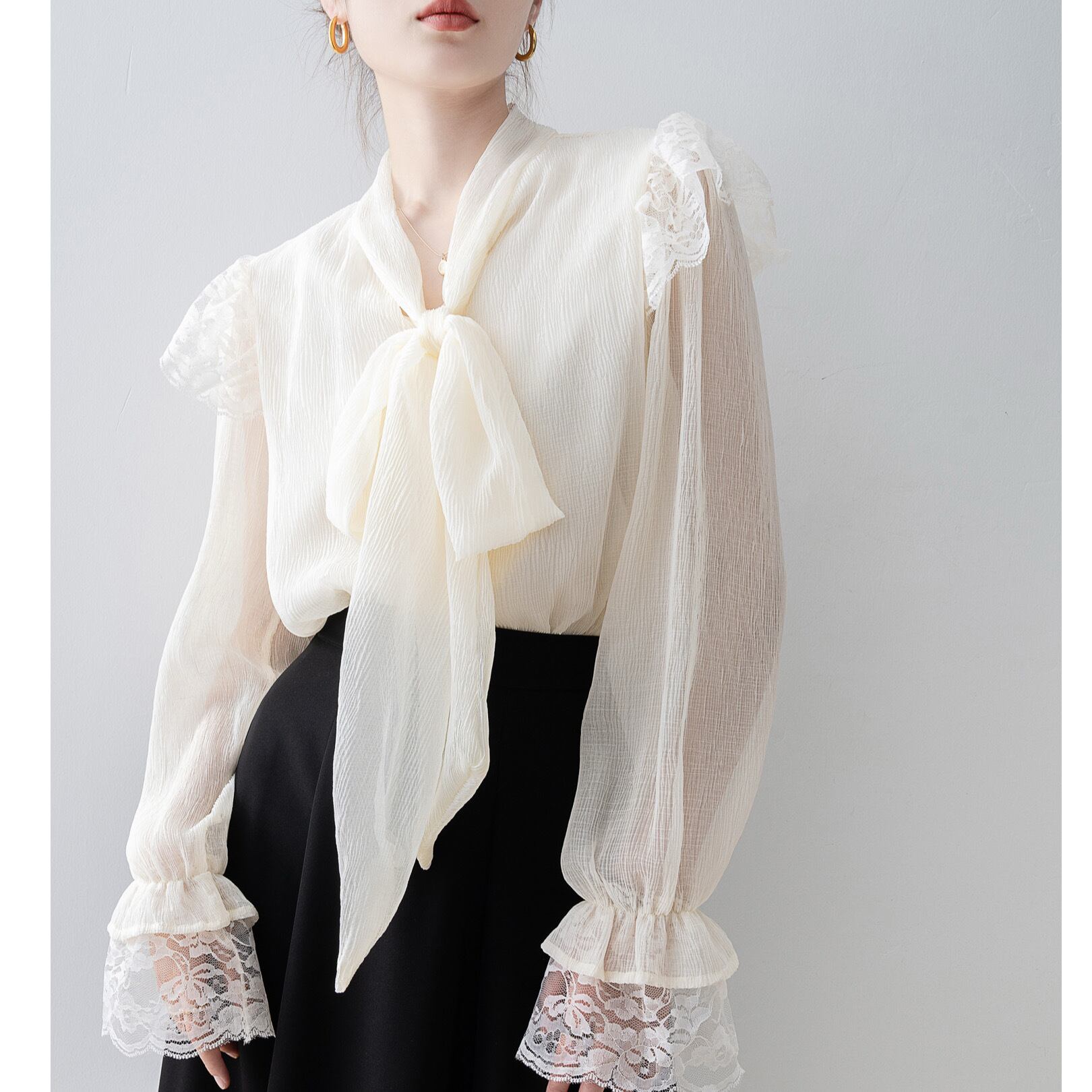 洗練されたボウタイデザインとエレガントなレース切り替えが特徴のシアーブラウスです。透け感のある素材は、軽やかでありながら華やかな印象を与え、カジュアルからきれいめスタイルまで幅広く活躍します。首元の大きなボウタイは、リボン結びやネクタイ風などアレンジ自在で、顔周りを華やかに演出します。袖にはシアー素材を使い、肩や袖口にはレースやフリルカフスを施すなど、細部まで女性らしさにこだわったデザイン。