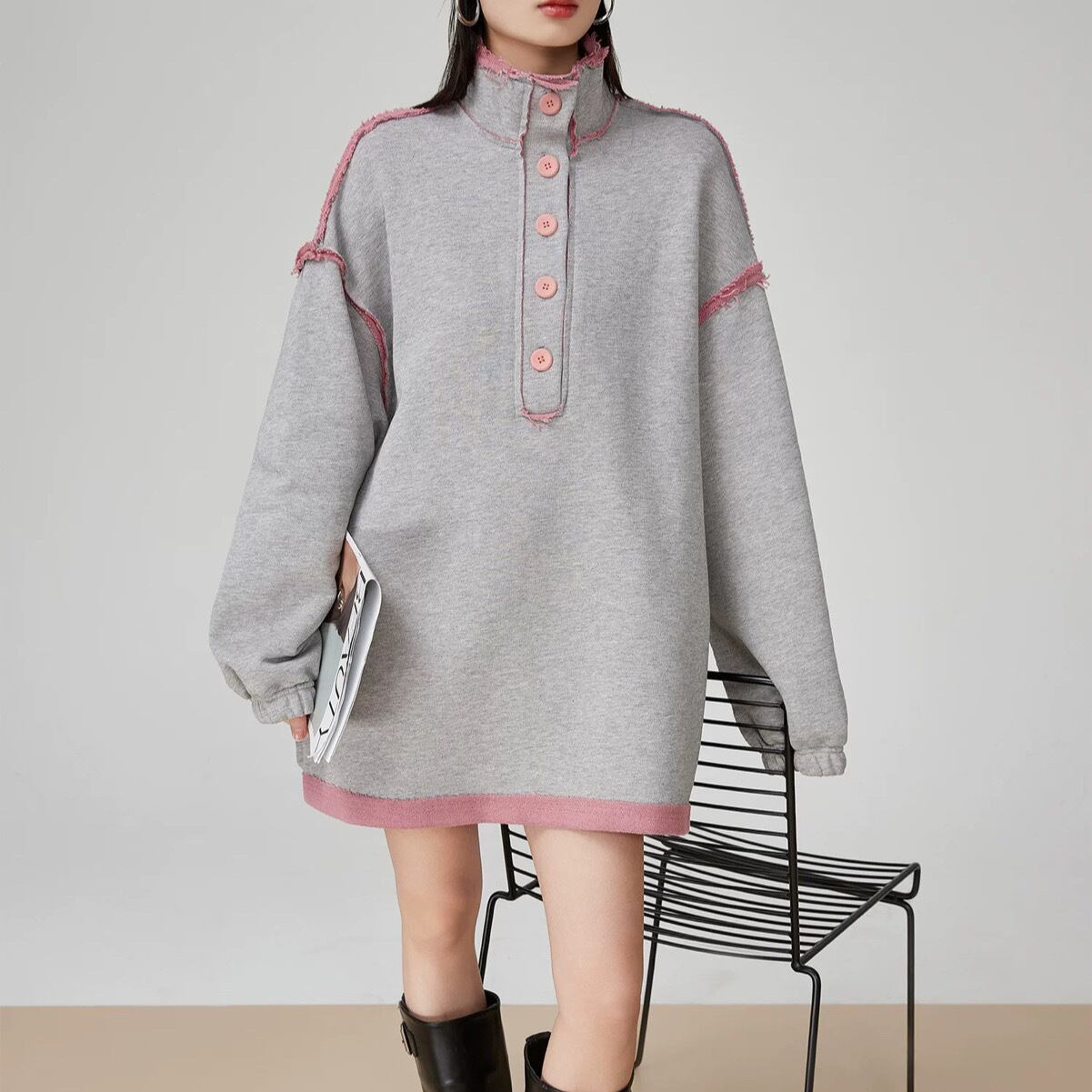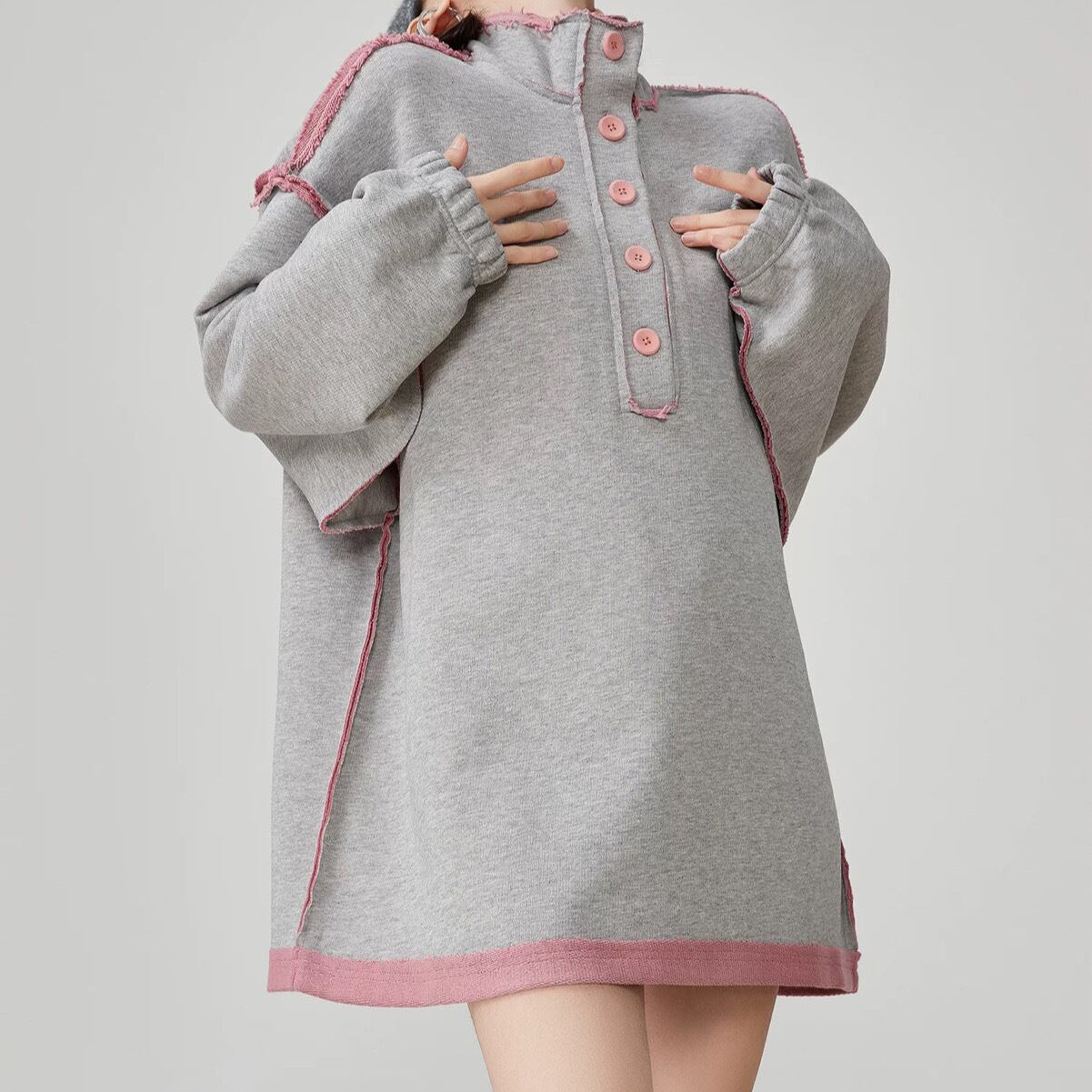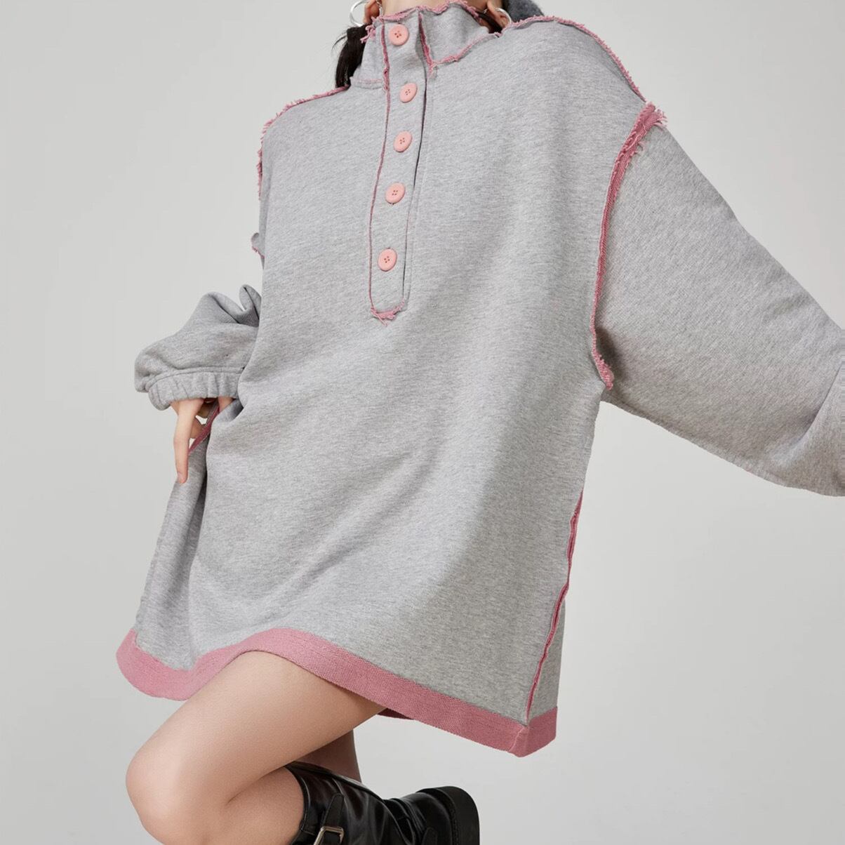 ざっくりとしたオーバーサイズ感が可愛い、ハーフボタンデザインのスウェットワンピース。縫い目部分をあえて表に出し、ピンクの配色ステッチとフリンジ加工を施すことで、個性的なアクセントを加えています。