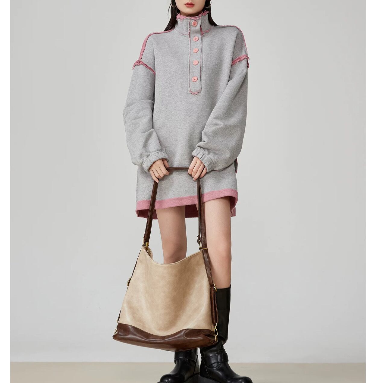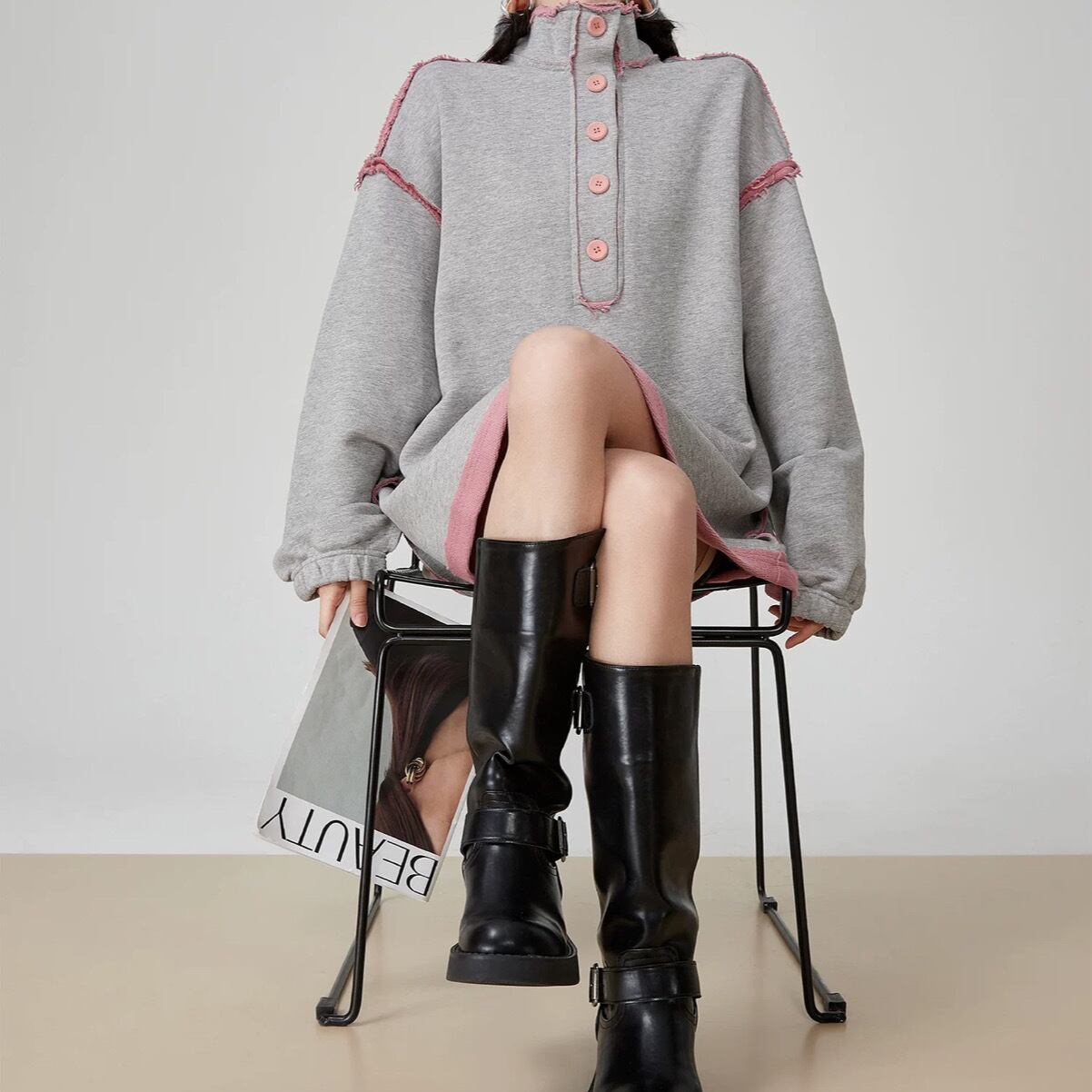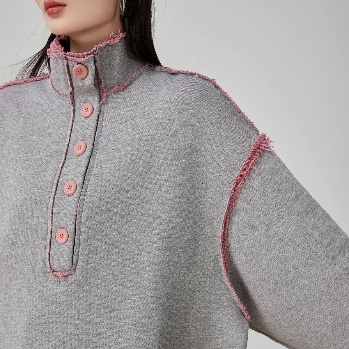 ざっくりとしたオーバーサイズ感が可愛い、ハーフボタンデザインのスウェットワンピース。縫い目部分をあえて表に出し、ピンクの配色ステッチとフリンジ加工を施すことで、個性的なアクセントを加えています。
