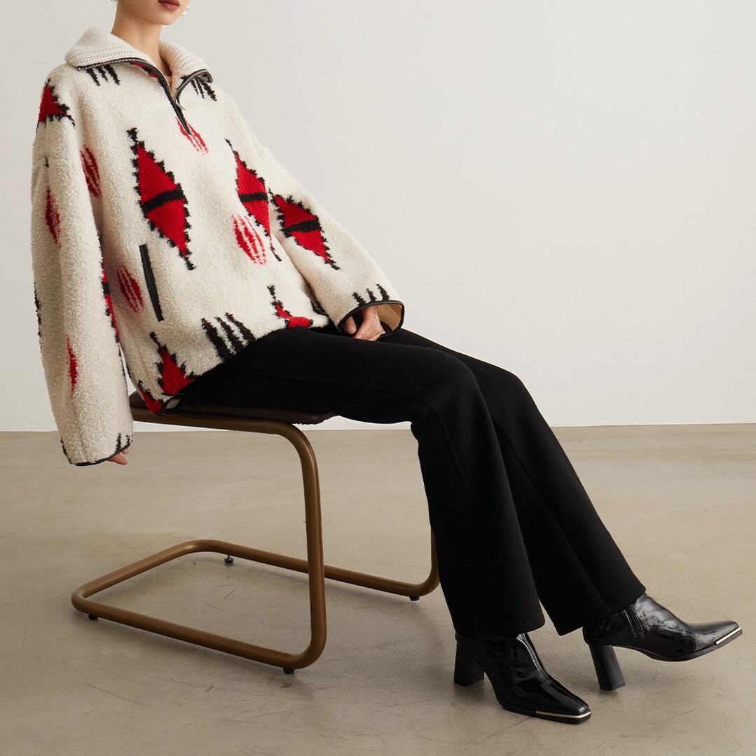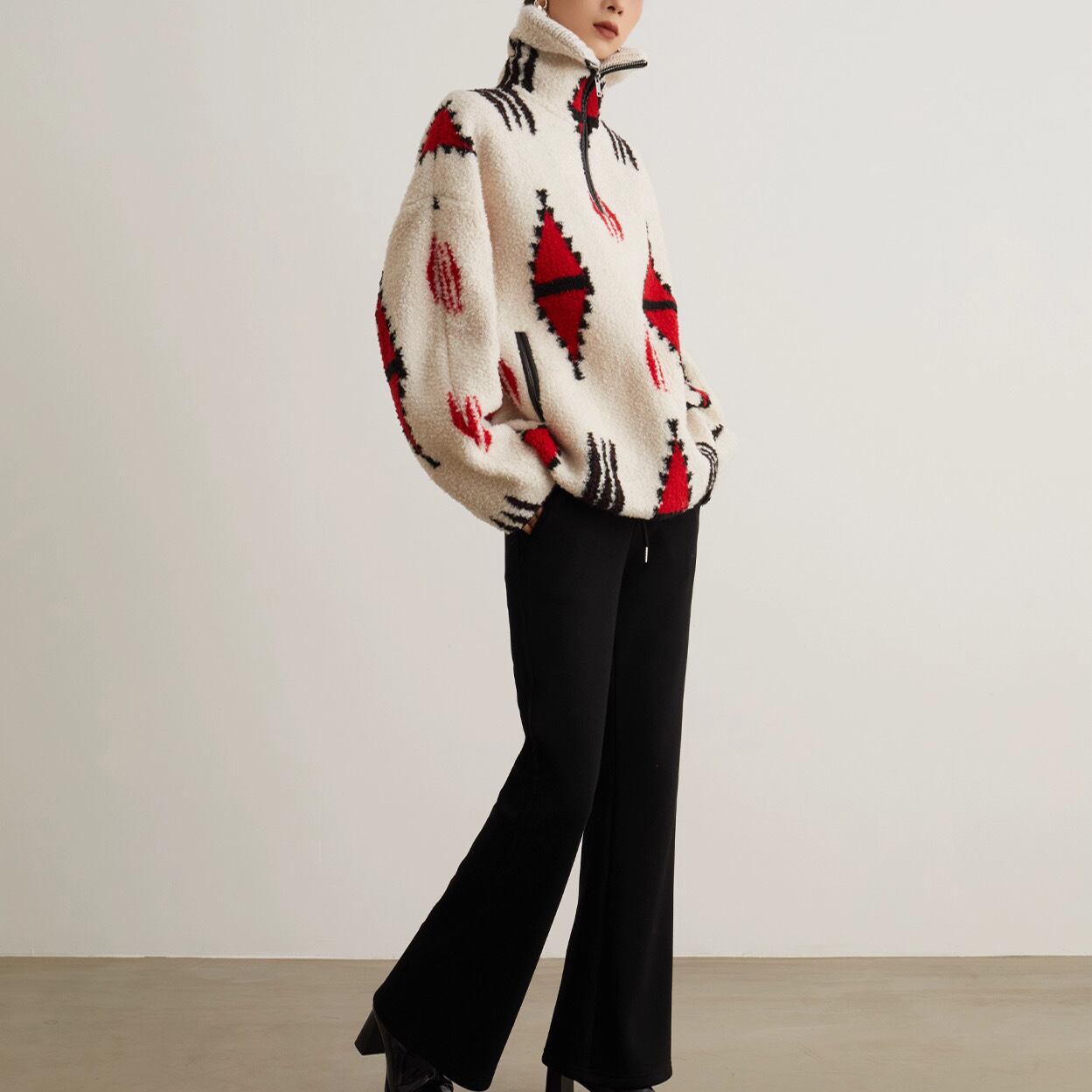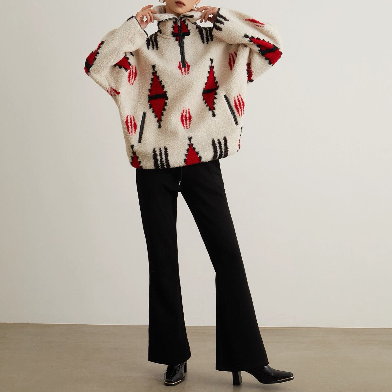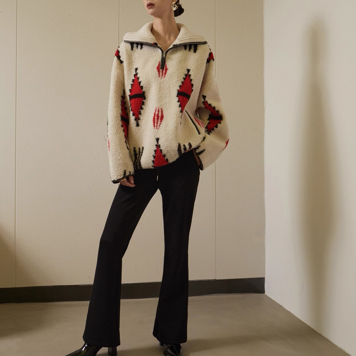 暖かく柔らかなボア素材に、赤と黒を効かせた幾何学的な民族調柄をあしらいました。カジュアルなアイテムながらも、目を引く大胆な柄で着こなしの主役になるデザインです。