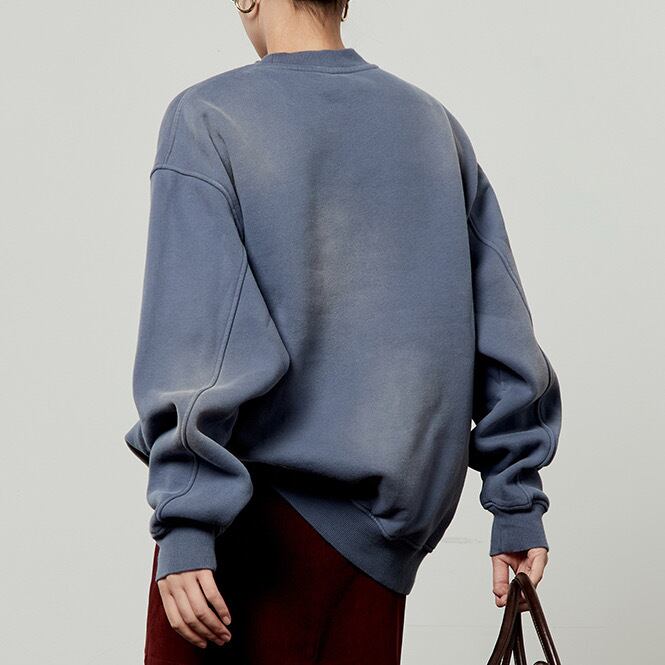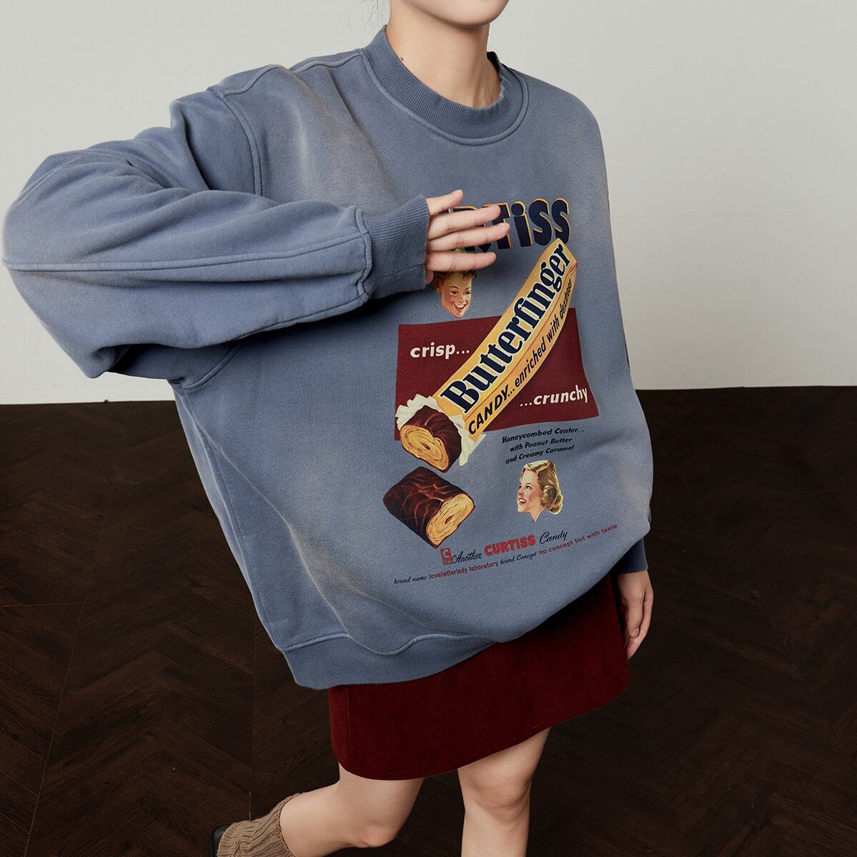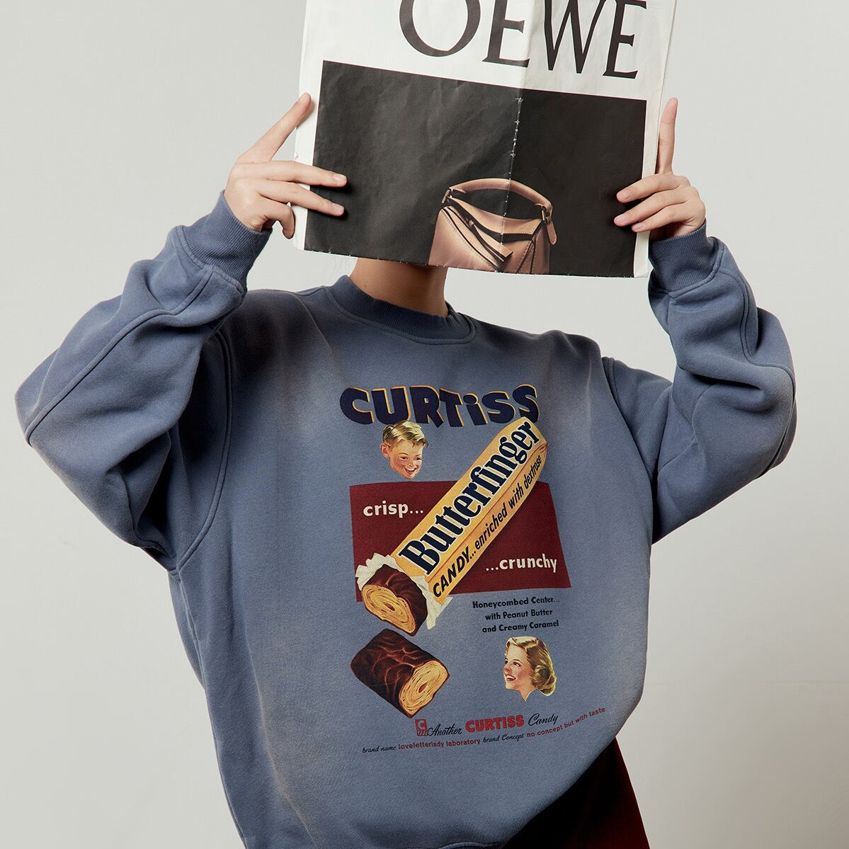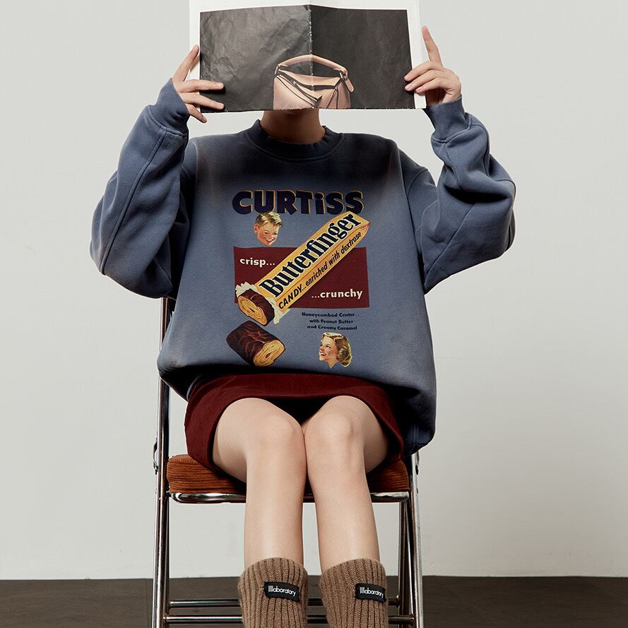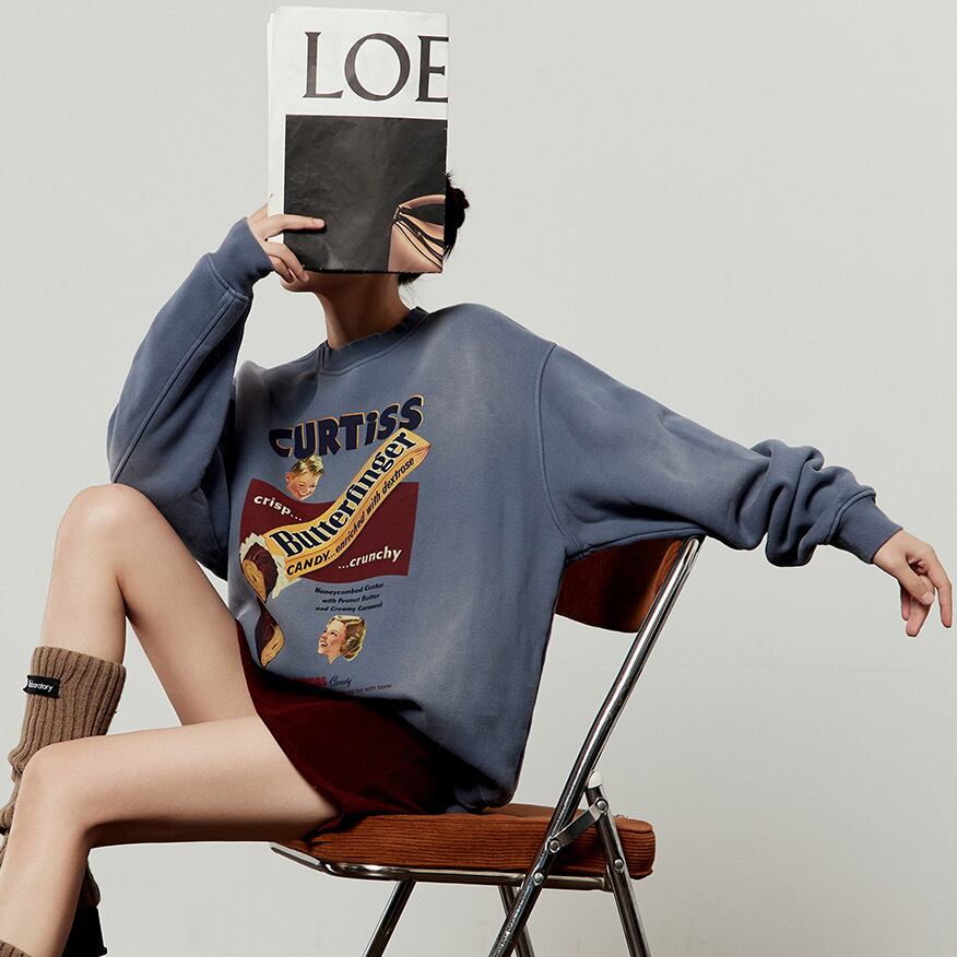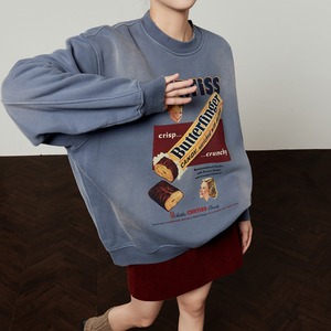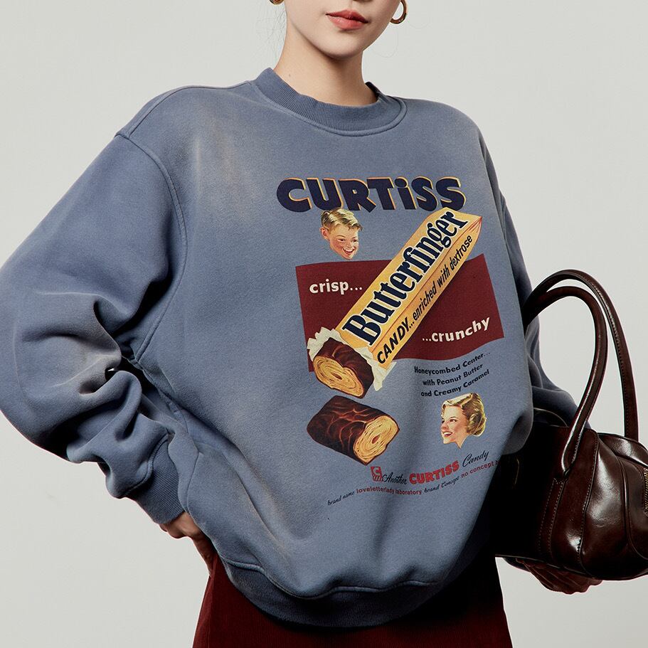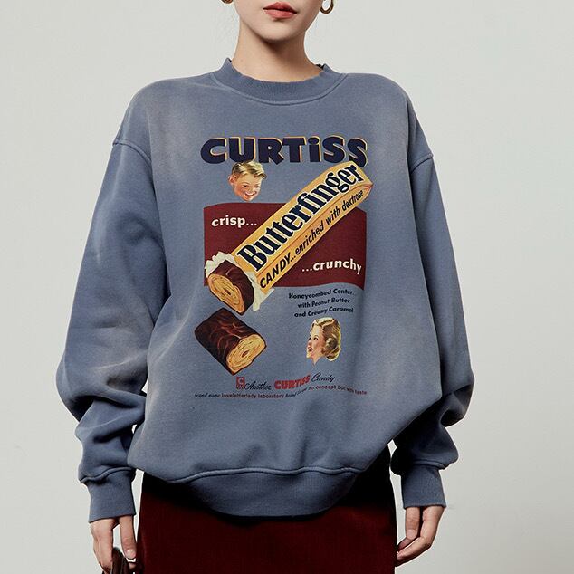 ヴィンテージの広告のようなレトロなキャンディプリントが目を引く、オーバーサイズのスウェットシャツです。洗いざらしのような風合いと、色褪せたようなブルーが、古着のようなこなれた雰囲気を演出します。