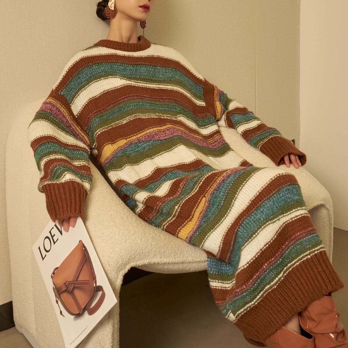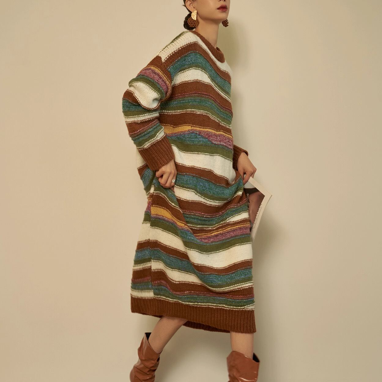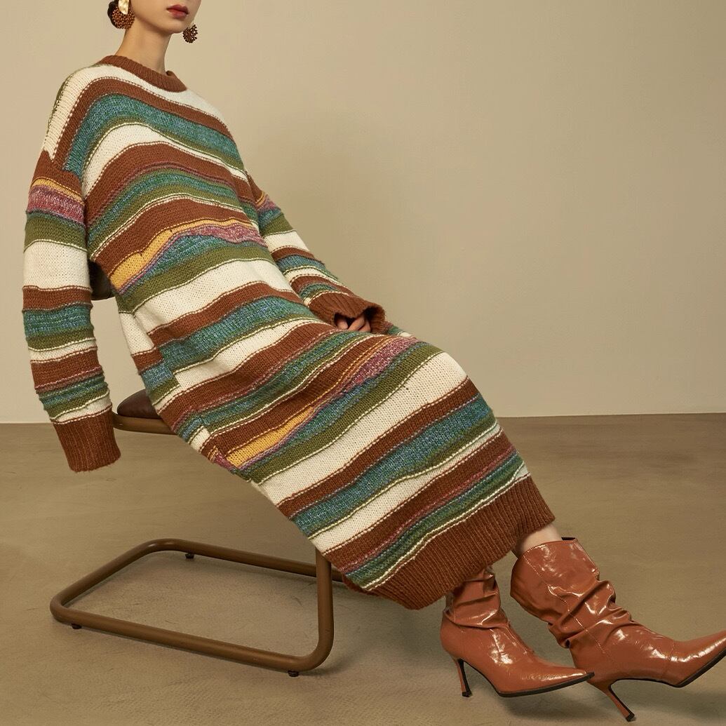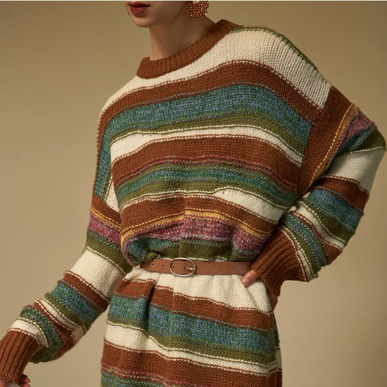 ブラウン、グリーン、ホワイト、テラコッタなど、暖色系を基調としたレトロなマルチカラーストライプが目を引くニットワンピースです。ふっくらとした肉厚なニット素材は、暖かさも着心地の良さも抜群。