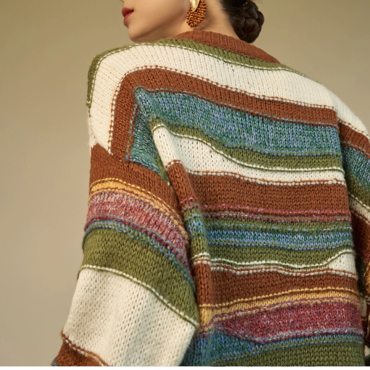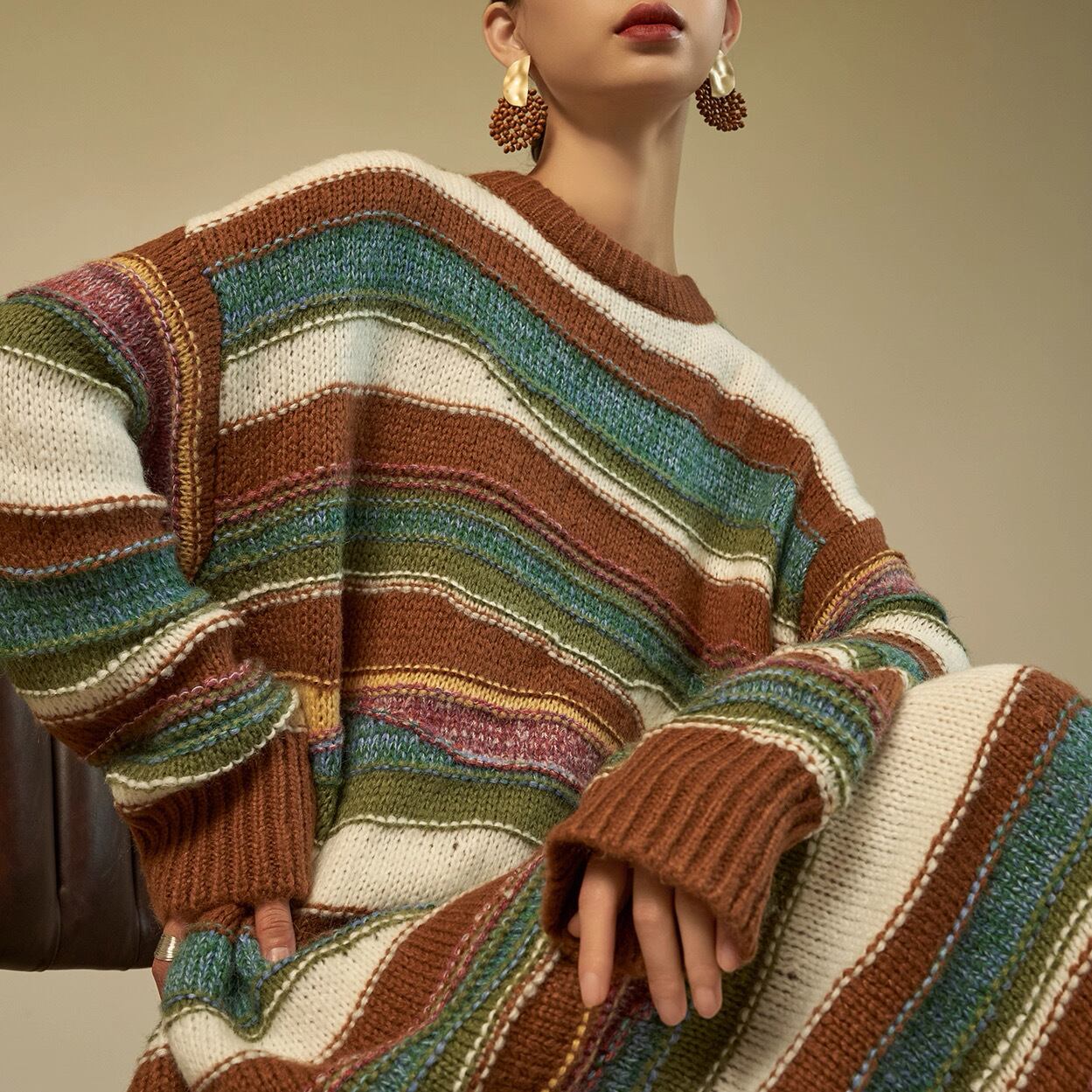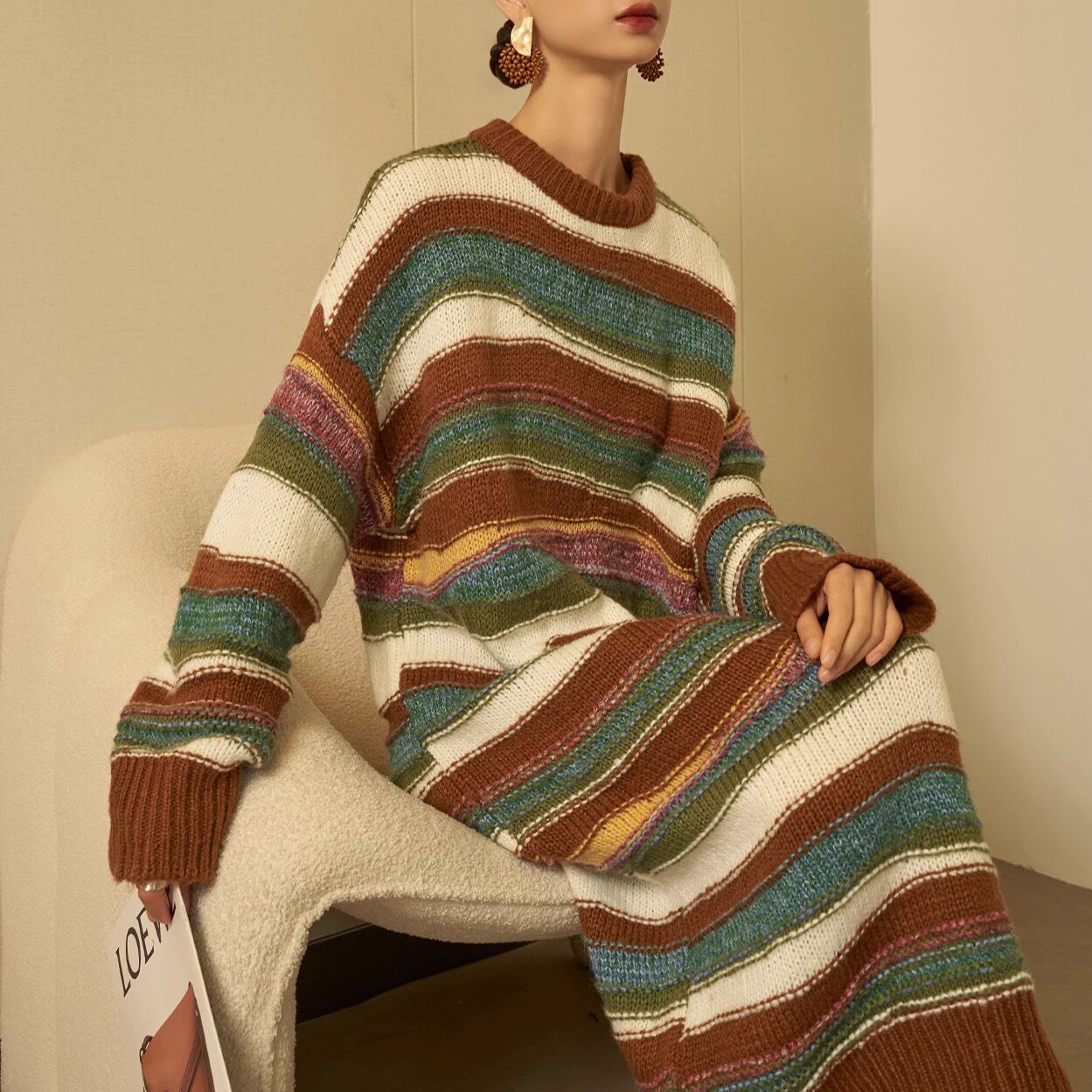 ブラウン、グリーン、ホワイト、テラコッタなど、暖色系を基調としたレトロなマルチカラーストライプが目を引くニットワンピースです。ふっくらとした肉厚なニット素材は、暖かさも着心地の良さも抜群。