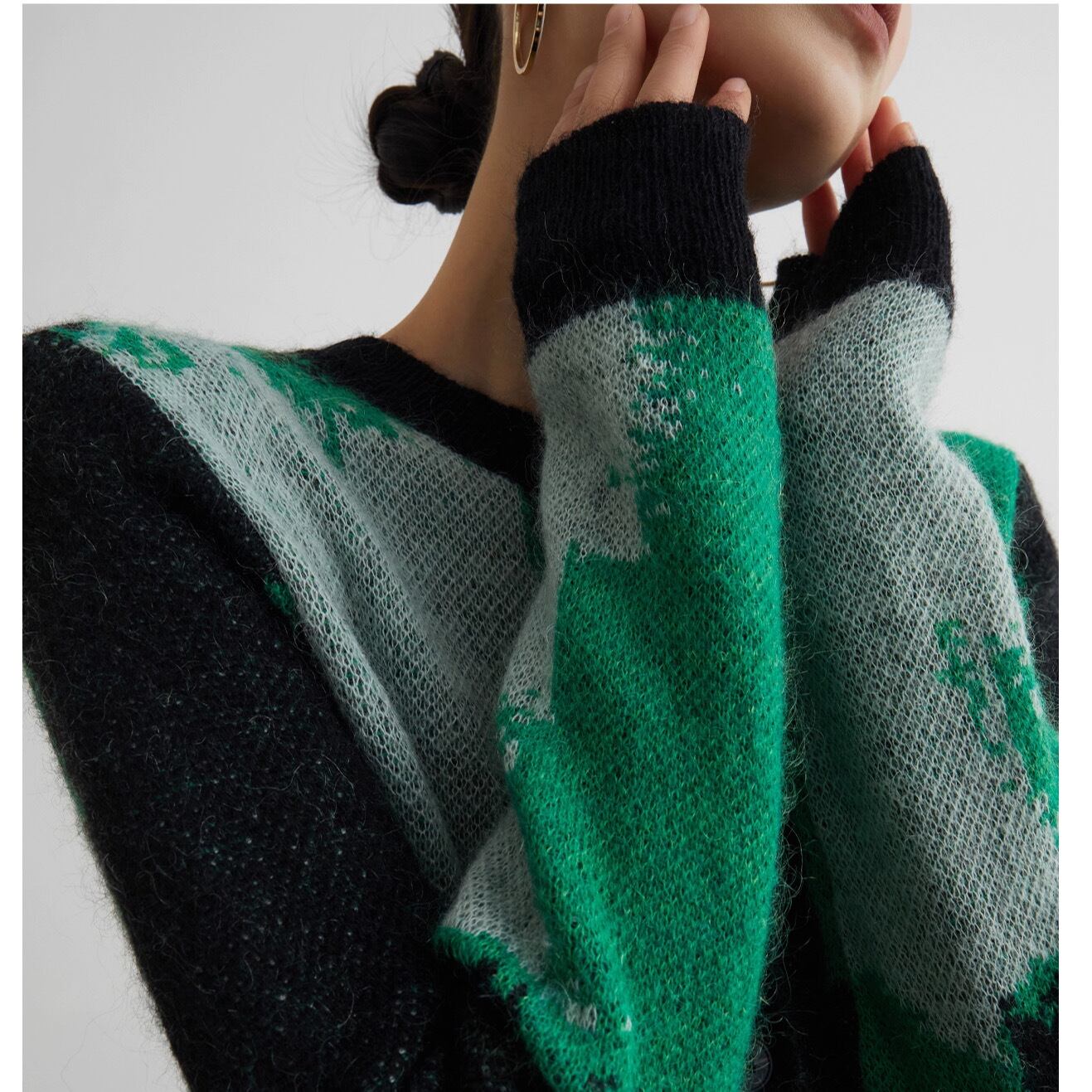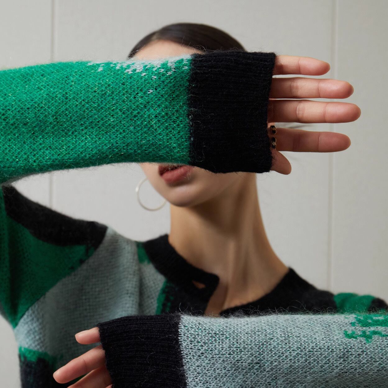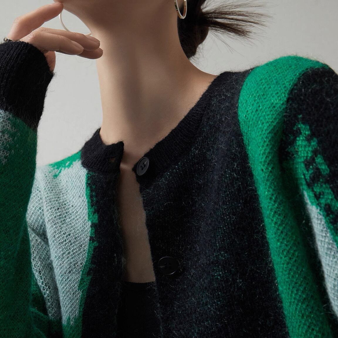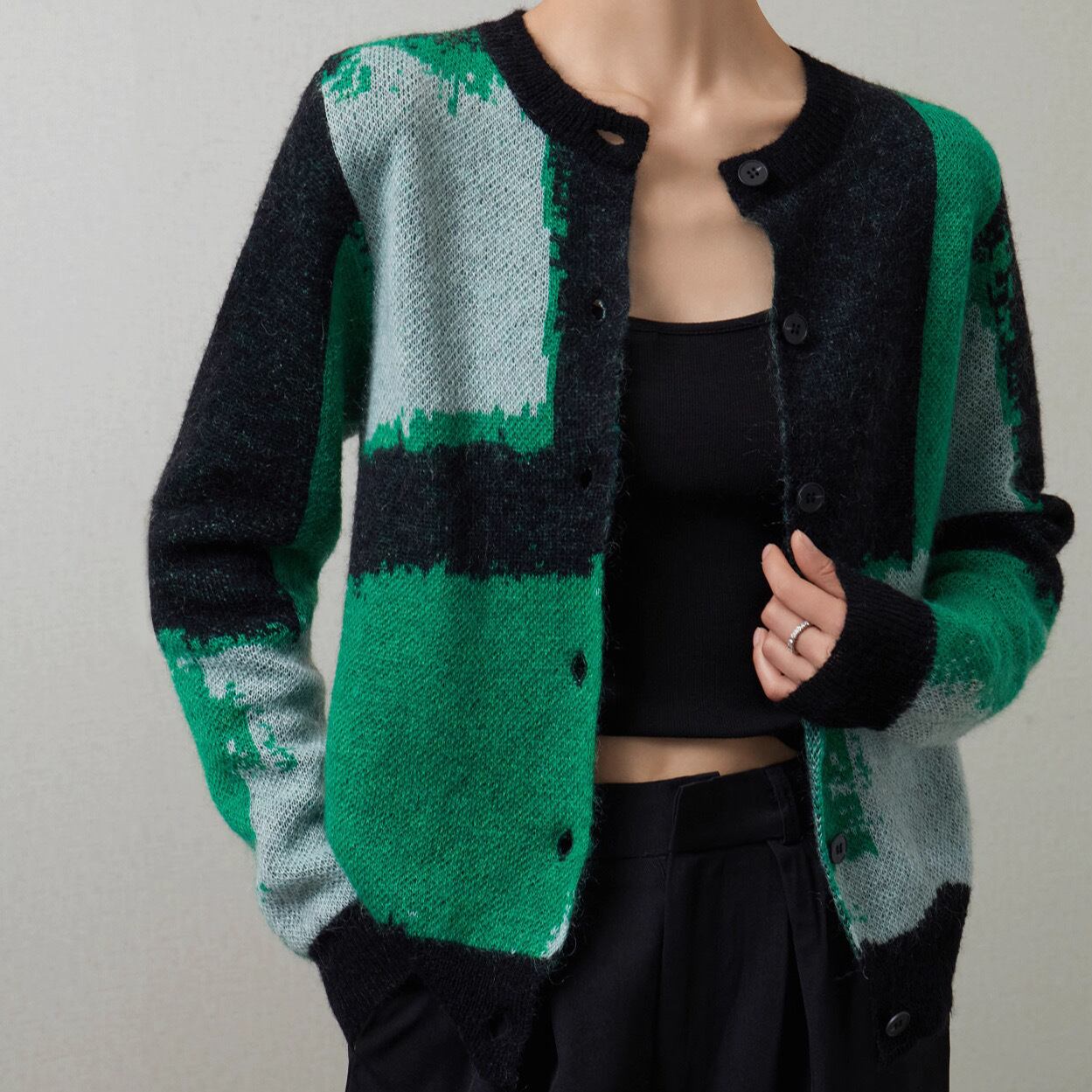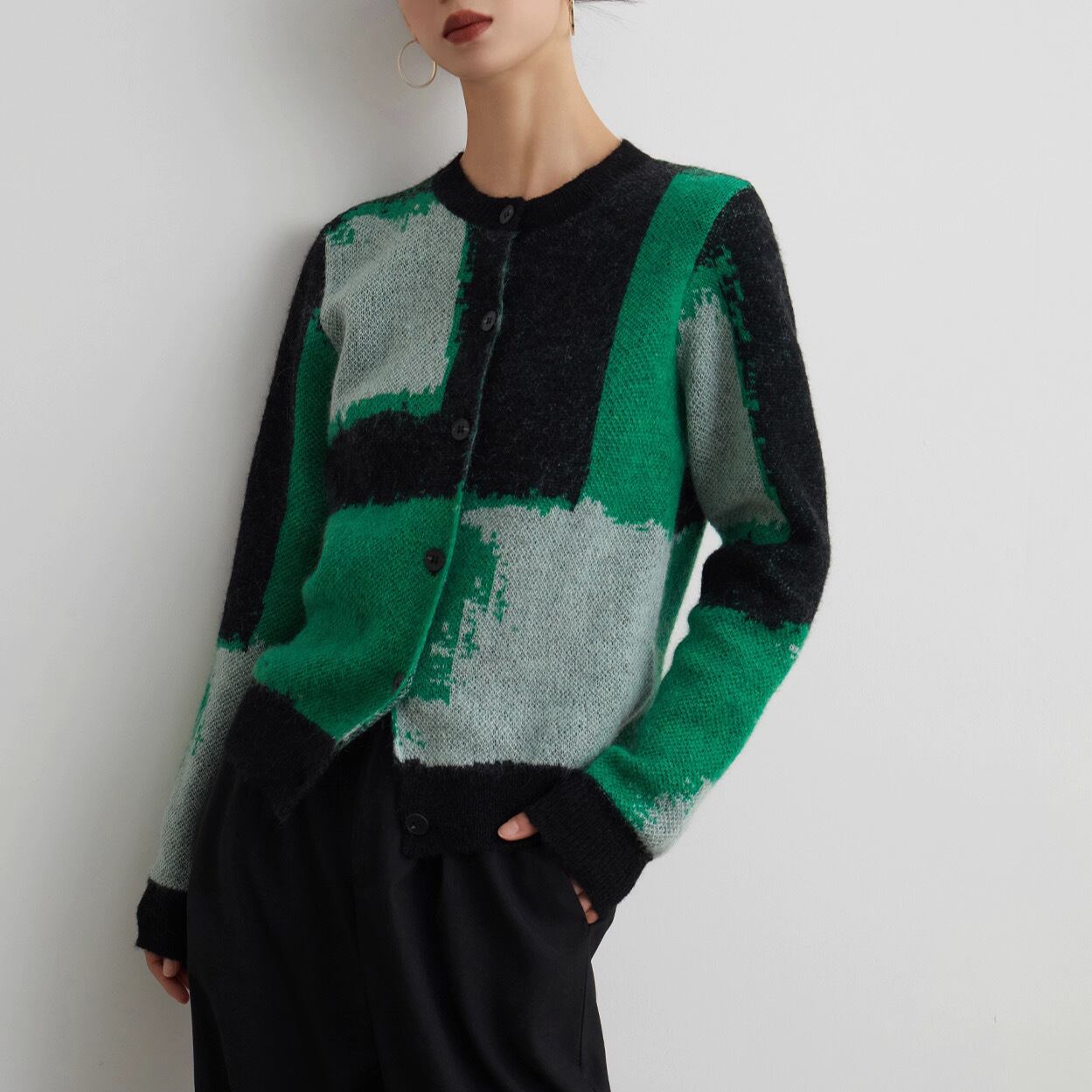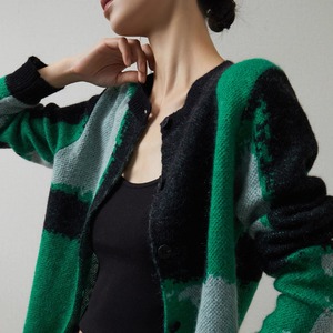 グリーン、グレーのコントラストが効いた大胆なカラーブロック柄が目を引くニットカーディガンです。まるでアート作品のようなモードな配色が、いつものコーディネートを一気にブラッシュアップしてくれます。